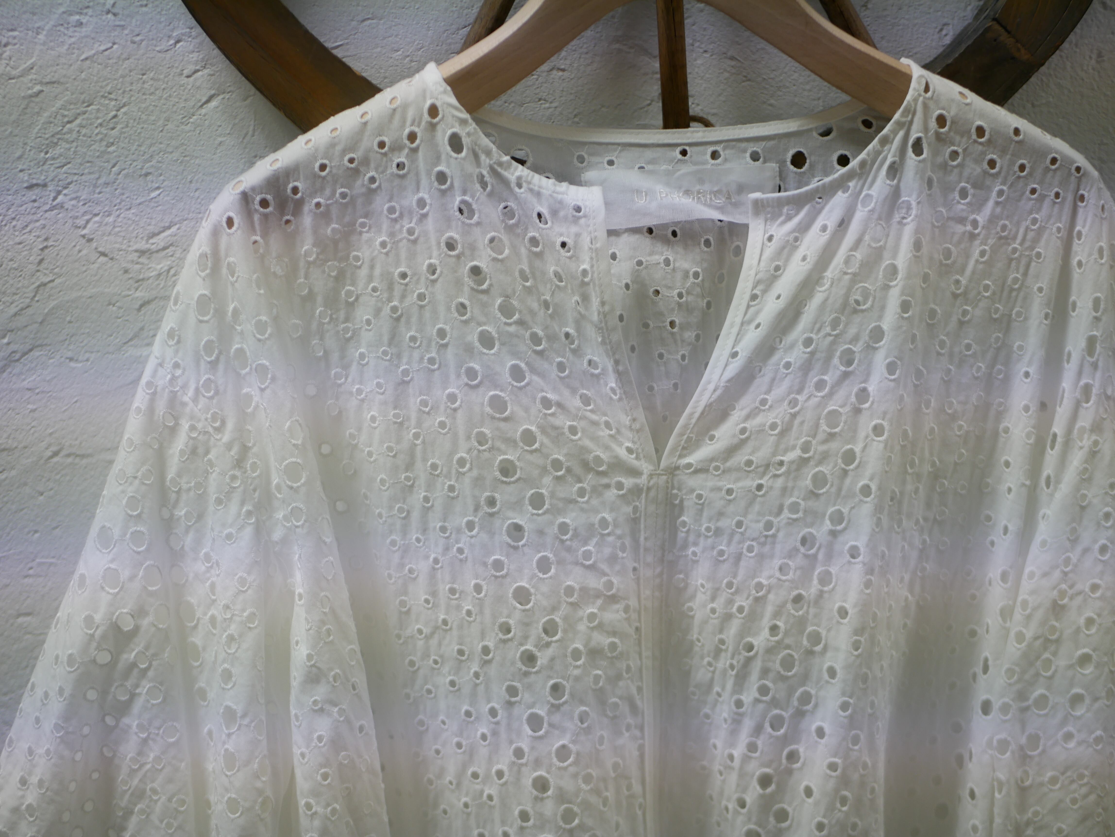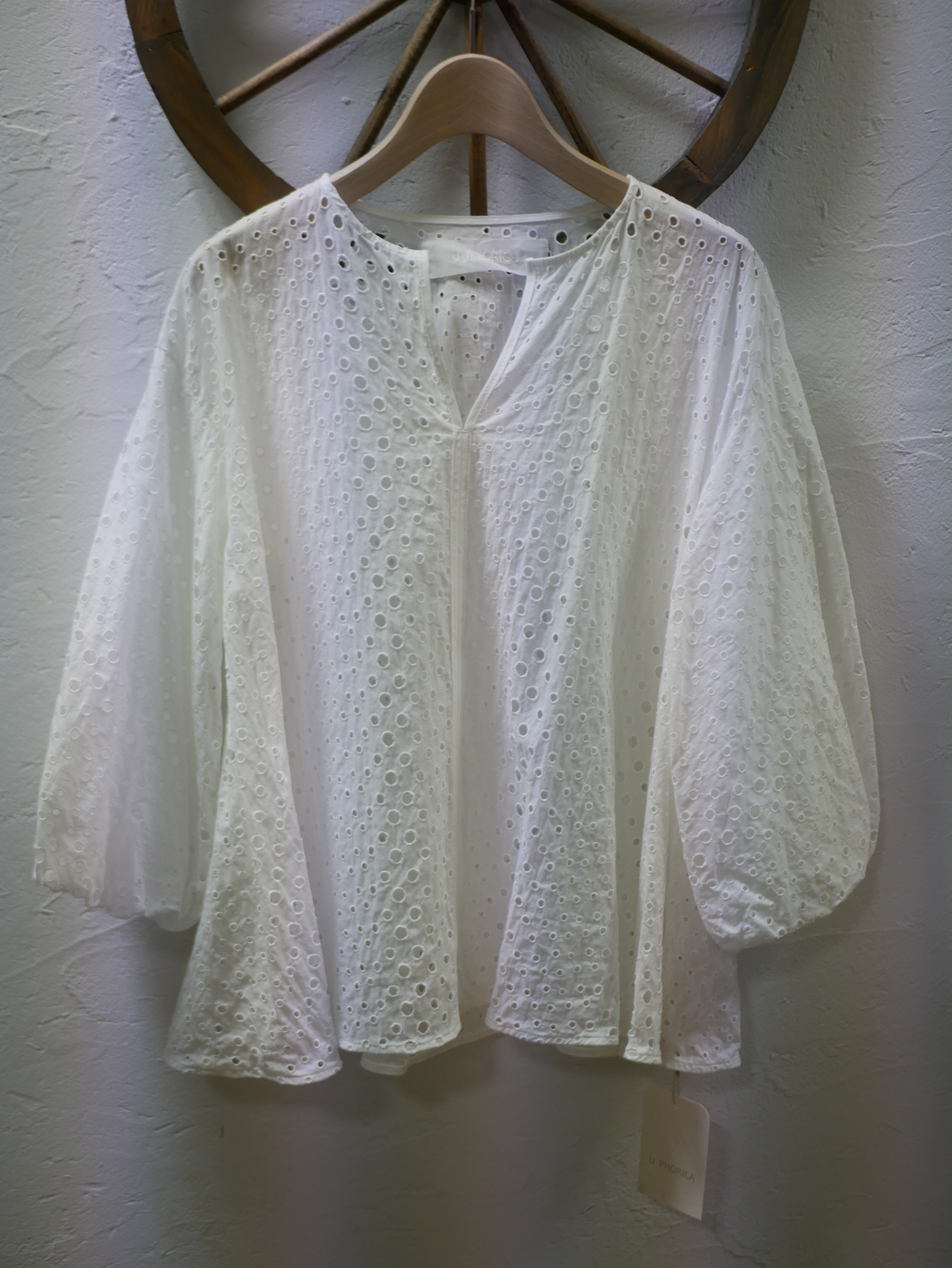 お袖に膨らみのあるAラインブラウス。色んな円の大きさでカットされたレースです。軽やかで女性らしい1枚です。