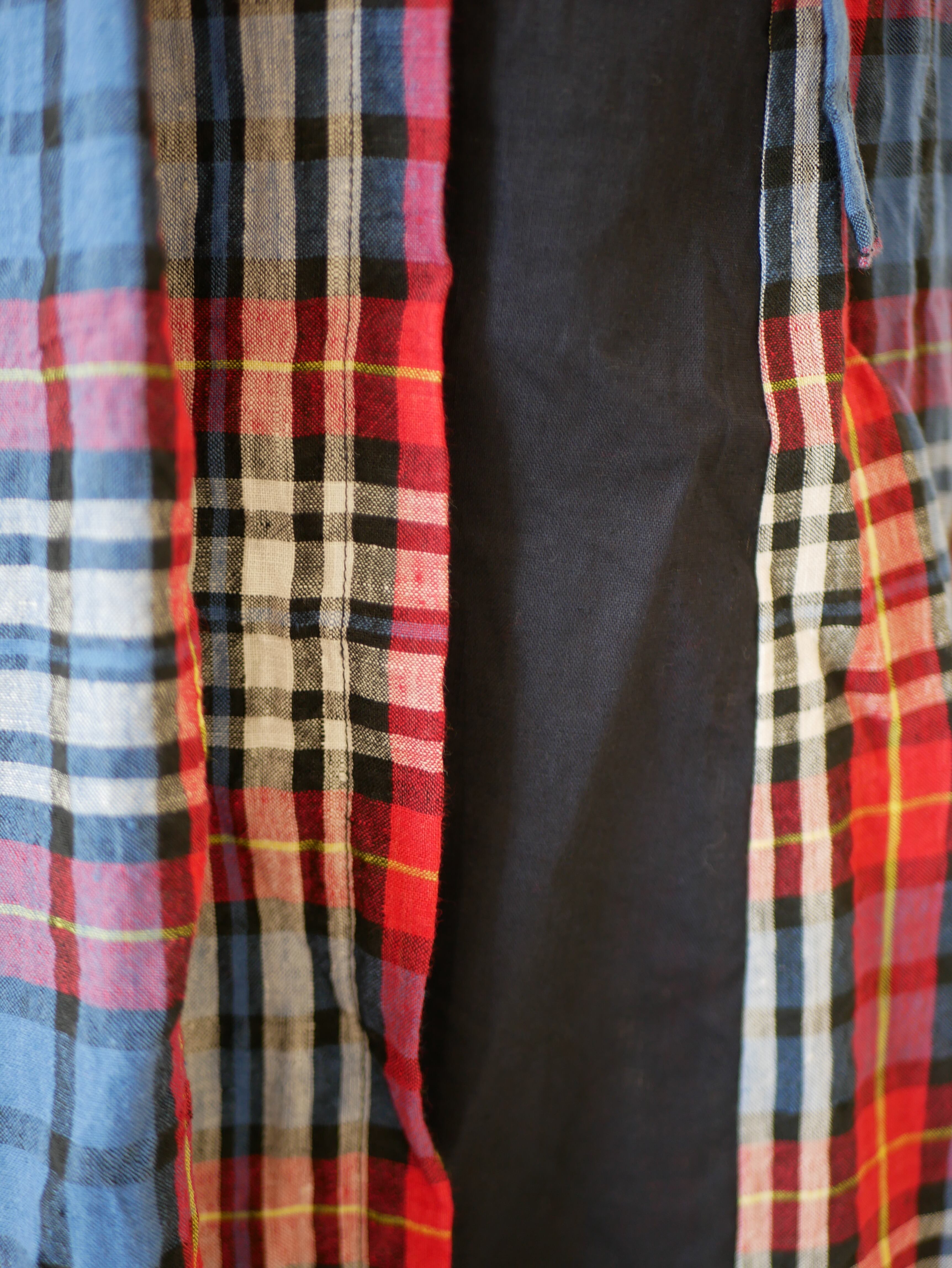 鮮やかな先染めのスカート。内側は無地になり、チラッと覗きます。かちっとし過ぎず適度なきちんと感が魅力です。ポケット有り。ギャザーではなく、お腹周りは、タックでスッキリ見えるデザインです。左脇でリボン結び。スカートが、めくれないようにスカート裏にボタン一つついてます。手洗い可能。ウエスト後ろはゴム。