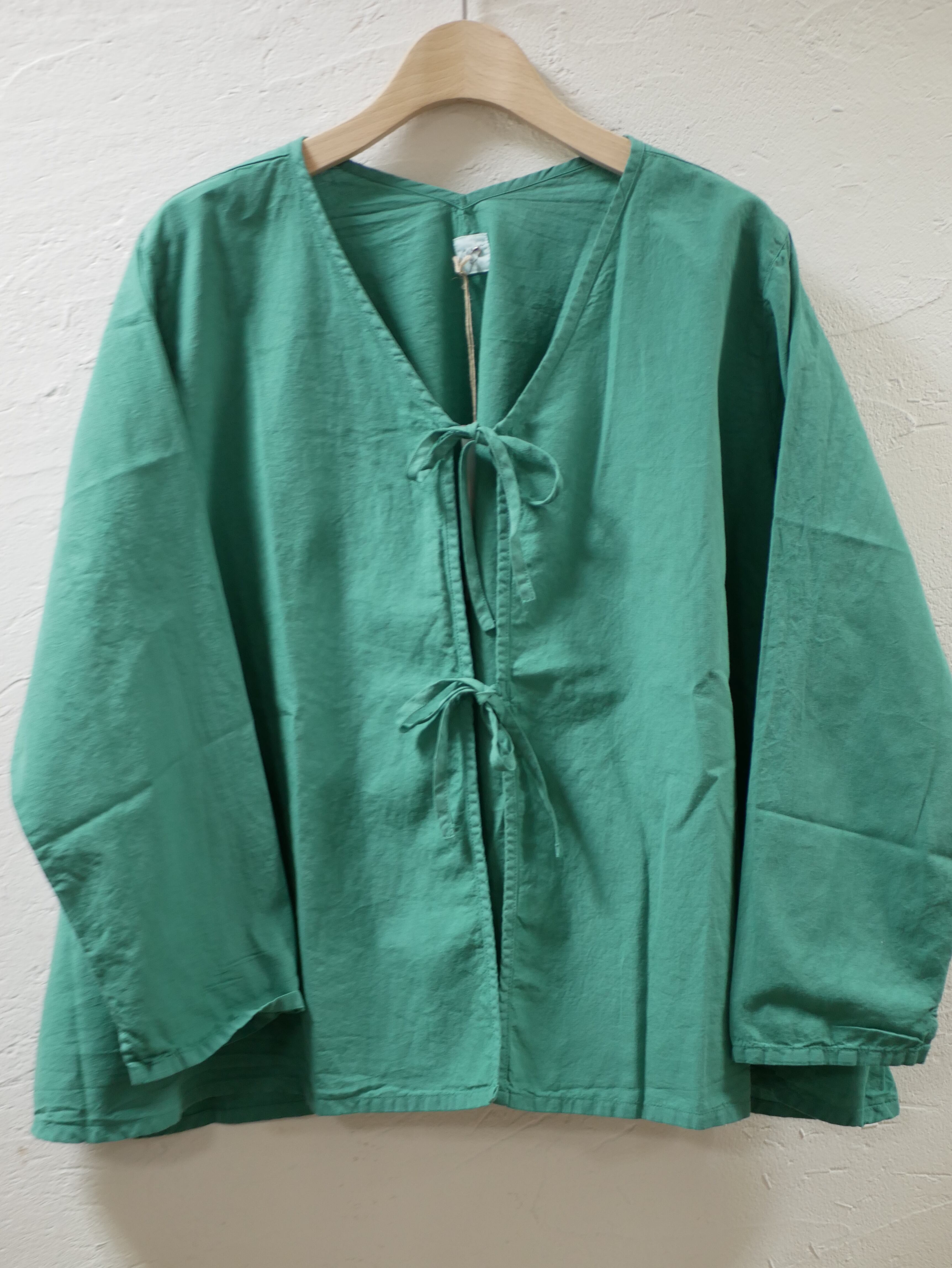 薄手の羽織として使っていただけます。リボンが2つ。夏に向けて日よけにもぴったりですよ。後ろも浅くV開きなります。Aラインのゆったりしたシルエットです。お袖は長袖です。