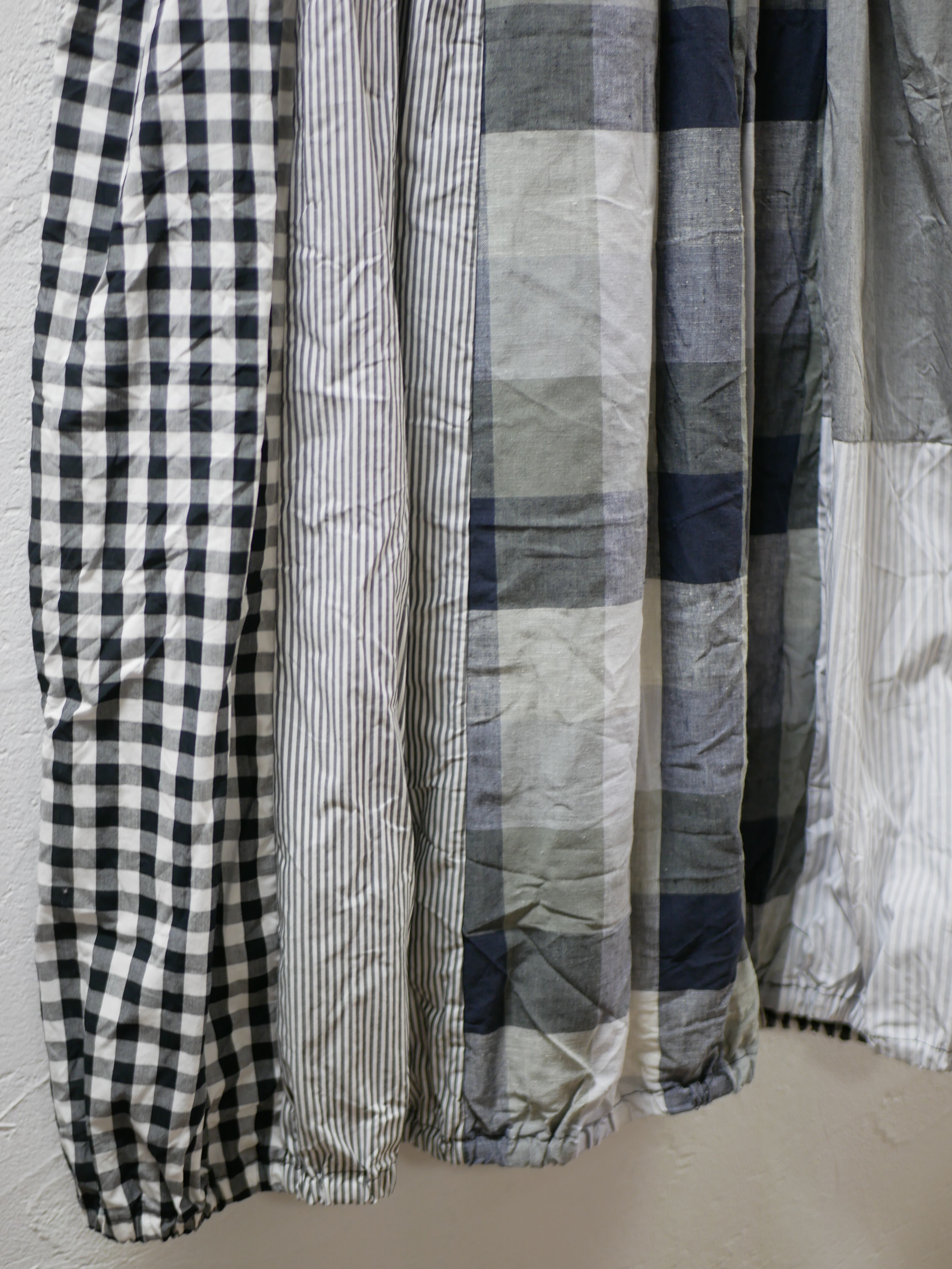 5種類の生地を切り替えたバルーンスカート。裾もウェストもゴムで、ウェストはゴムと調節用の紐が通してあります。裾がバルーンになってると広がらずスッキリした印象です。生地によっては、透け感もあります。Tシャツなどで、簡単にもあわせやすいですよ。
