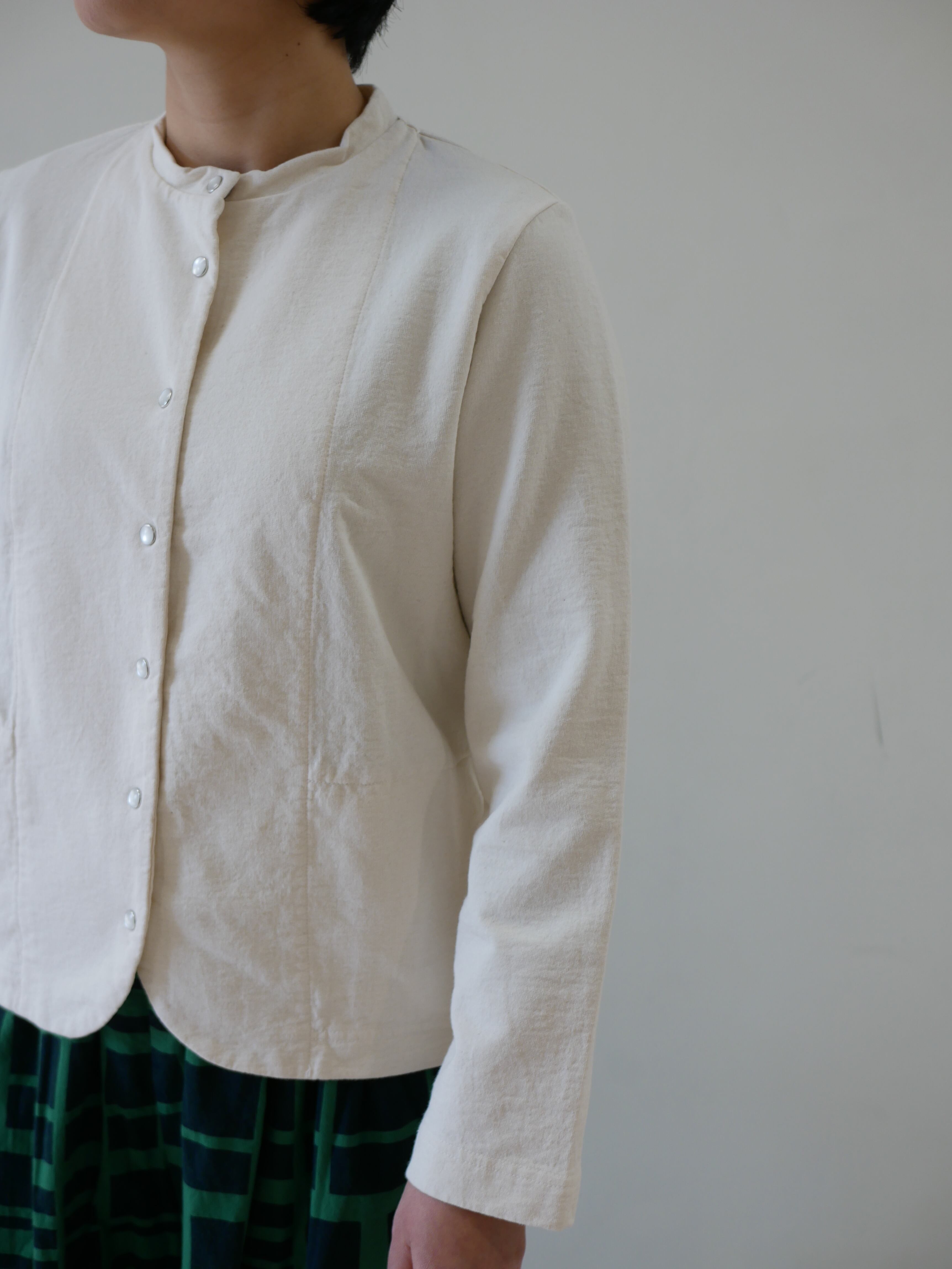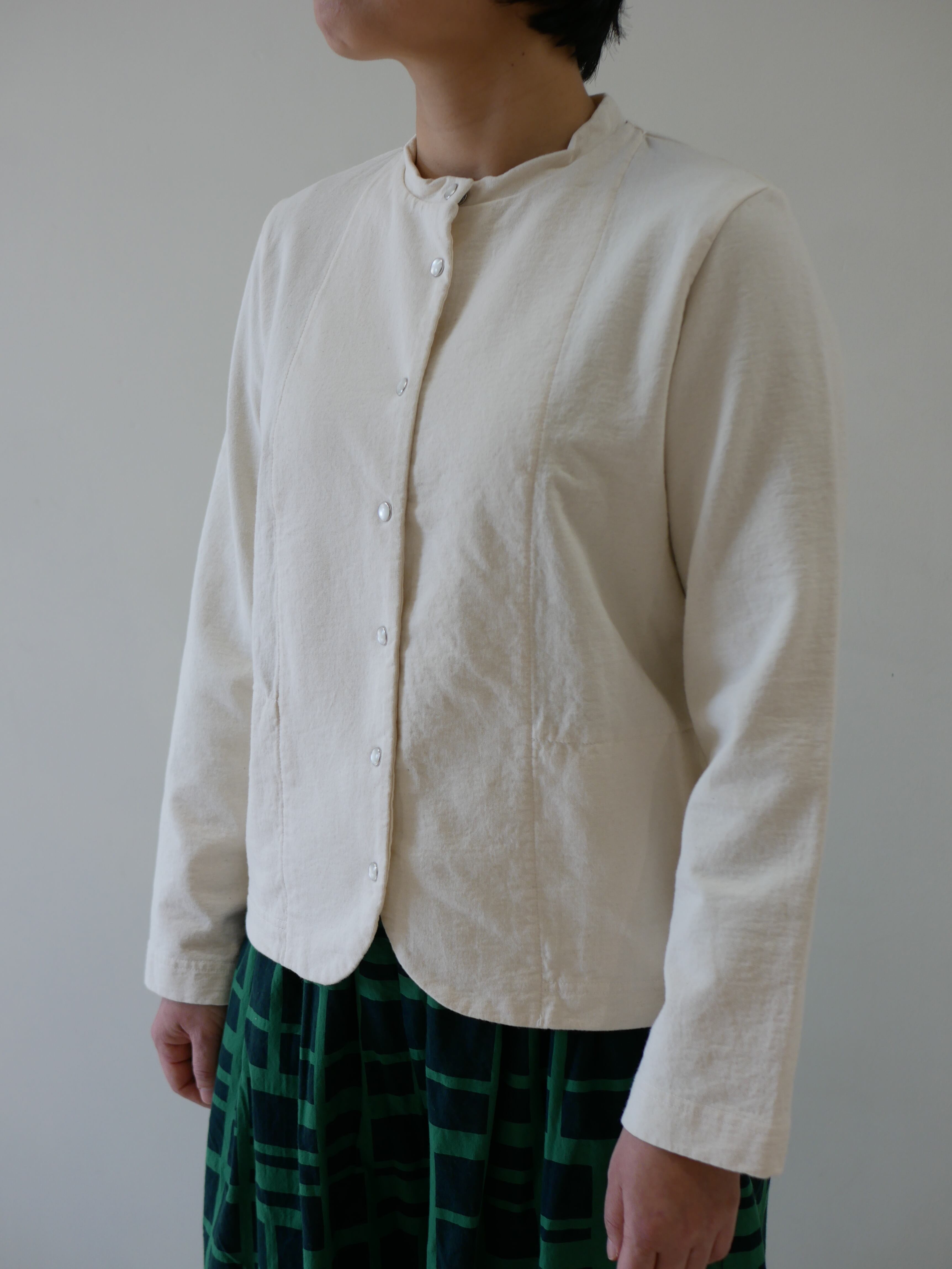 しっかりしたスェット素材で、羽織として程よくかっちりしており、両サイドポケットがついてます。スナップボタンがポイントです。カーキは、製品染めでグレーのようなカーキのような色味です。