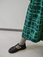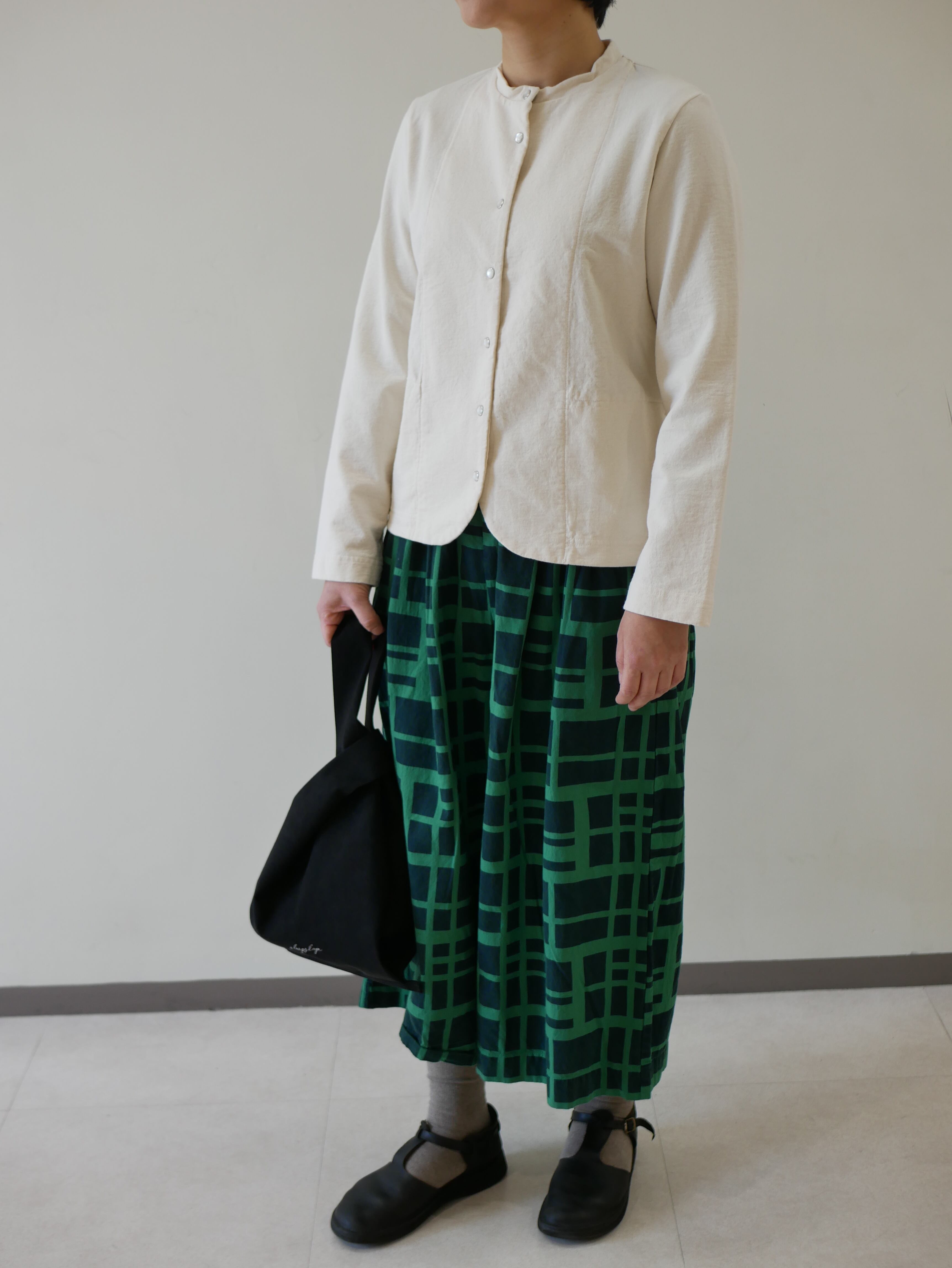 モダンなテキスタイルプリントのパンツ。透け感のない程よい張りのある生地です。ウェストは総ゴムと紐が通してあります。両脇ポケットです。