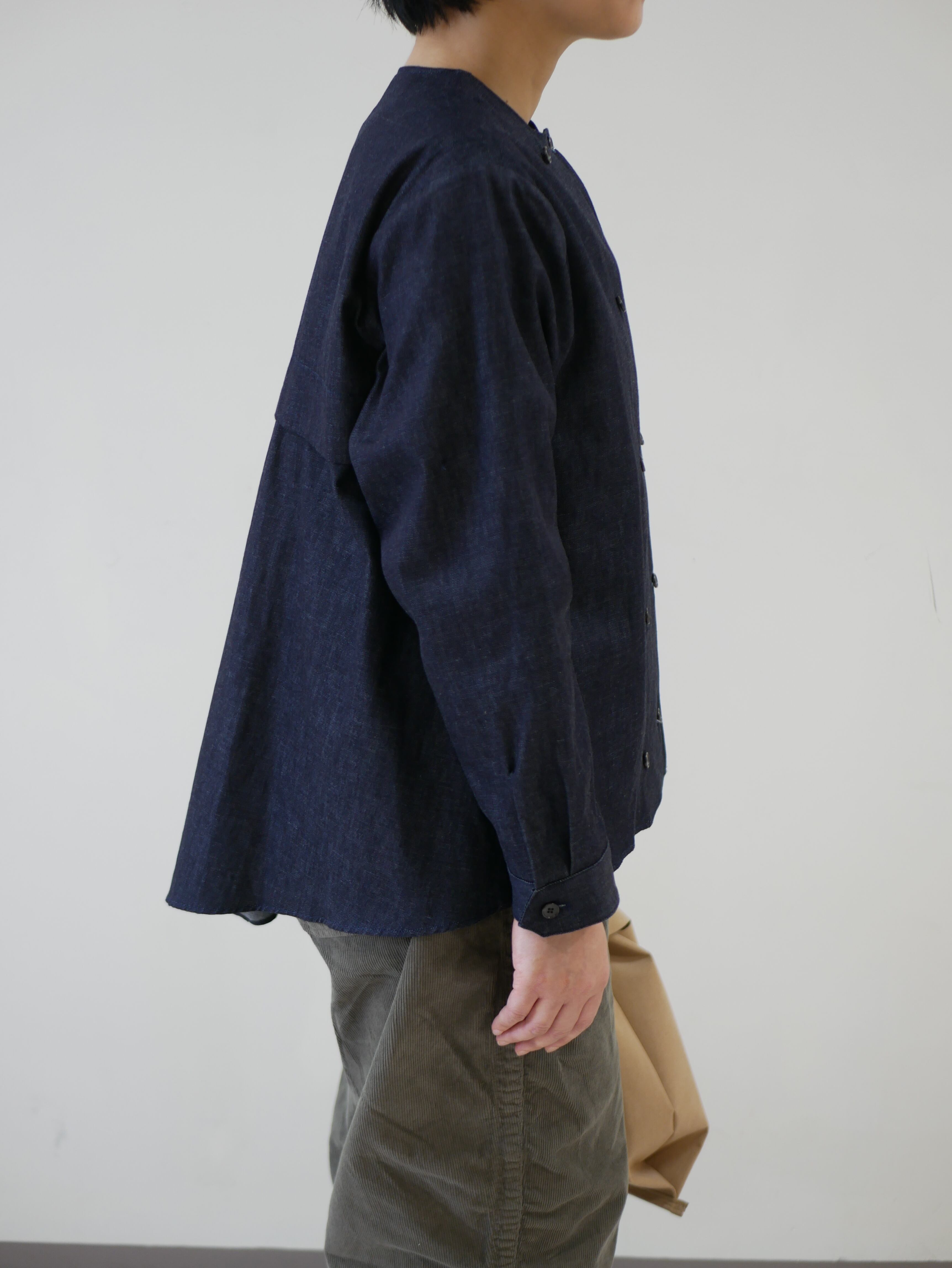 小さめのボタンが可愛いWボタンのコート。裏なしで柔らかく光沢のあるきれいめデニムです。後ろのデザインも美しく弧形に長くたっぷり広がりのあるデザインです。春と秋に重宝する一枚です。