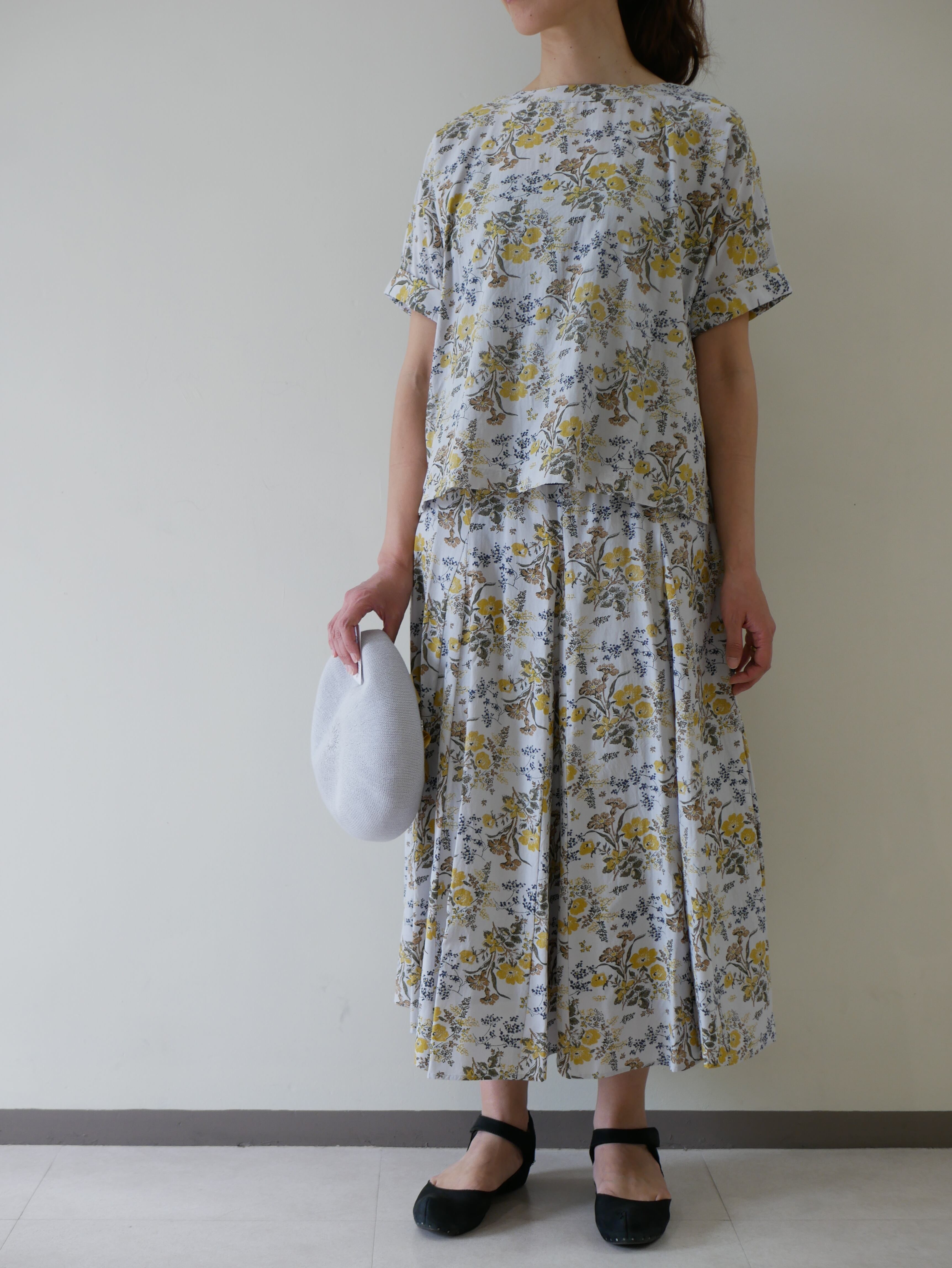 同じ柄のスカートもあります。スカートにもあうような、丈感。ライトべージュに落ち着いた赤の花柄と、ライトグレーにイエローのお花柄です。後ろは一つボタンで開きます。アームホールの切り替えはなくスッキリしてます。後ろは切り替え下からタックで立体的です。とろみのある素材で目が詰まっていて、透け感ははさほど気になりません。手洗い可能です。スカートとのセットアップもおすすめです。