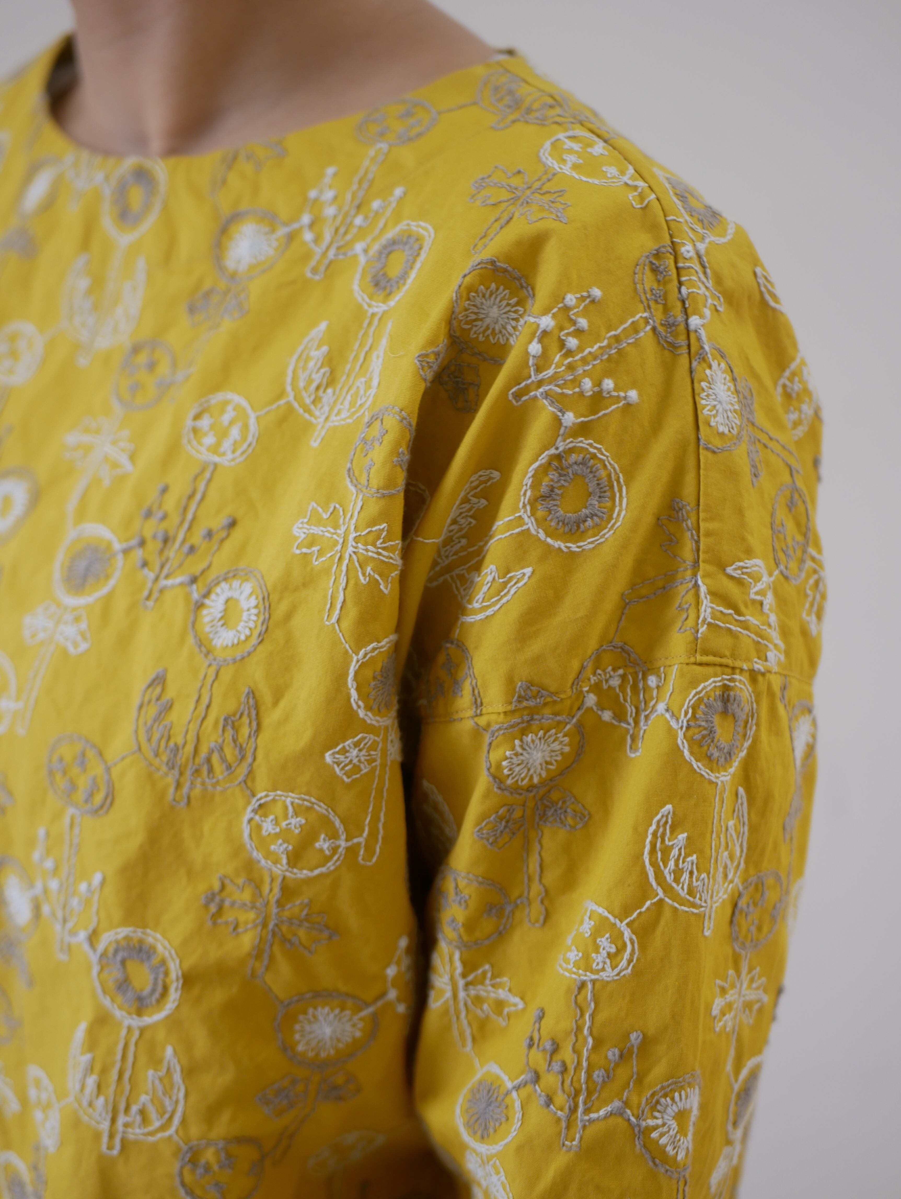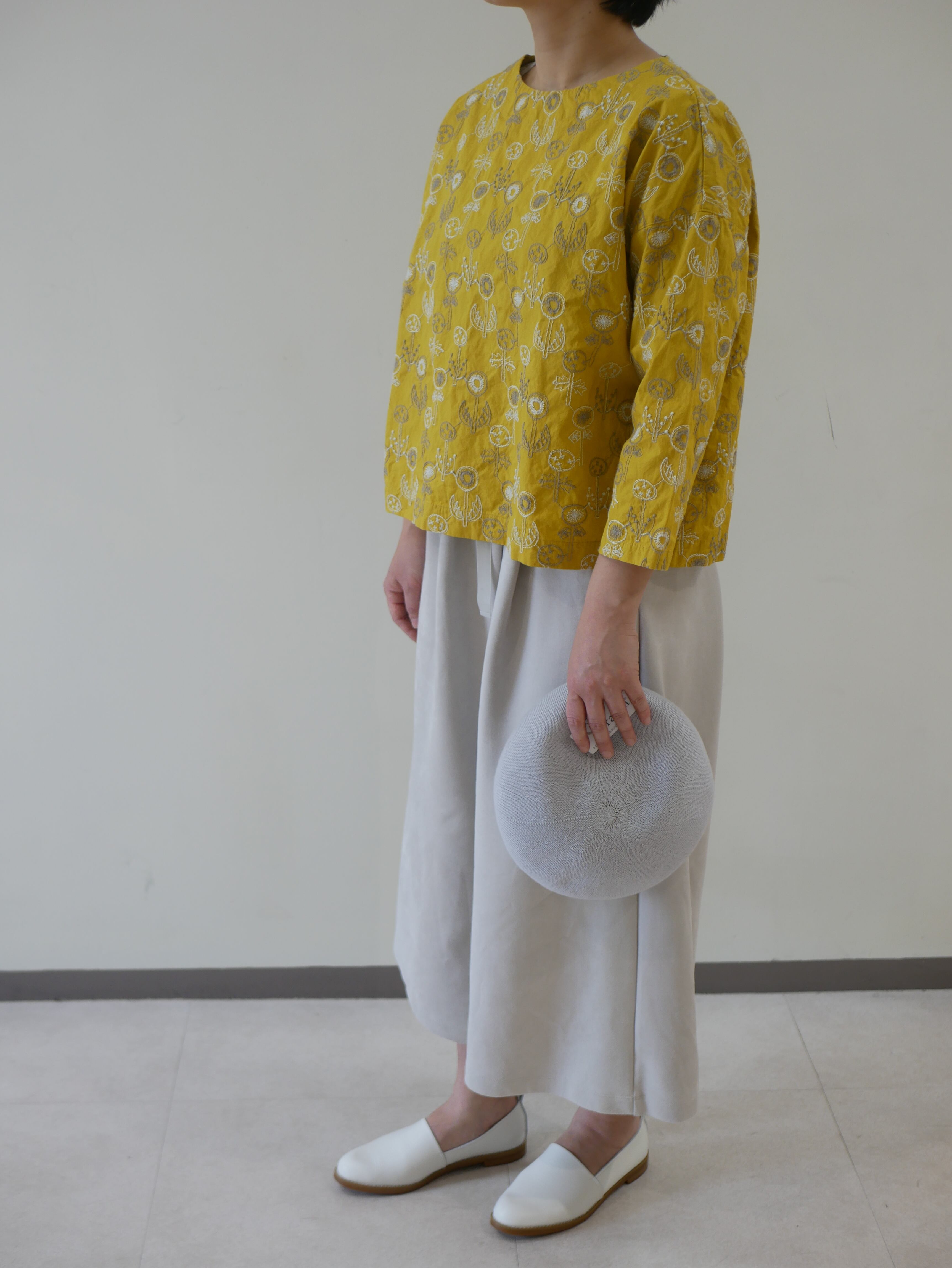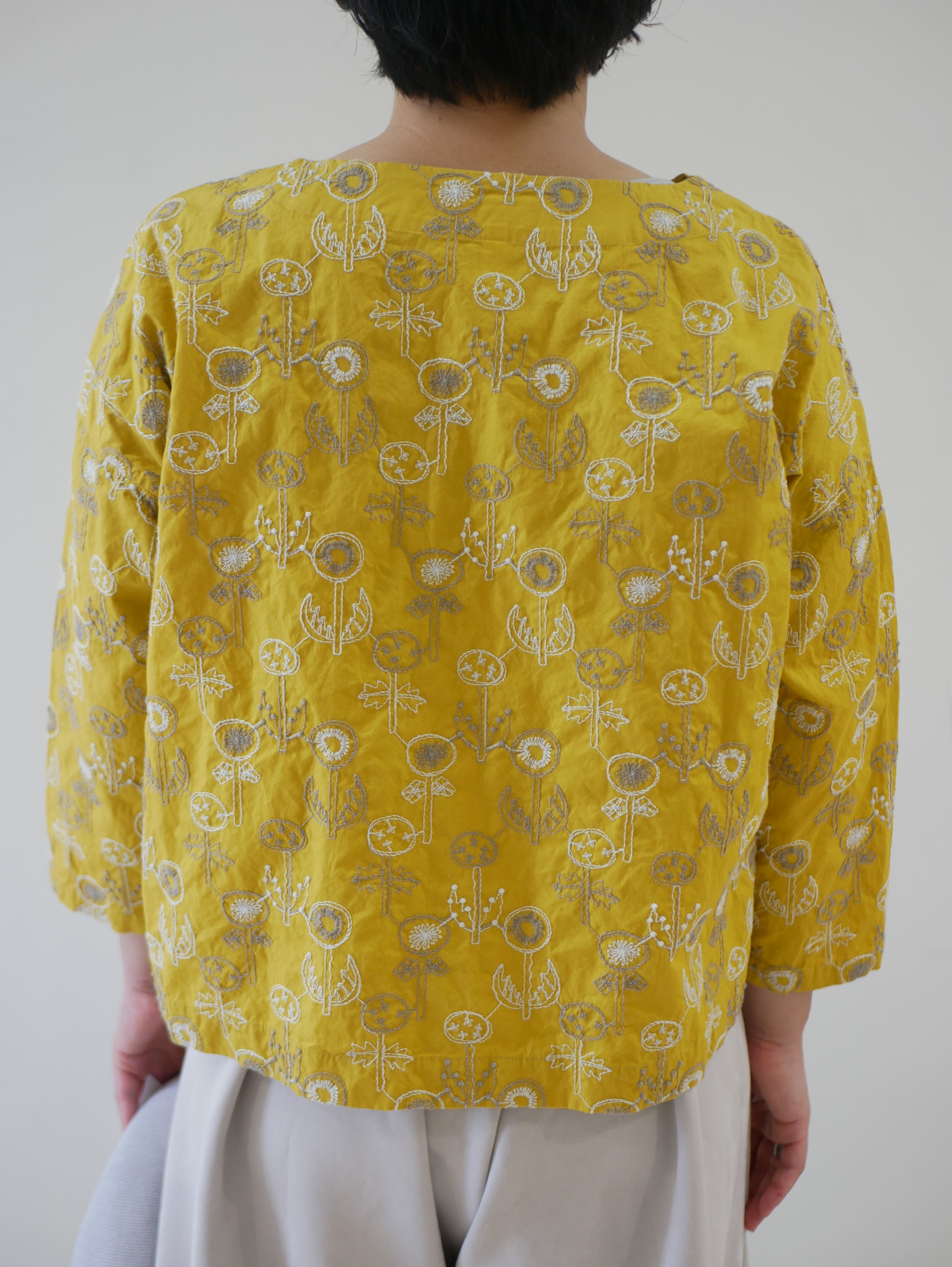 総刺繍の華やかなブラウス。丈は少し短めでワイドパンツやスカートにもよく合います。透け感のない、しっかりした綿素材。立体的な刺繍になってます。肩がおちてお袖はすっきりしたラインです。手洗い可能。