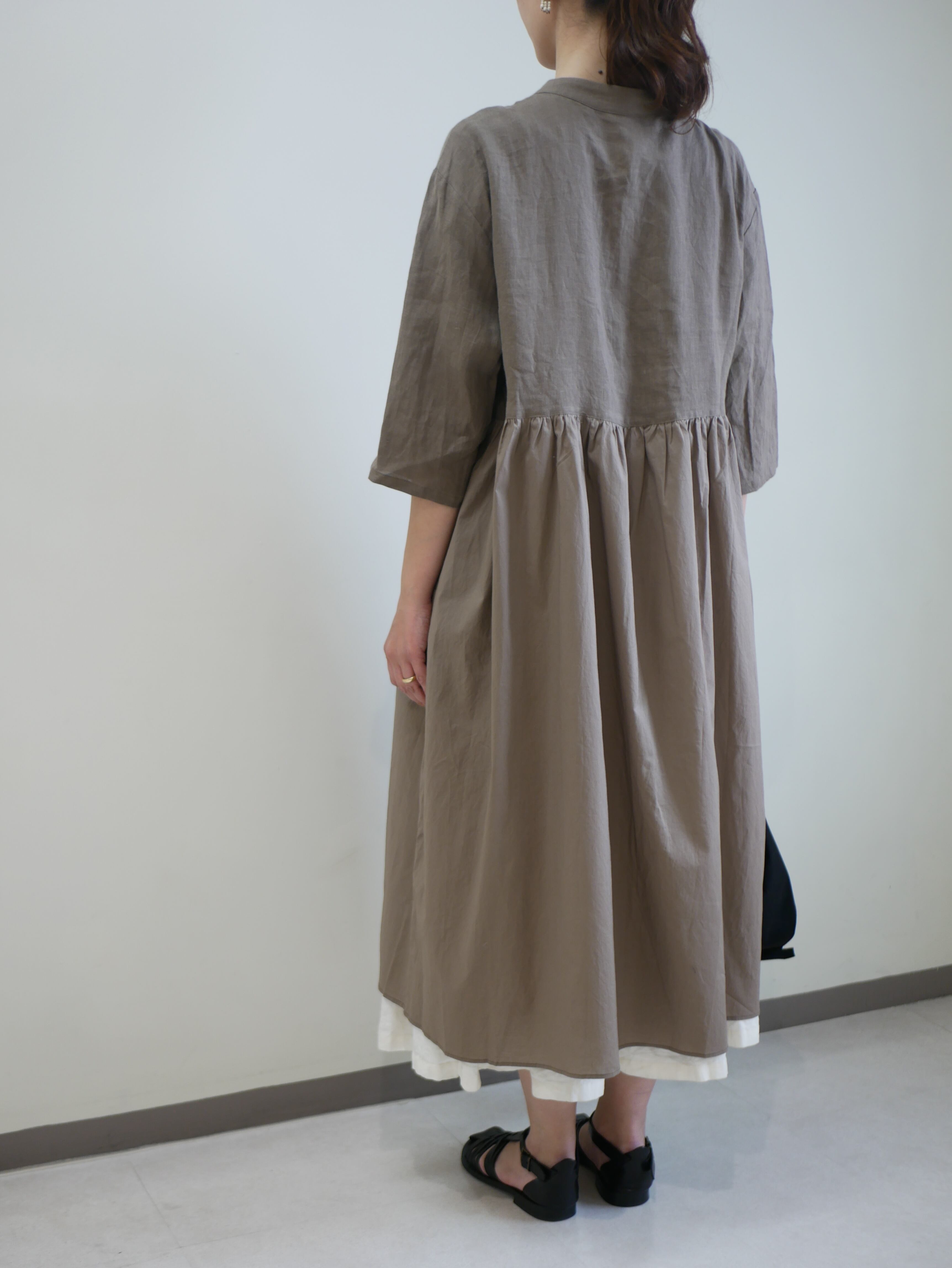 上部分はリネン。スカート部分は綿になっていて、同色ですが素材の違いが楽します。ノーカラーで大人っぽい雰囲気です。前開きですが、スカート部分が、比翼仕立てでボタンが見えずすっきりします。透け感はあります。ポケットは両脇。