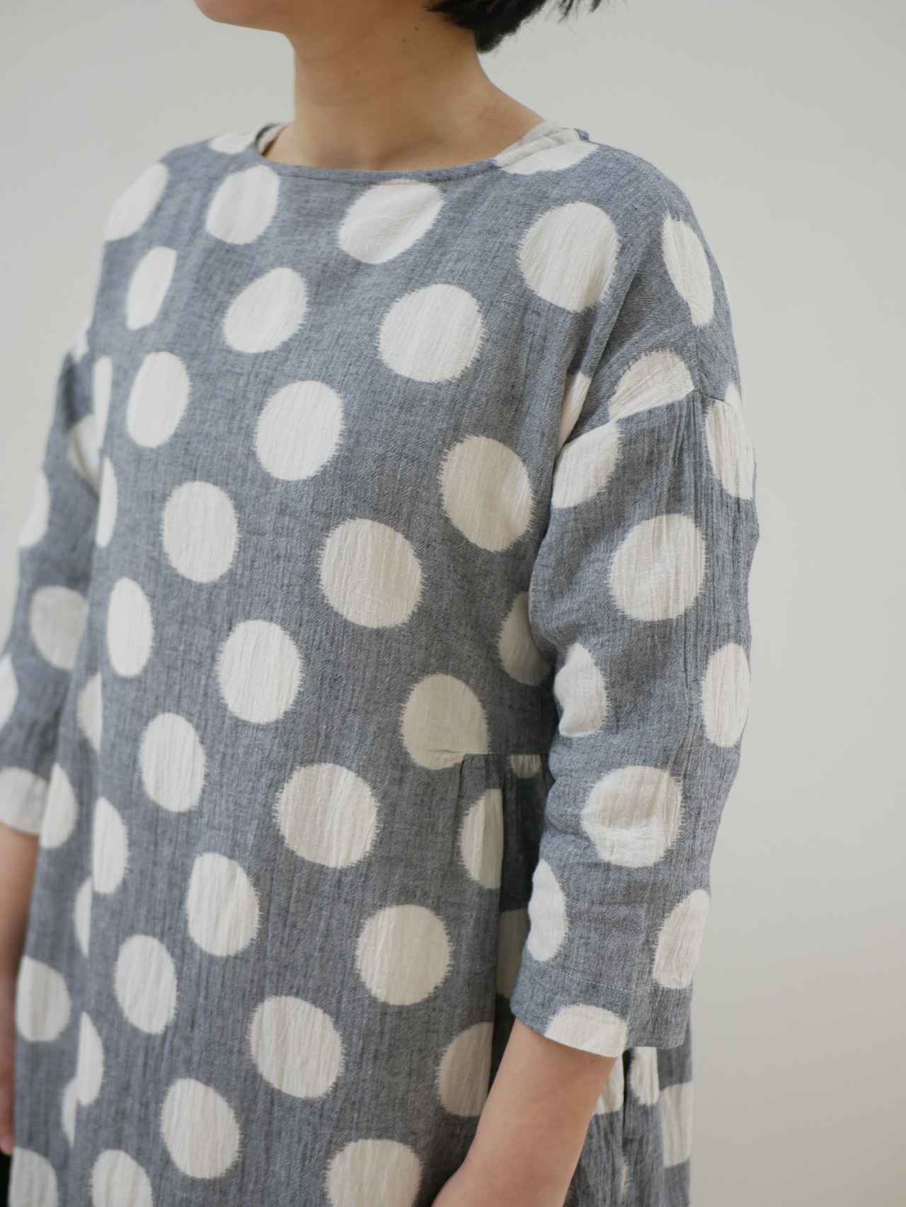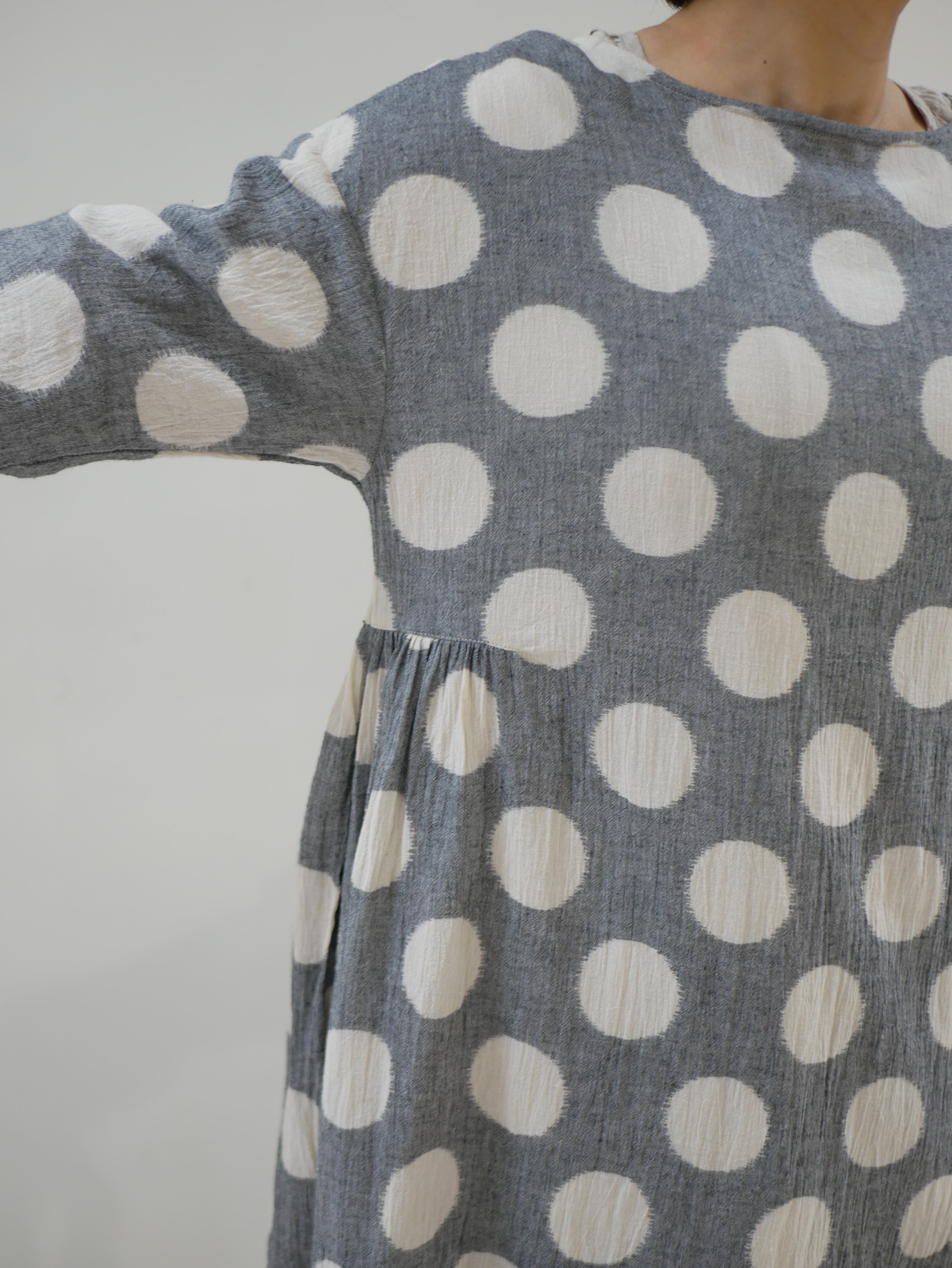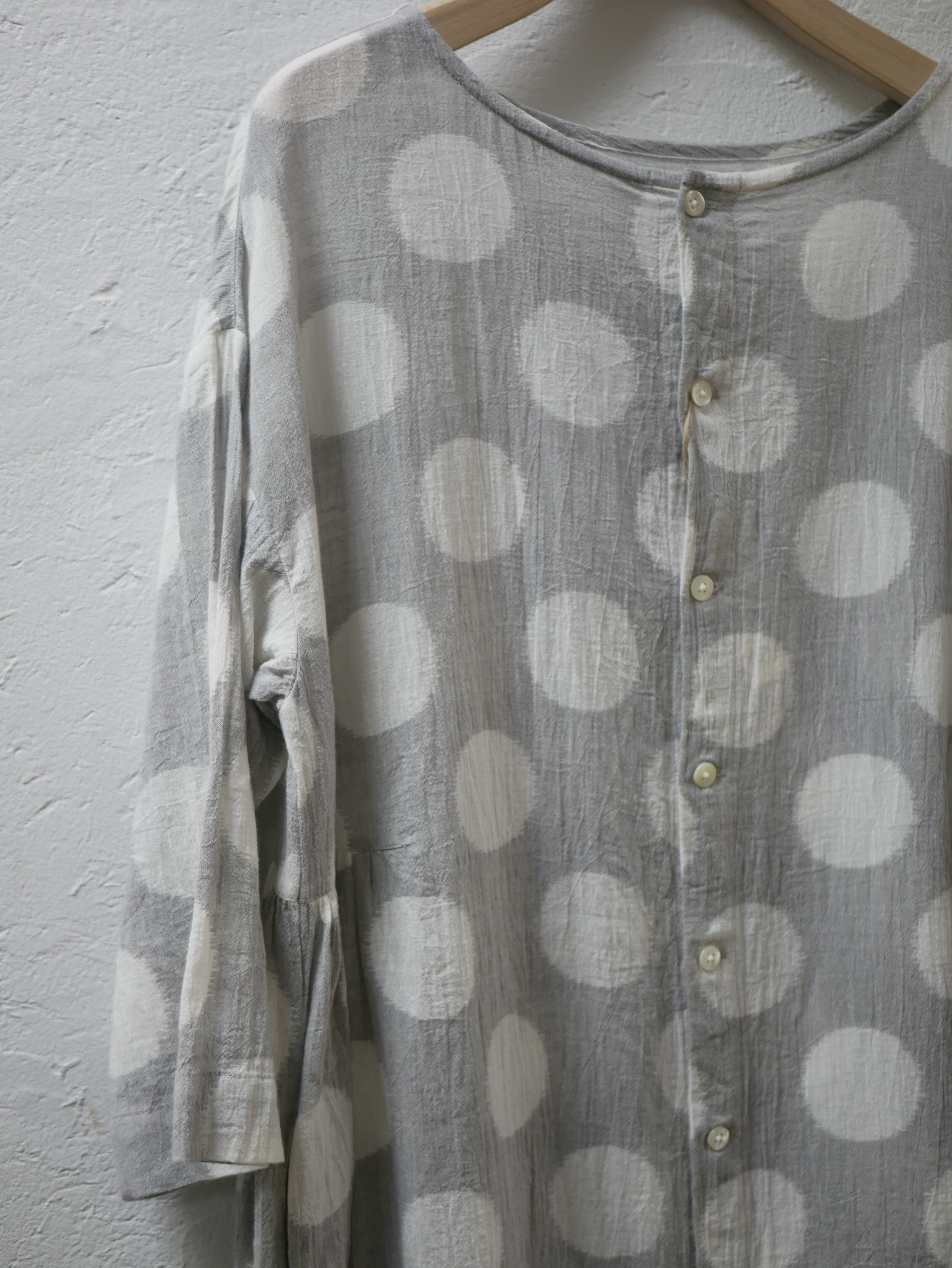 涼し気なドットのワンピース。前開きにして着ていただくと羽織。後ろボタンでワンピースとして着てもらうことも可能です。ドロップショルダー。サイドにギャザーがあります。シワ感がありさらっとしていて涼し気です。抜染プリントで味のあるドットにしあがってます。夏の日よけにもぴったりです。