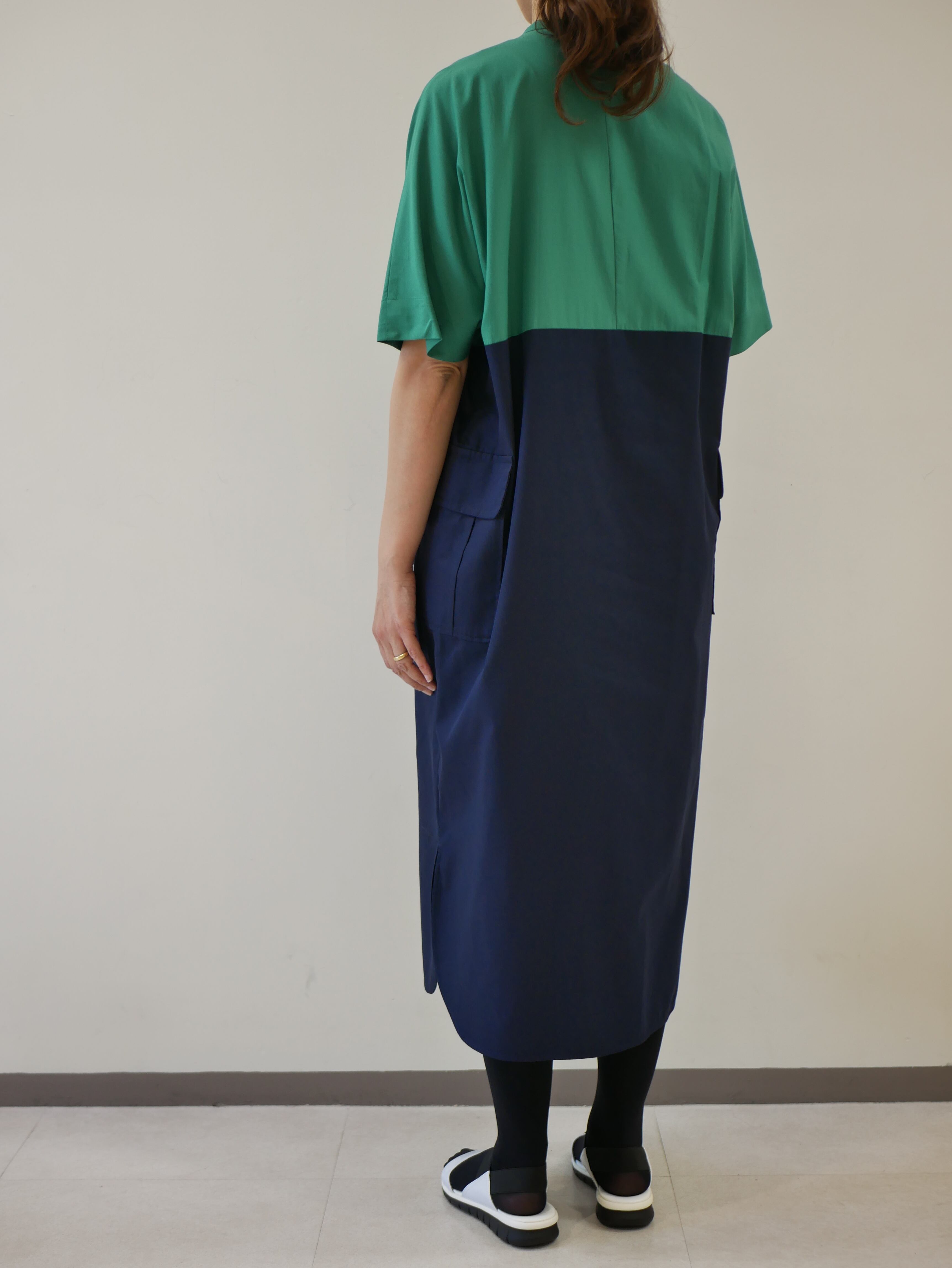 スマートなノーカラーワンピース。上部分の素材はしなやかさと、適度なはり感があります。スカート部分は透け感がない、ツイル素材です。両サイドの大きめのポケットもポイントです。一枚でも着ていただけて重宝しますよ。アームホールの切り替えがなく楽に着ていただけます。裾はカーブさせてスリットになってます。お洗濯可能。