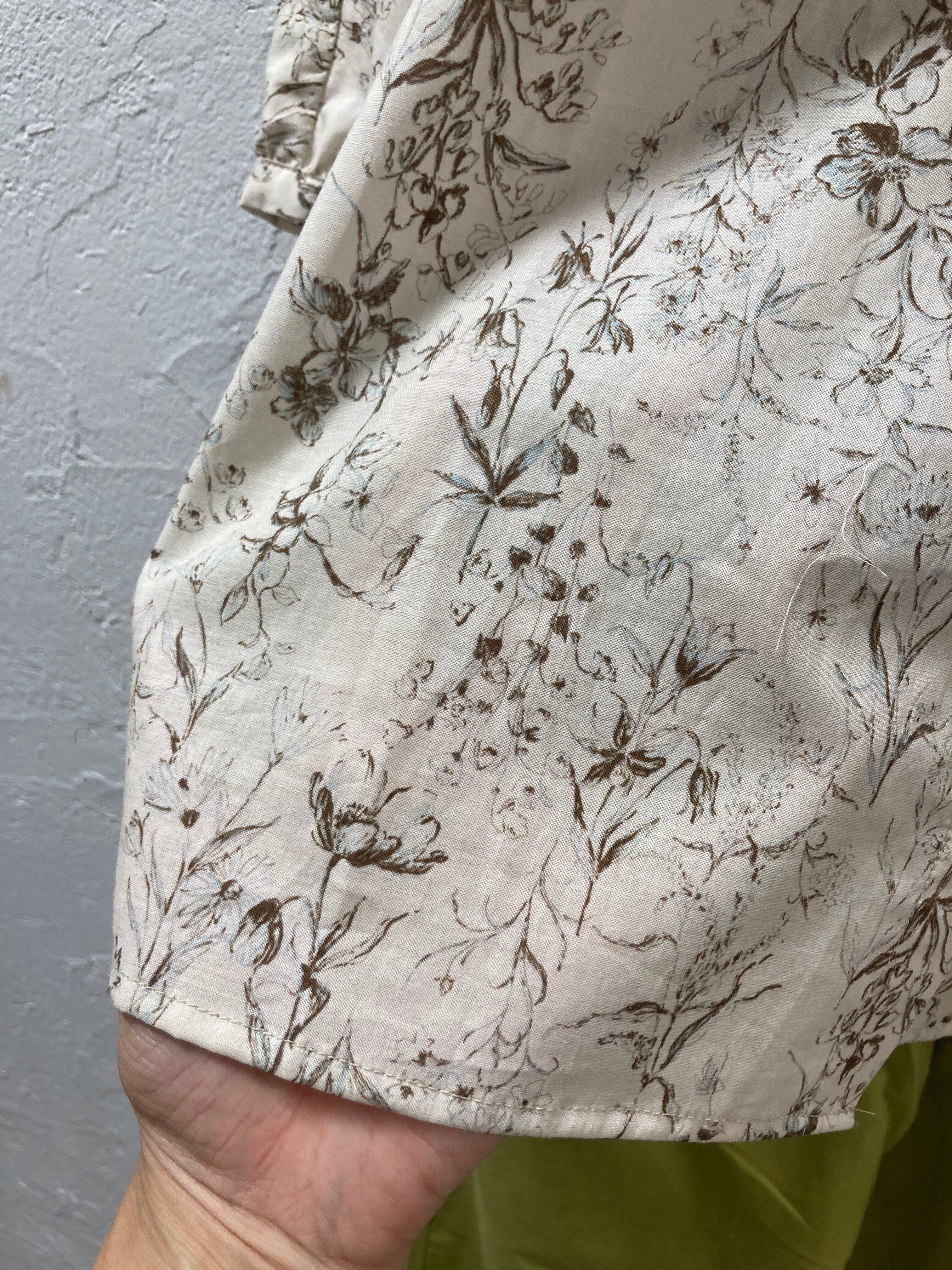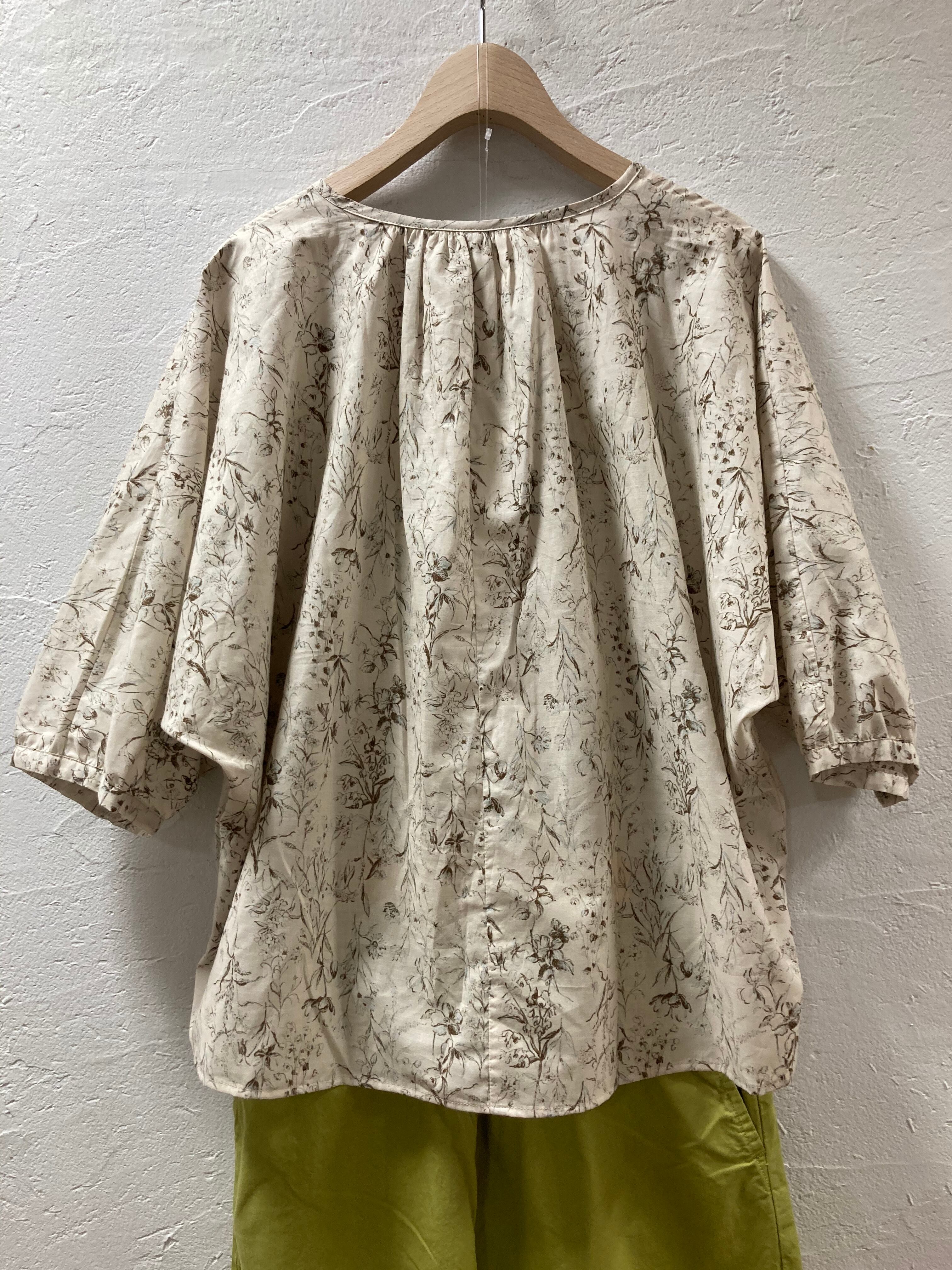 コットンローン素材にアンティークボタニカル柄をプリントしました。ドルマンシャツは襟を作らず女性らしい印象です。