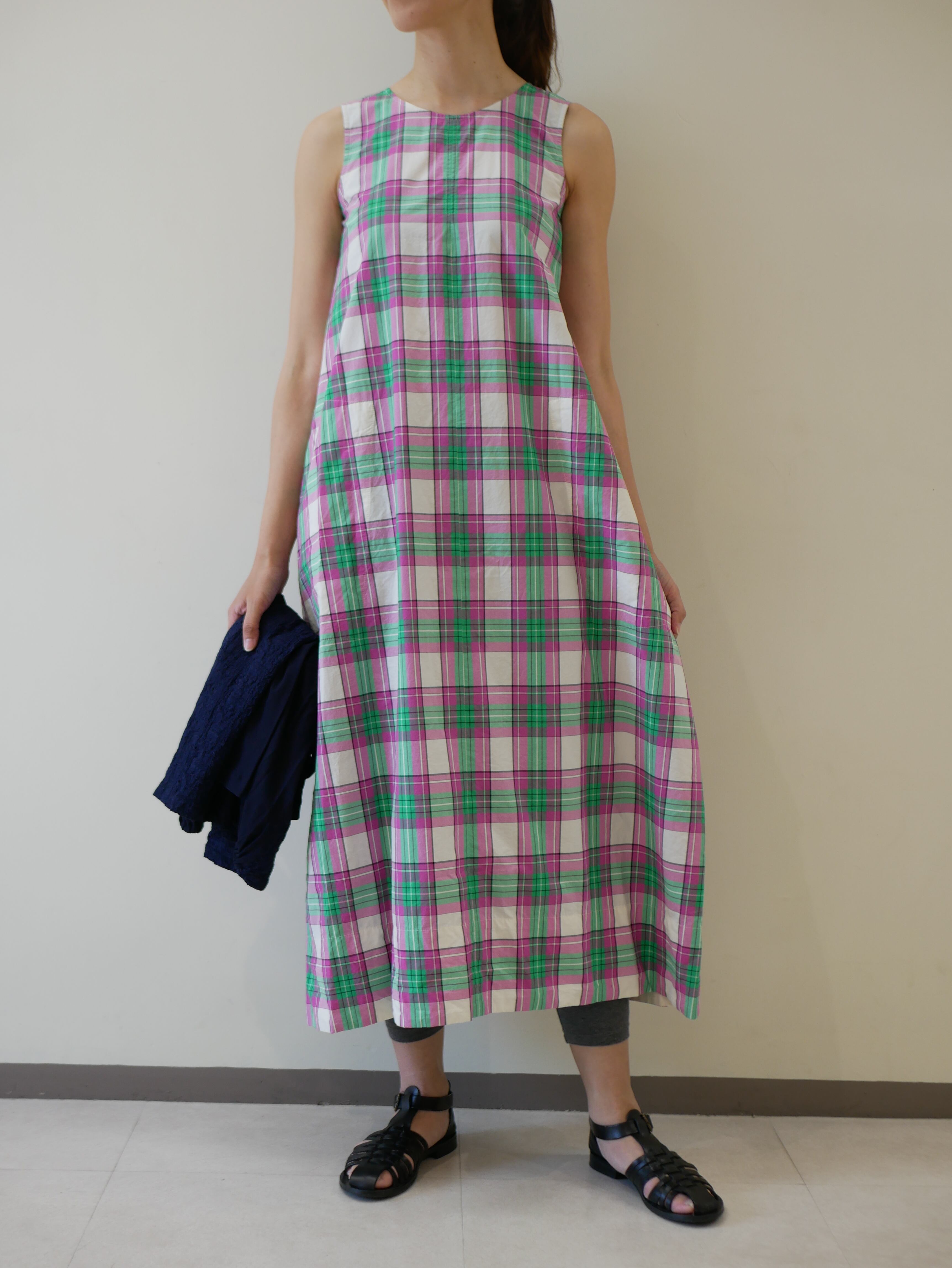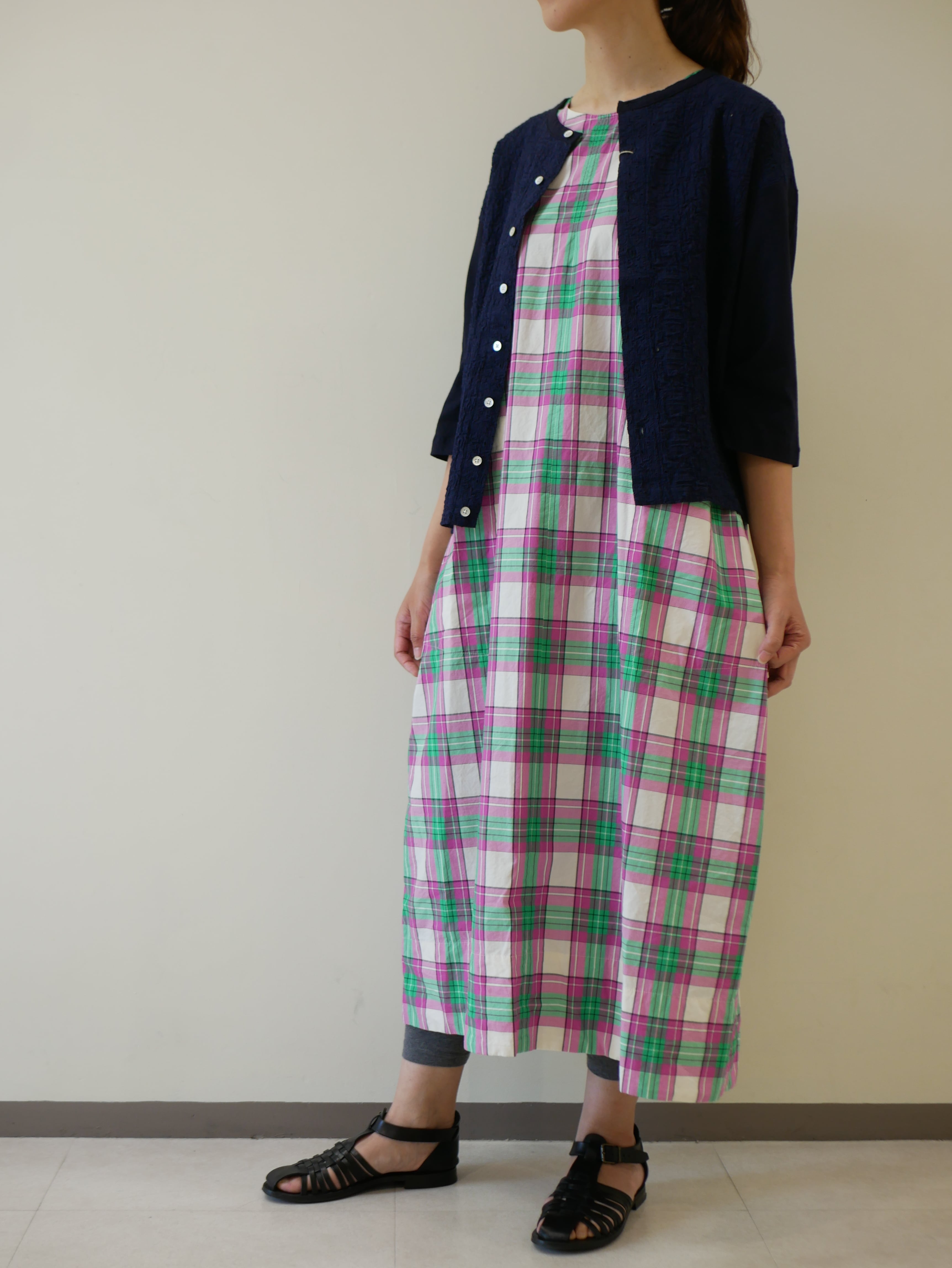 今年らしいカラーリングのワンピースです。生地も適度な張り感があります。カーディガン羽織っても素敵です。裾は、Aラインではなく、少し内側に丸みがあるバルーンワンピースです。両脇にポケット。開きはありません。お洗濯可能です。