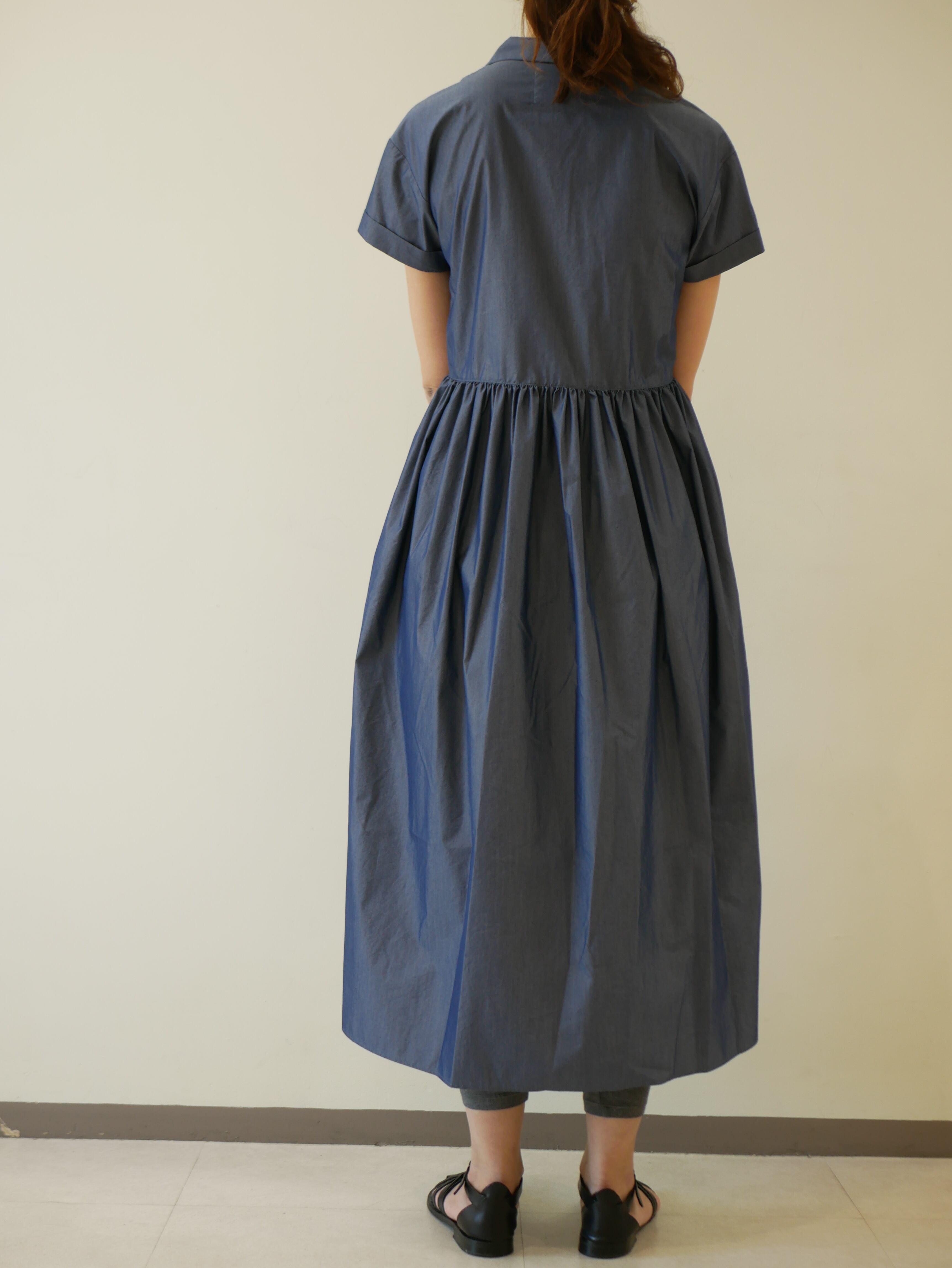さらっとして、柔らかで、ほんのり光沢があり、とてもきれいなワンピースです。テーラードカラーシャツとギャザースカートを組み合わせたデザインで、リボンを解いて前開きとしても着ていただけます。透け感もなく心地よく着ていただけます。両脇ポケット。お洗濯可能です。