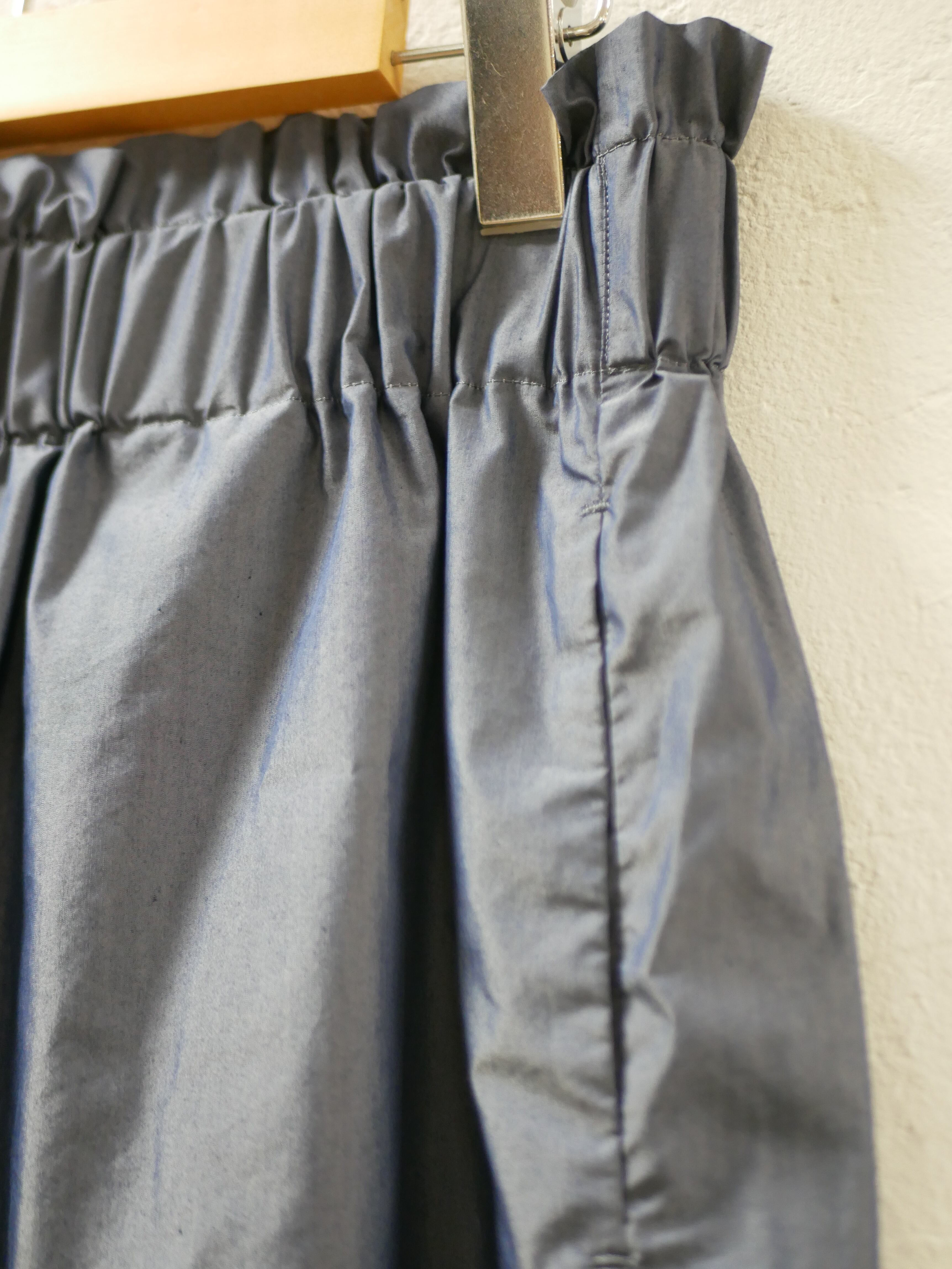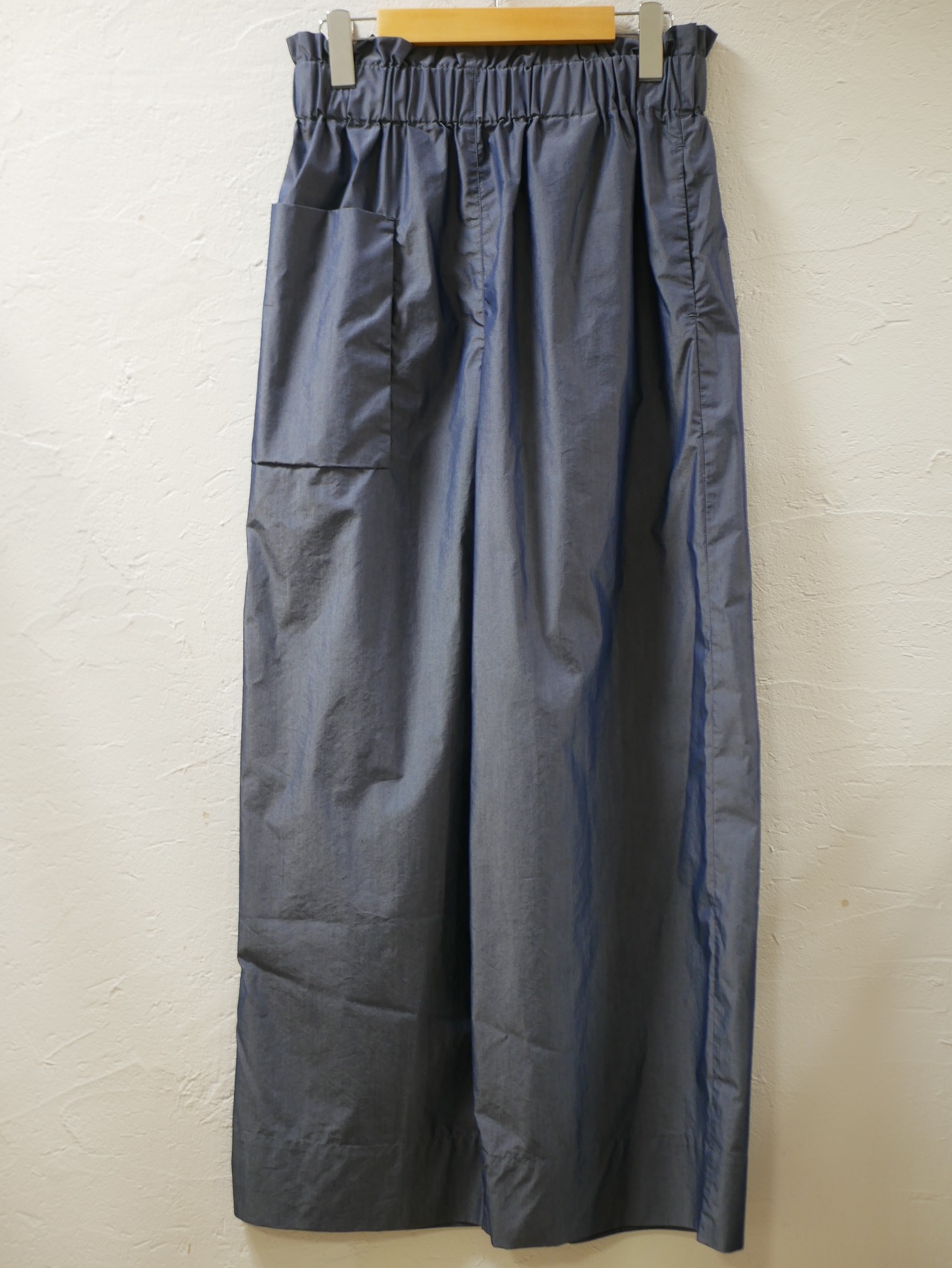 さらっとして、柔らかで、ほんのり光沢があり履き心地のいいパンツです。右脇は少しマチのある四角いポケット。左はサイドポケットです。ウェストは太めのゴムです。カジュアルにもきれいめにも履いていただける1枚です。お洗濯可能。