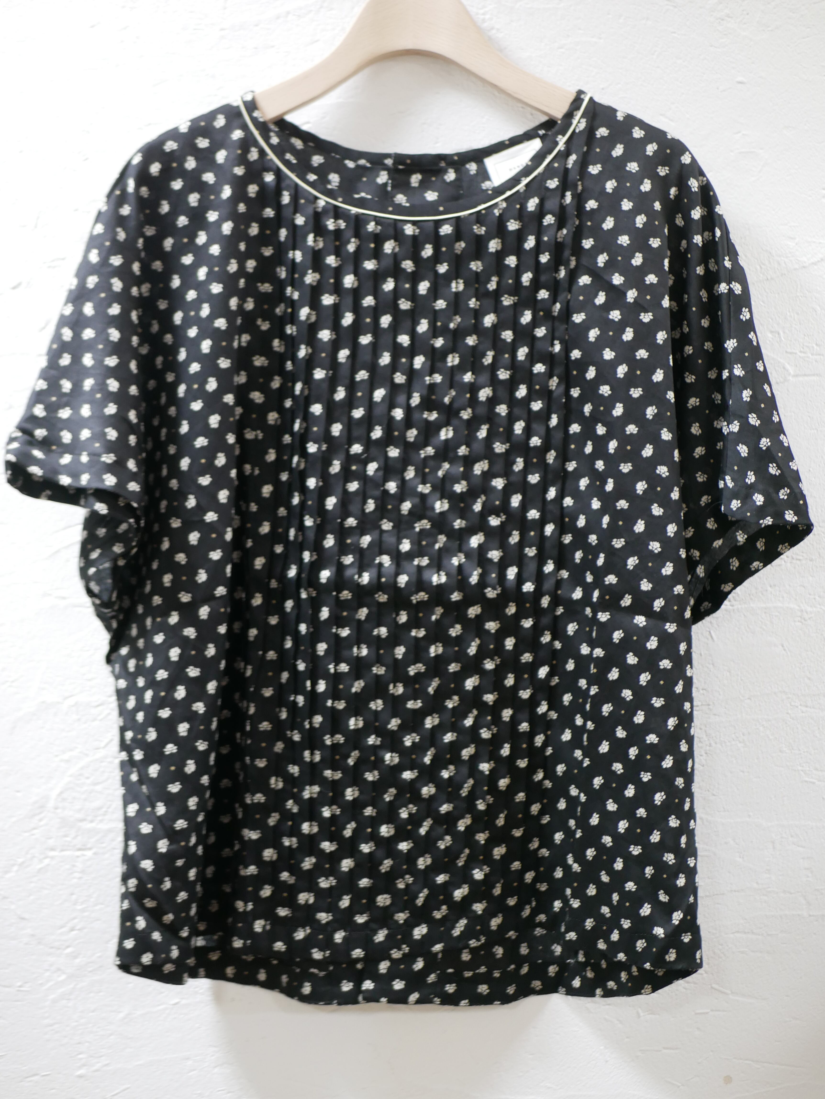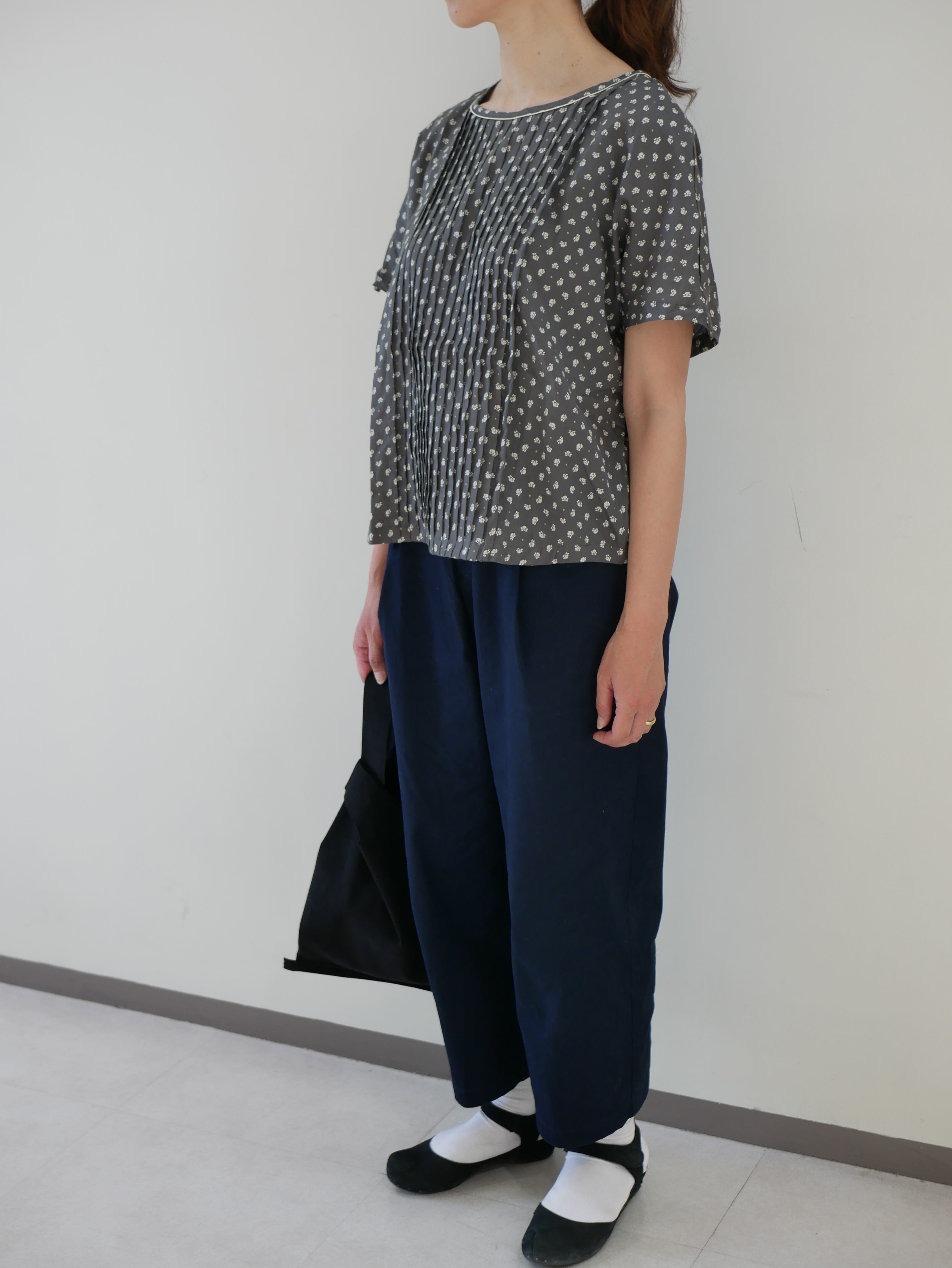 しなやかな生地に、ピンタックが沢山入ったブラウスです。単色の小花柄は上品な印象です。スカートにも、ボリュームのある、パンツにもバランスよく着ていただけますよ。後ろボタンです。お洗濯可能。