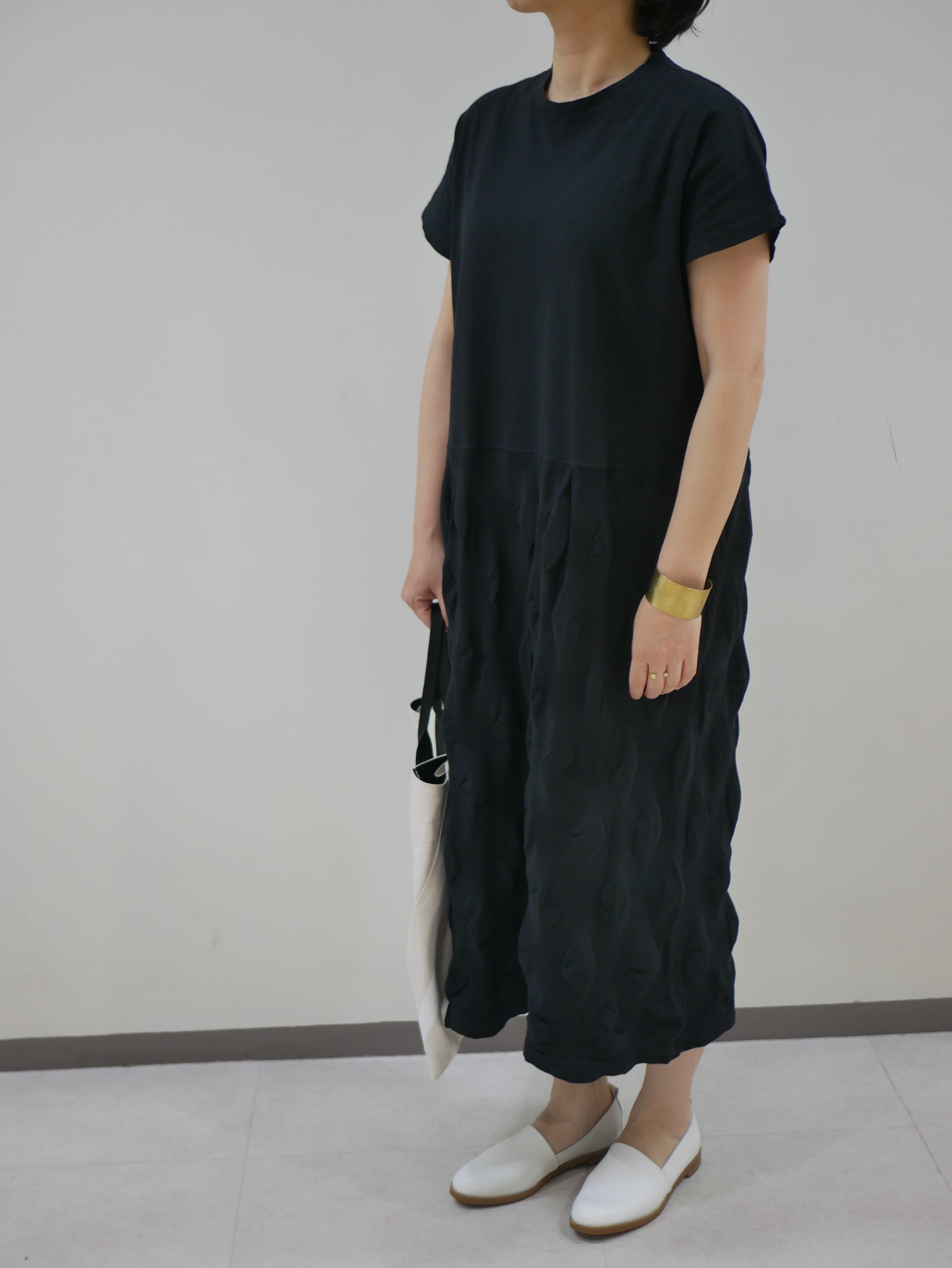 スカート部分がドットジャガードで、凹凸があり表情豊かなカットソーのワンピース。透け感もなく、一枚で着ていただけます。カジュアルになり過ぎず、それでいて、着心地のいい一枚です。両脇ポケット。お洗濯可能です。黒です。