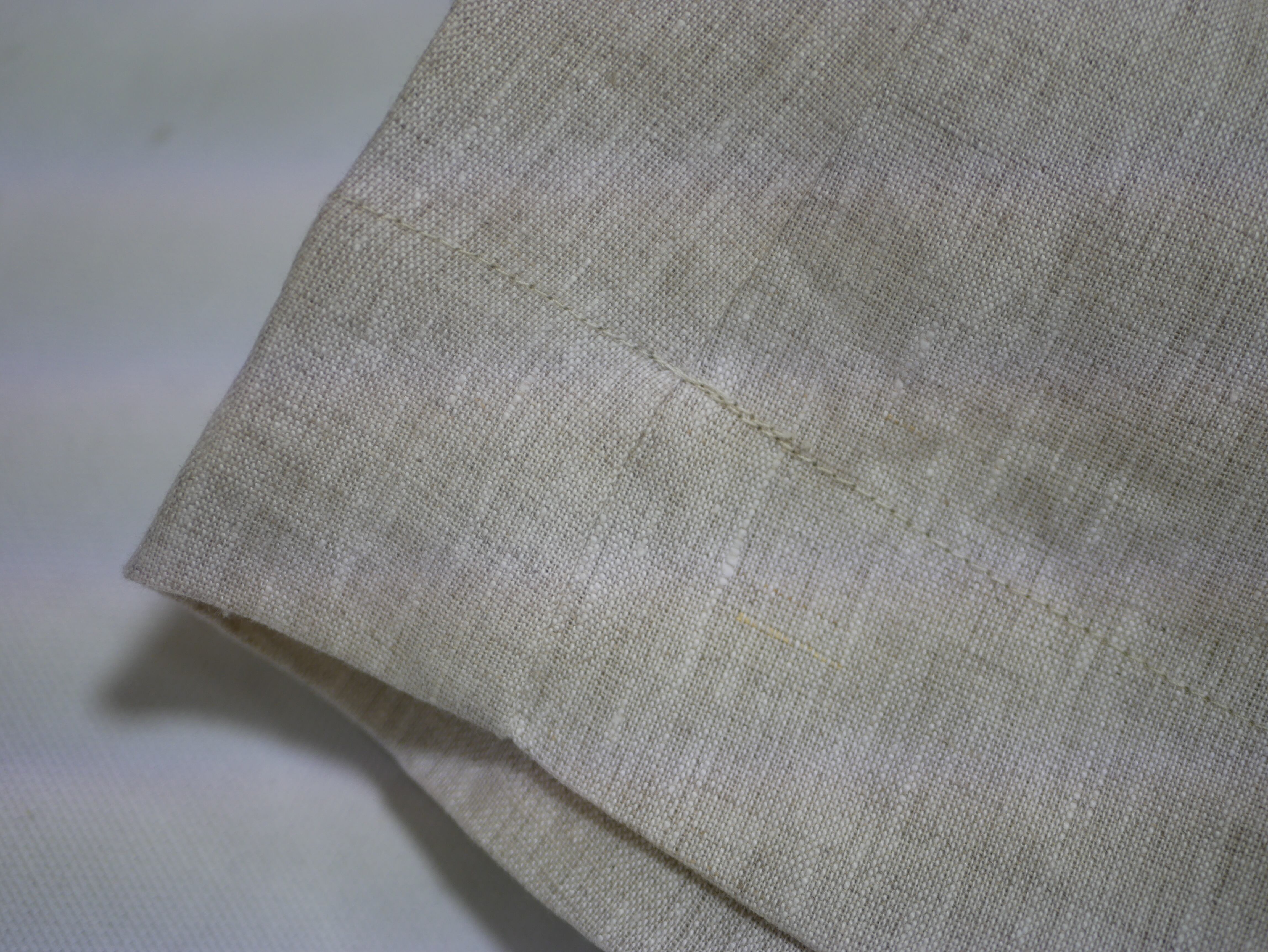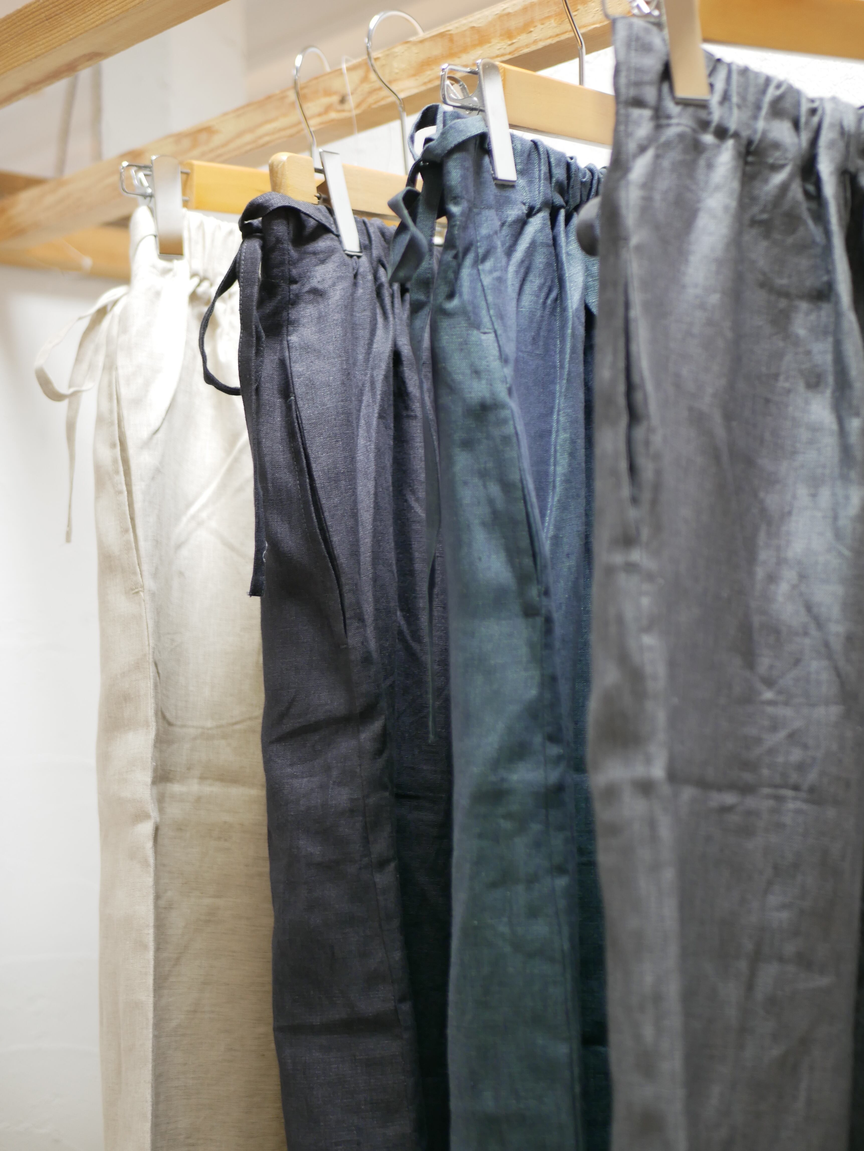 メランジリネン生地です。薄すぎないリネン。清涼感があり、メランジ調の色ムラが特徴です。ワイドパンツの前部分がラップ付になっていて、いつものパンツスタイルに少し変化がでますね。前から見ると、スカートにも見えてカジュアルになりすぎないです。両サイドポケット。後ろウェストはゴム。お腹周りは、ラップ布でスッキリ見えます。