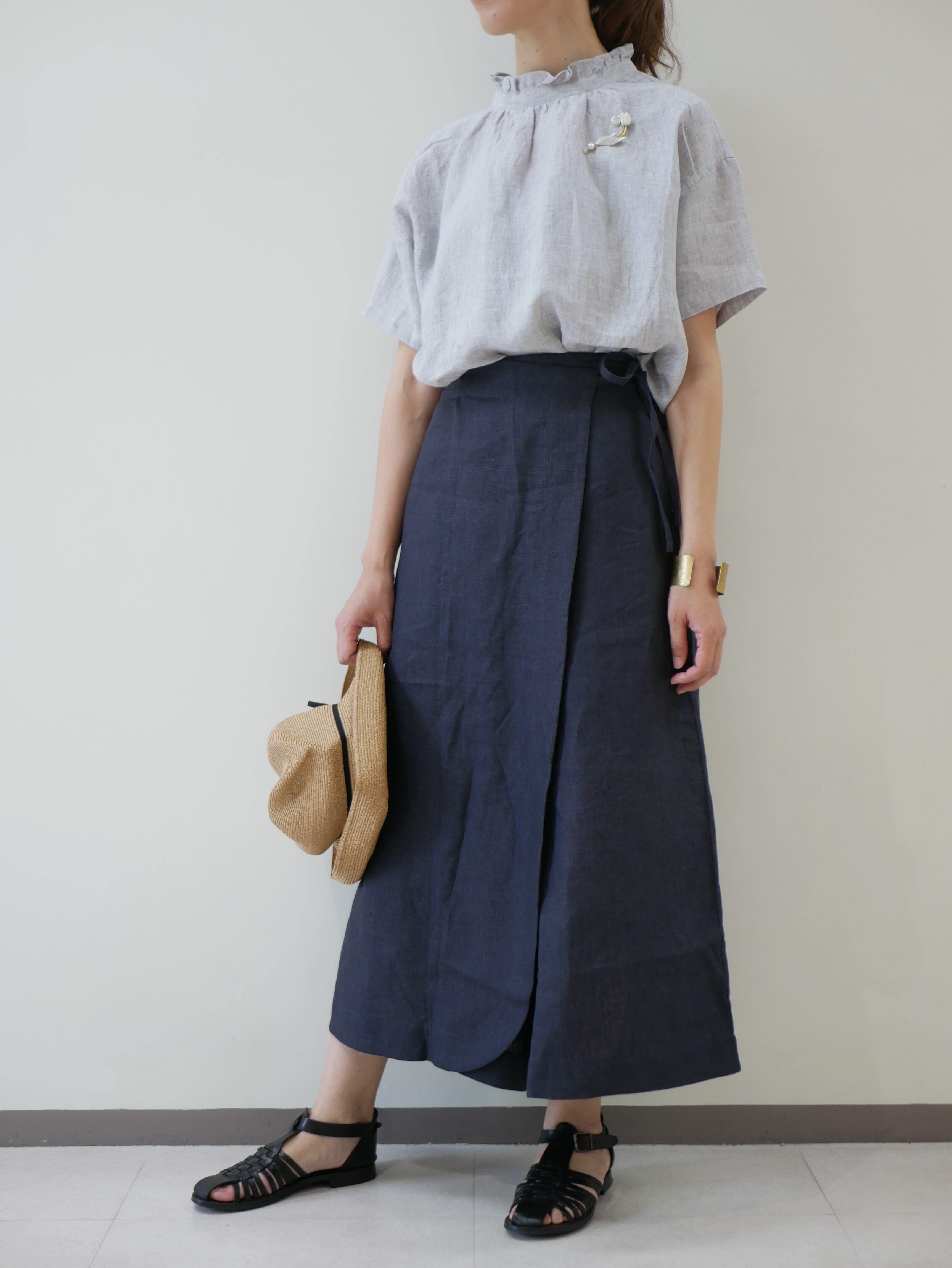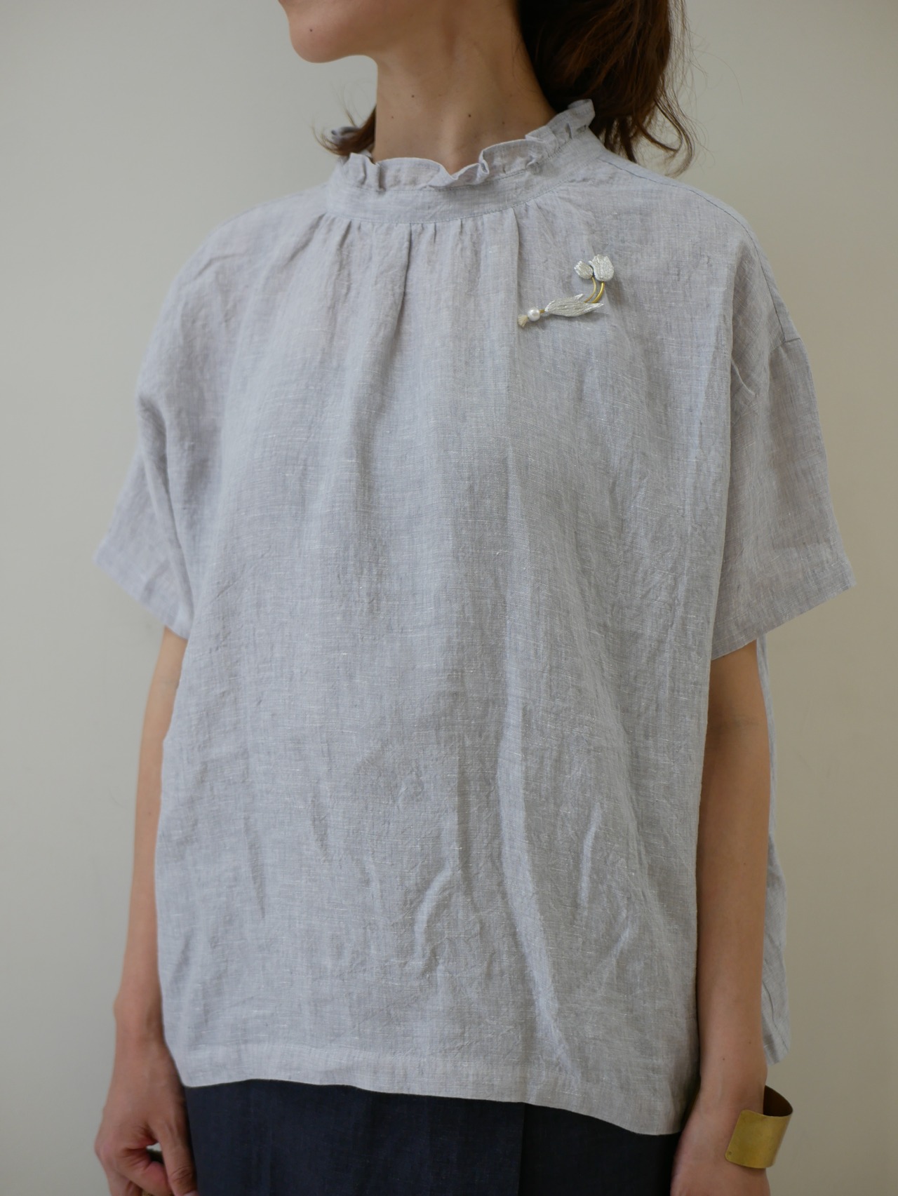 遠州灘メランジリネンのフリルカラーブラウスです。清涼感、繊細さのある素材です。襟ぐりにギャザーを寄せ低めのスタンドカラーに挟み込んでます。ギャザーとフリルで上品で大人可愛い一枚です。透け感はありますが、涼しく着ていただけます。インして着てもいいですし、パンツにバサッと着て頂いても。後ろボタンで開閉です。お洗濯可能。