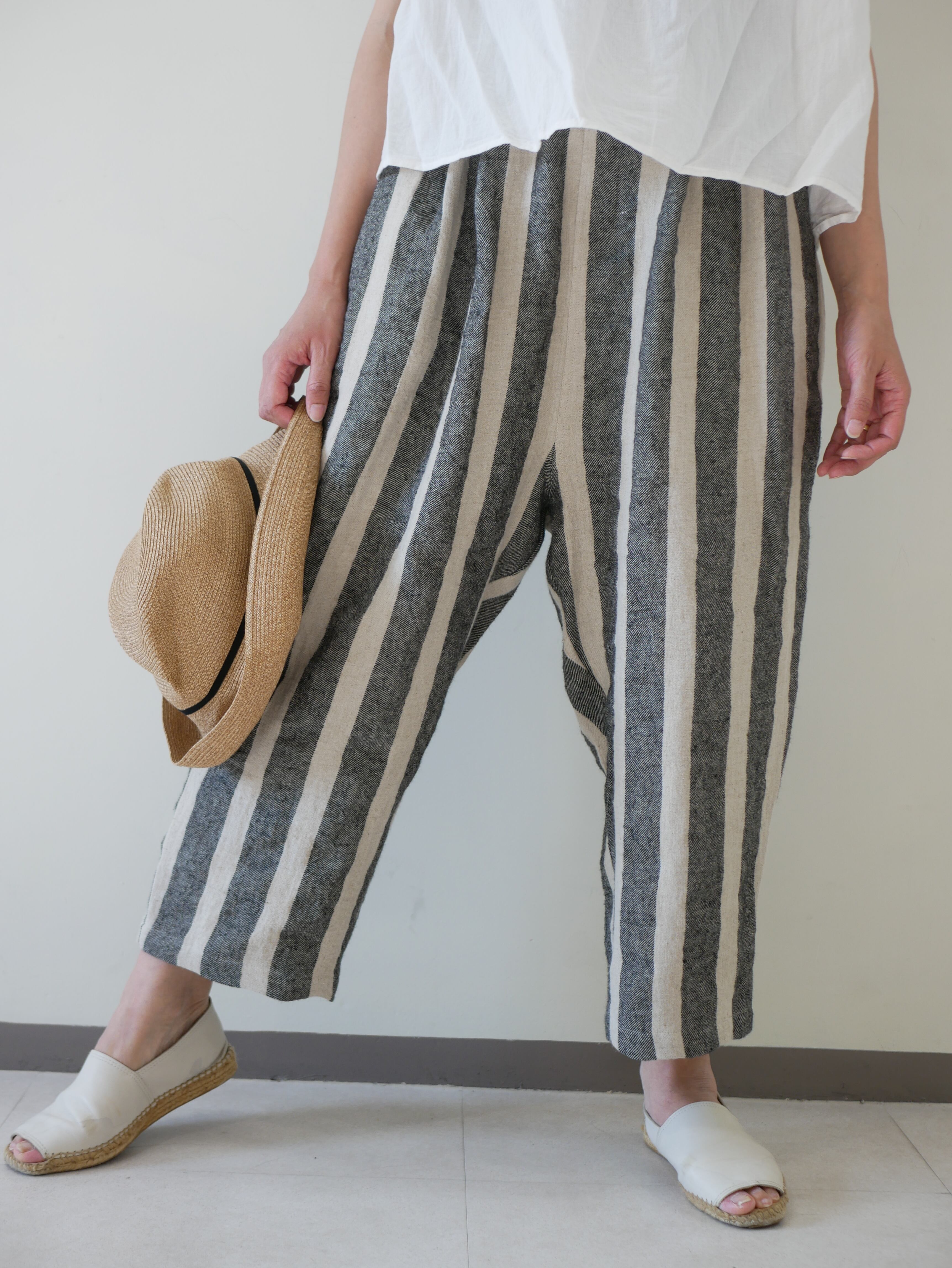 リネンならではの風合いの柔らかいパンツです。太めのストライプですが綾目に柄がでてるので、ソフトな印象のストライプです。ウェスト総ゴムと、紐で調節していただけます。両脇ポケット有り。少し厚手ですが、リネンなので、涼しく履いていただけます。