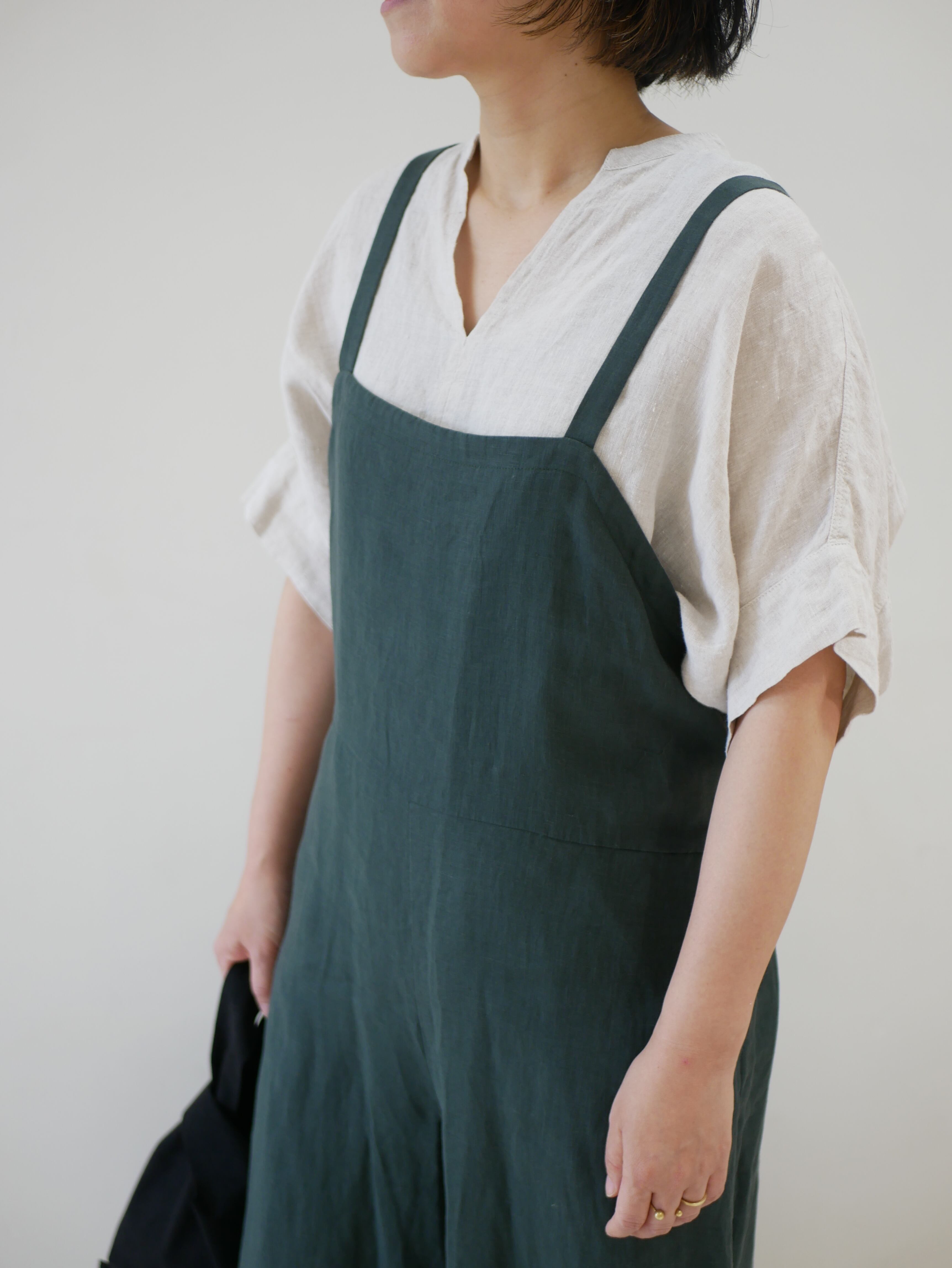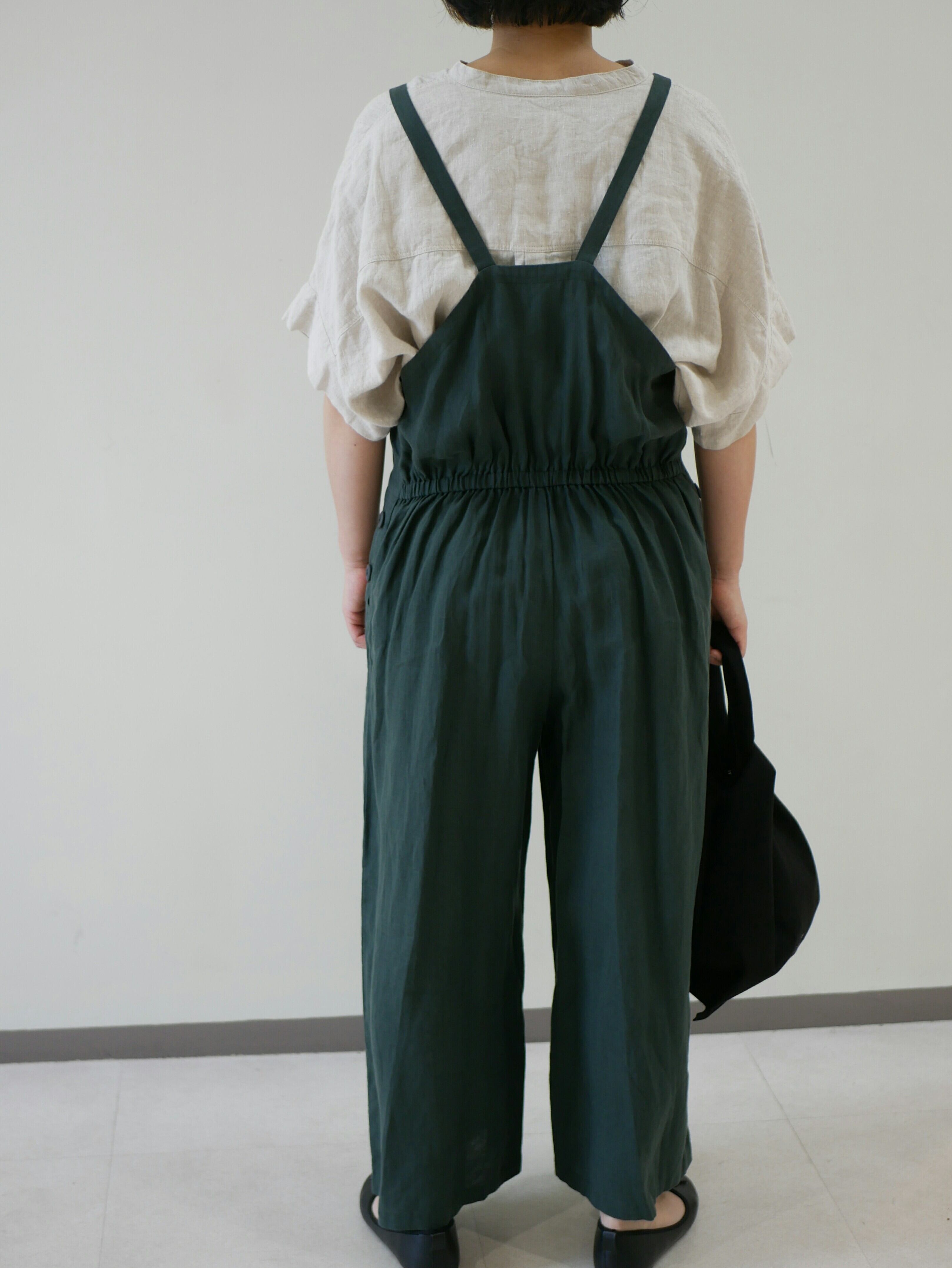 柔らかいリネンのオールインワン。前はシンプルなデザイン。後ろにギャザーが入り可愛いシルエットです。両脇ポケット上に飾りボタンが2つずつついてます。長めの左脇ファスナーで着脱していただけます。肩紐調節はなしです。インナーにTシャツやブラウスを重ねて楽しんでくださいね。お洗濯可能。