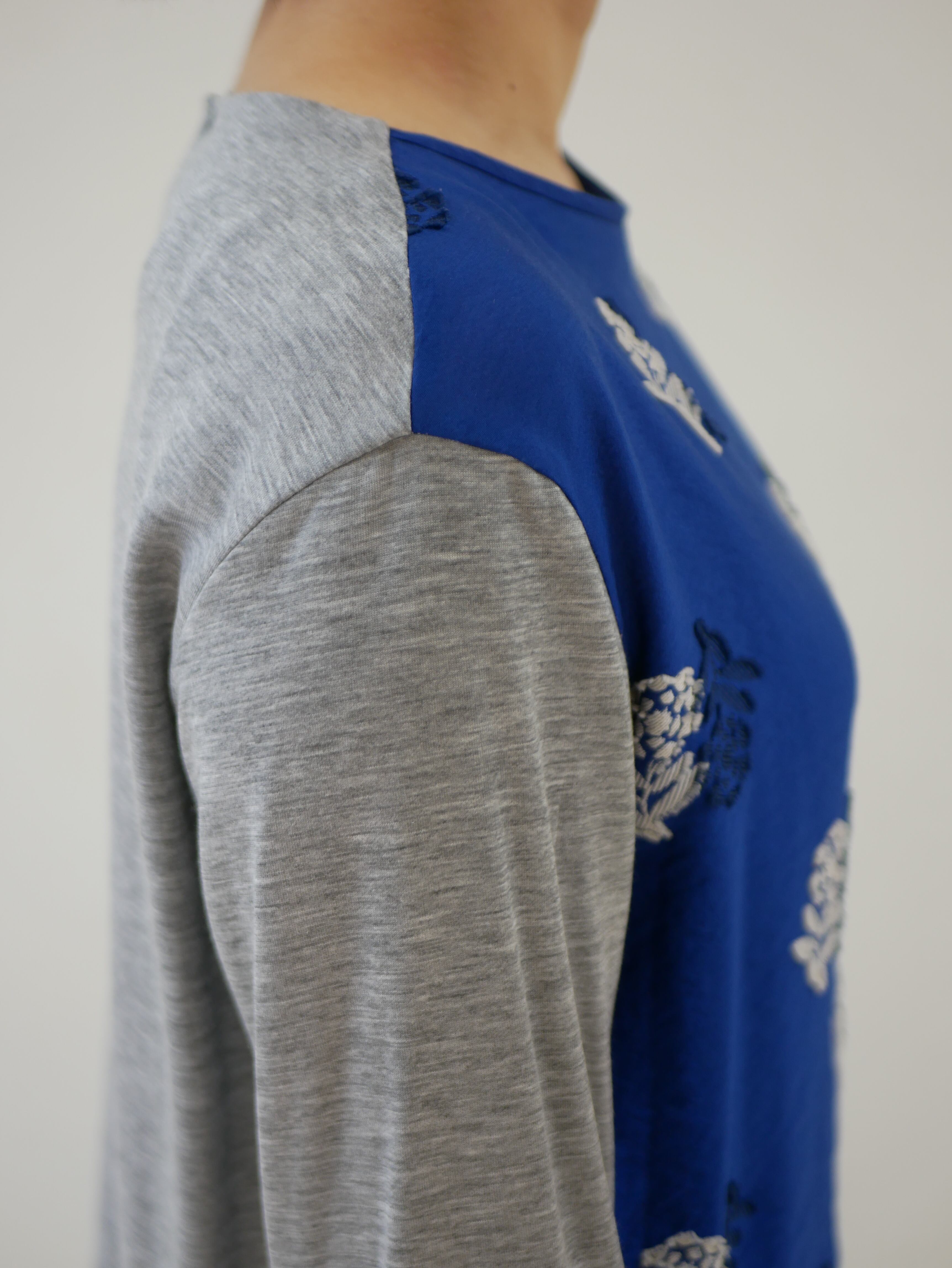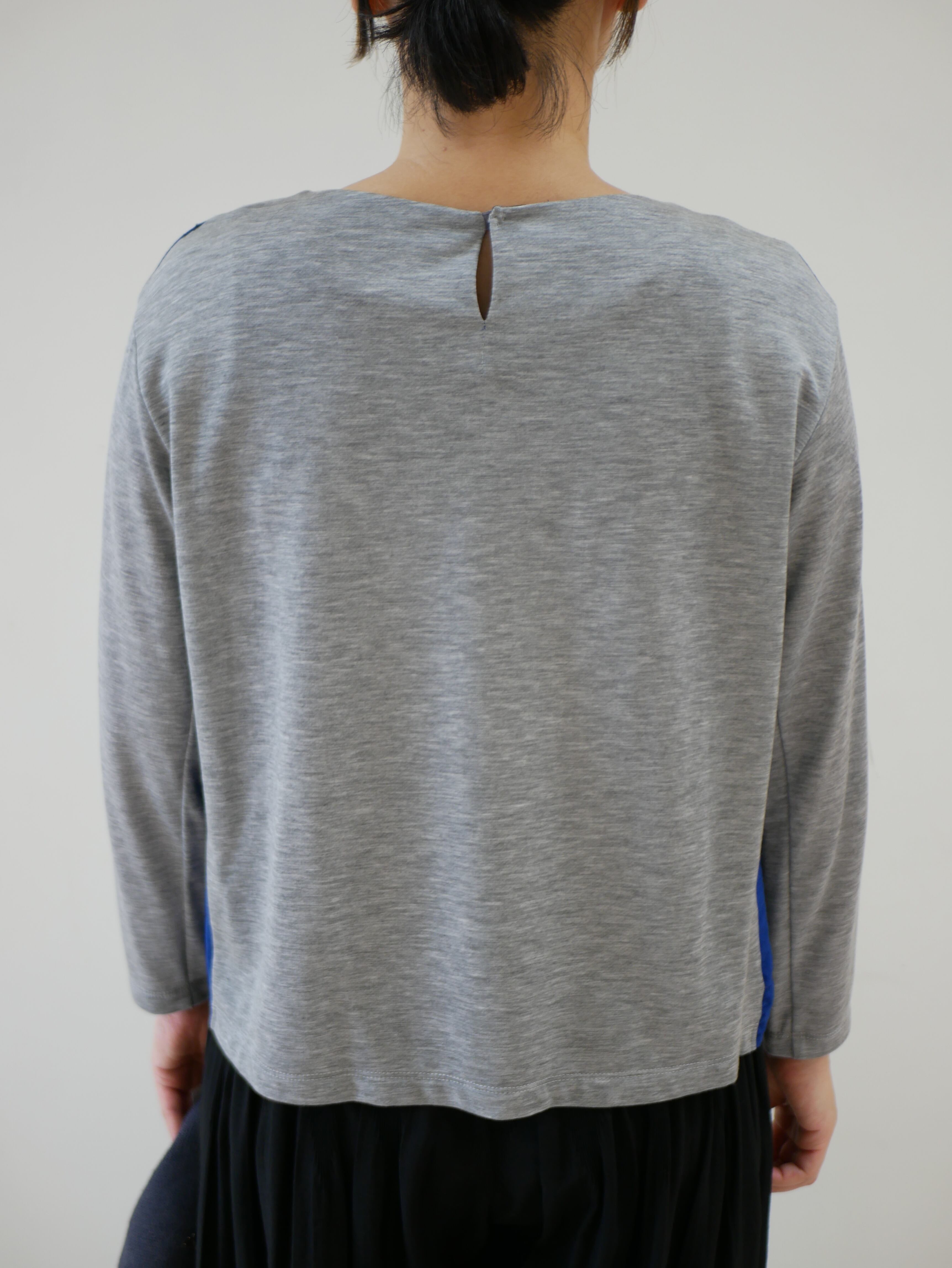 前身頃はカットジャガード。お袖と後ろ身頃はカットソーです。後ろはホック一つで、開閉です。ボリュームあるボトムスにもバランス良く着ていただけます。お洗濯可能。