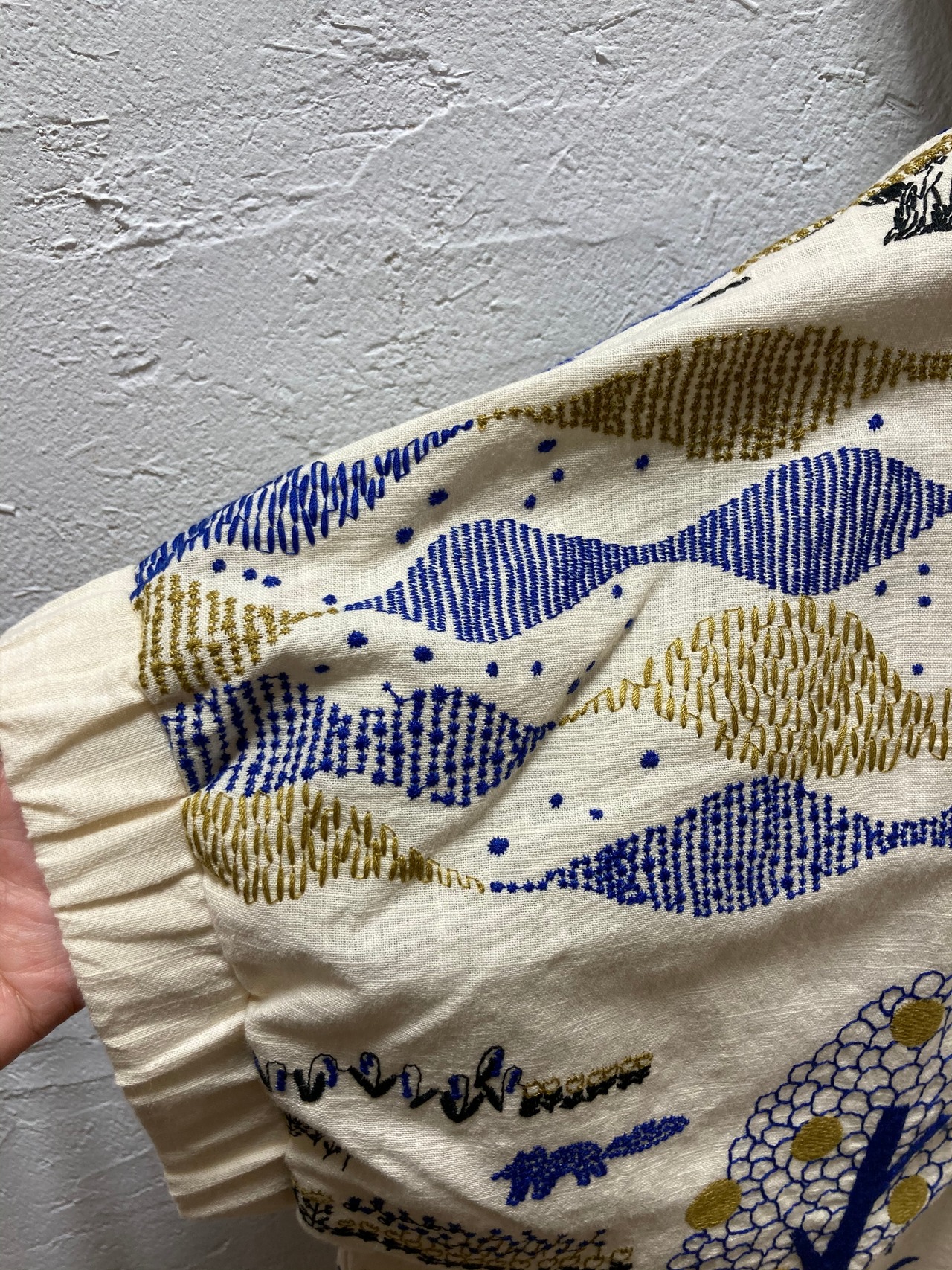 スッキリしたデザインです。今は中に長袖を着て、夏は一枚で着ていただけます。袖口はゴムが入りゆるく、ギャザーになります。服に描かれた細やかな風景刺繍を楽しんでいただけます。