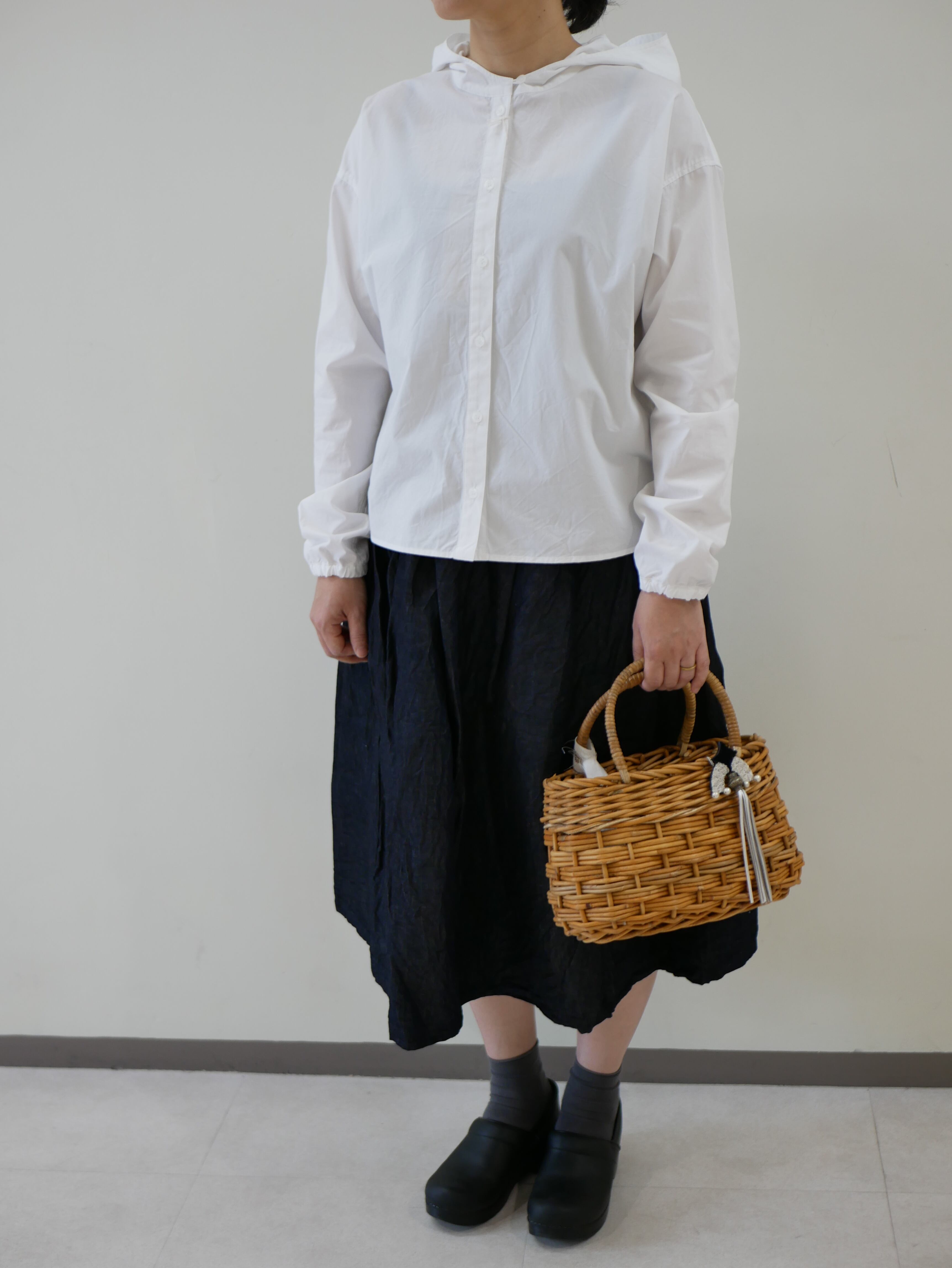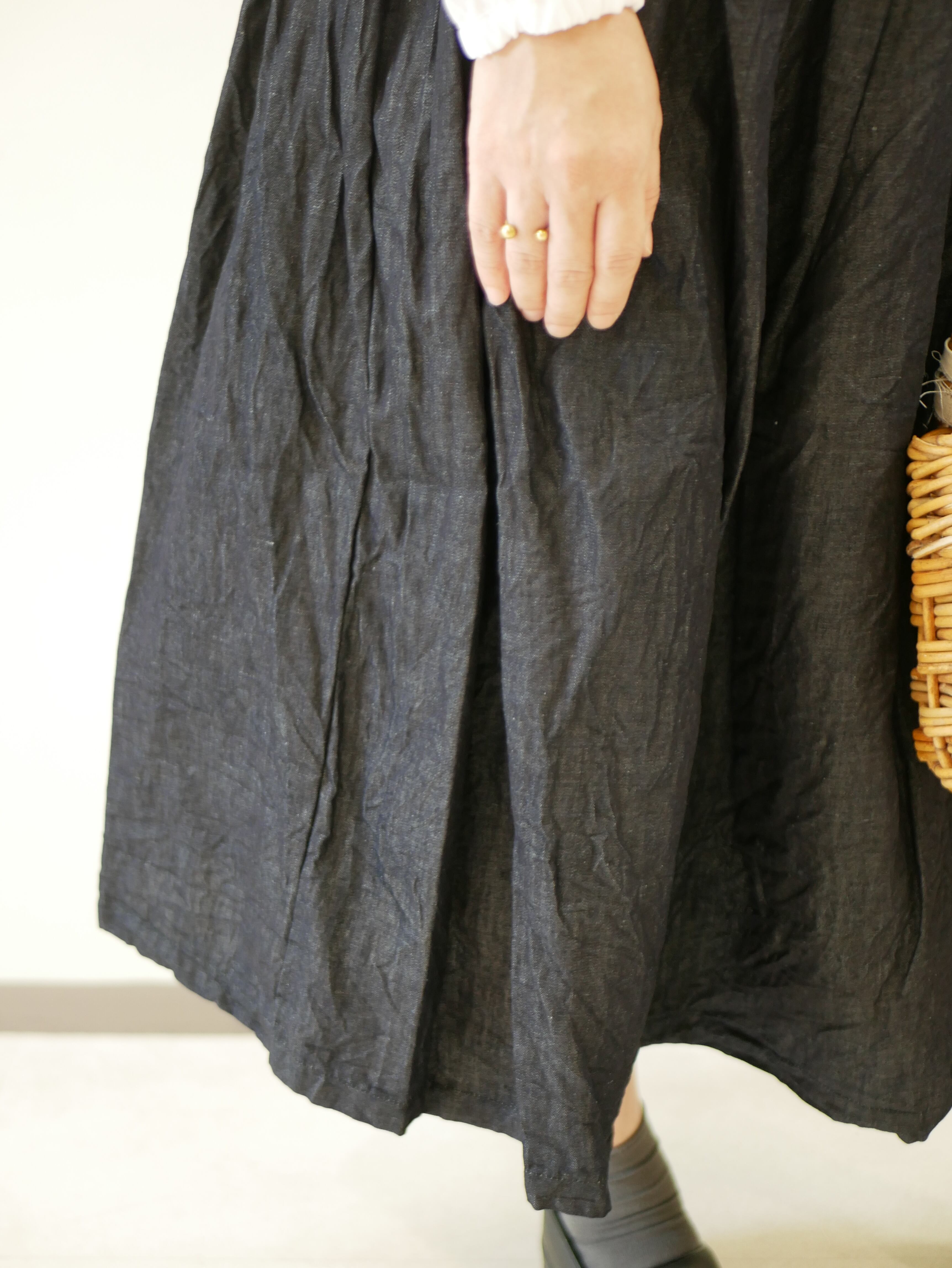 コットンリネンの深いインディゴカラーの上質な生地。張りのあるライトデニムです。少し艶があります。肩紐は垂らしたり肩に掛けて頂いたり色々なトップスと合わせていただけます。自然なシワ感も雰囲気がありナチュラルな中に少しモードな雰囲気も漂います。ウェスト総ゴム。片脇ポケット有ります。