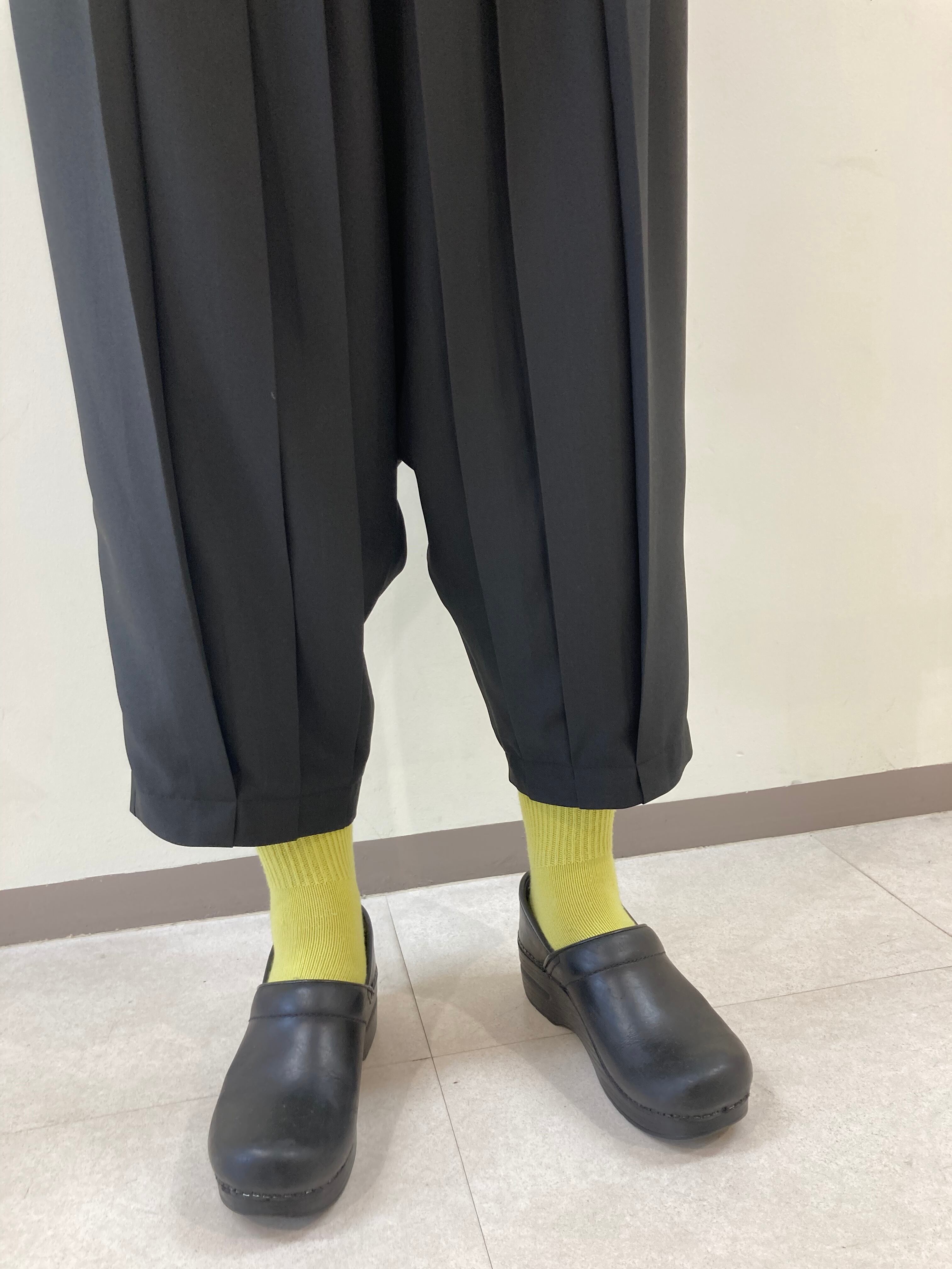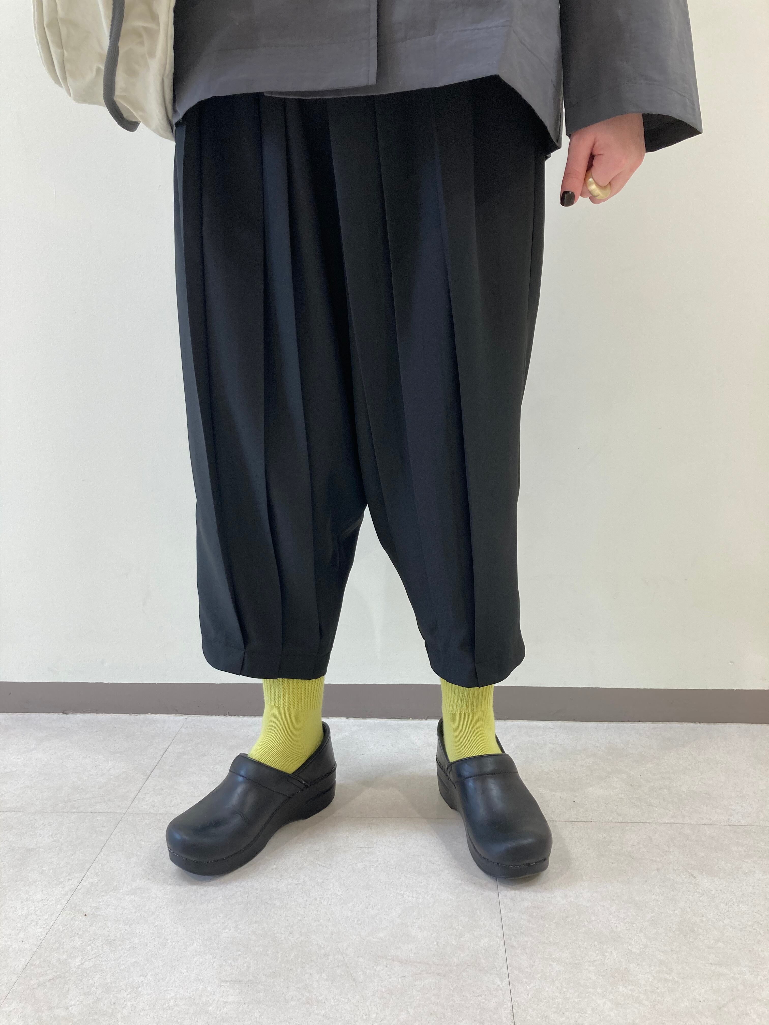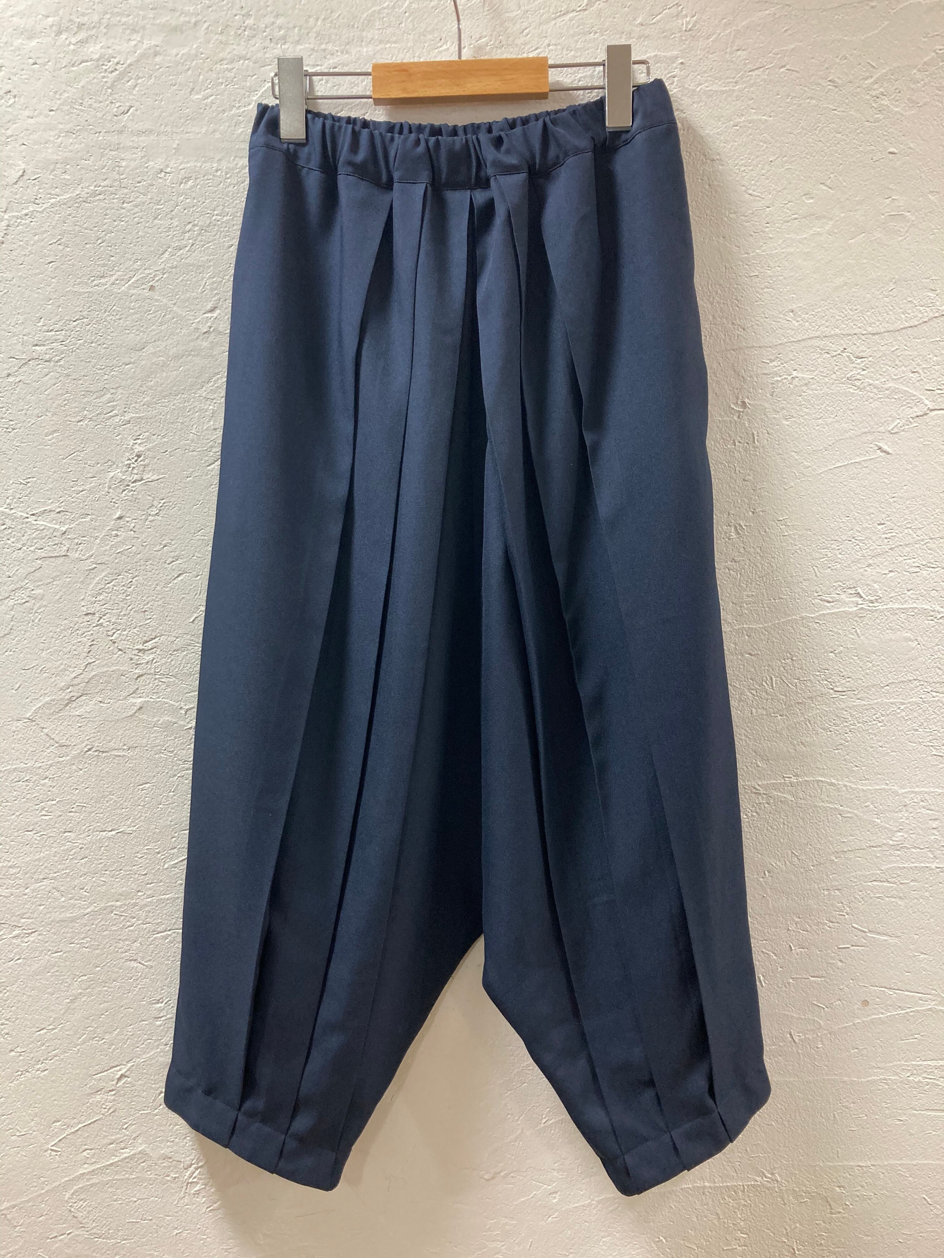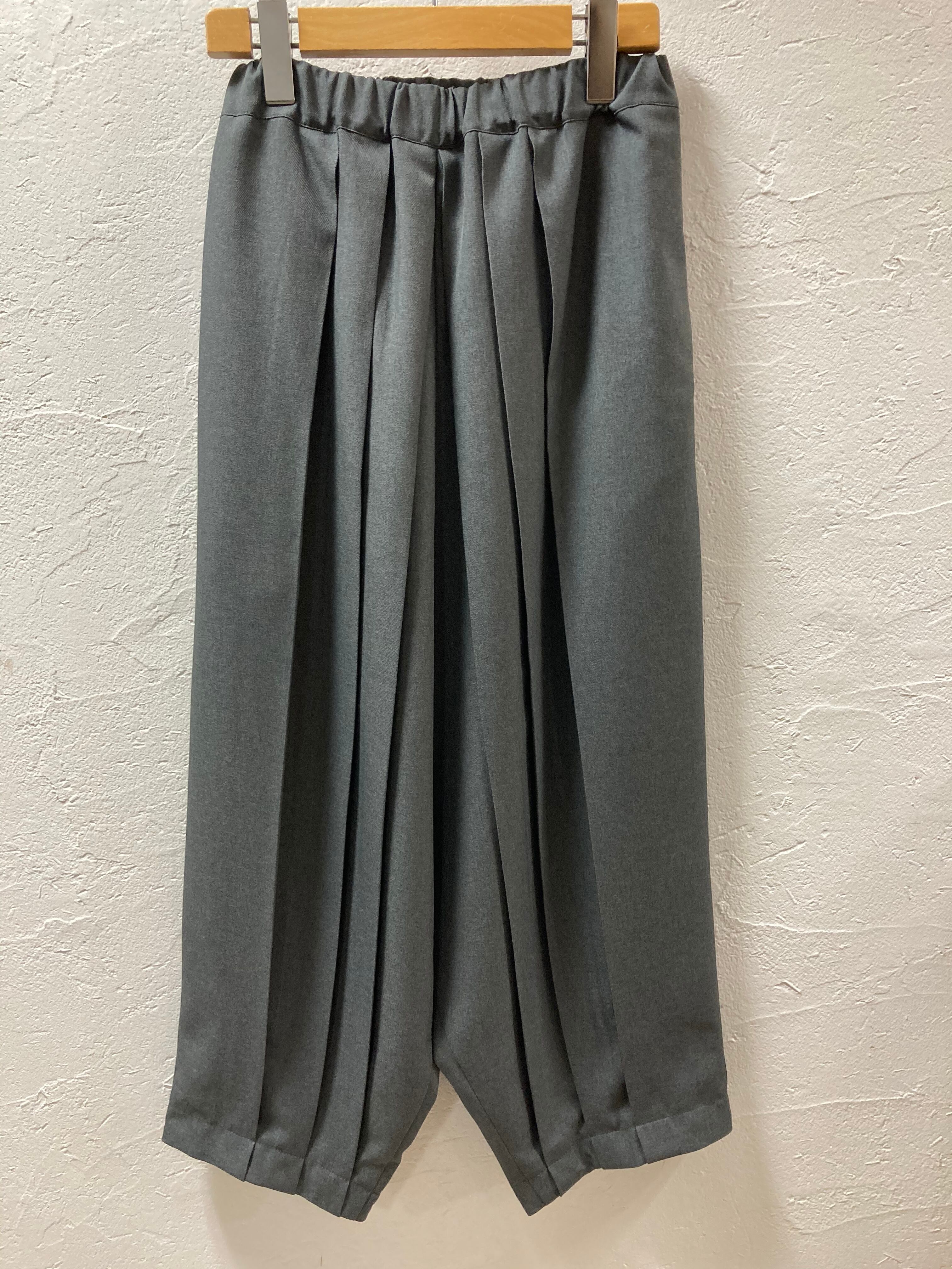前見頃のみプリーツの入ったパンツ。裾ステッチで留めてあります。両脇と、後ろ見頃はすっきりです。素材が綺麗なので、カジュアルになりすぎず履いていただけます。ウェスト総ゴム両脇ポケット有ります。お洗濯可能。