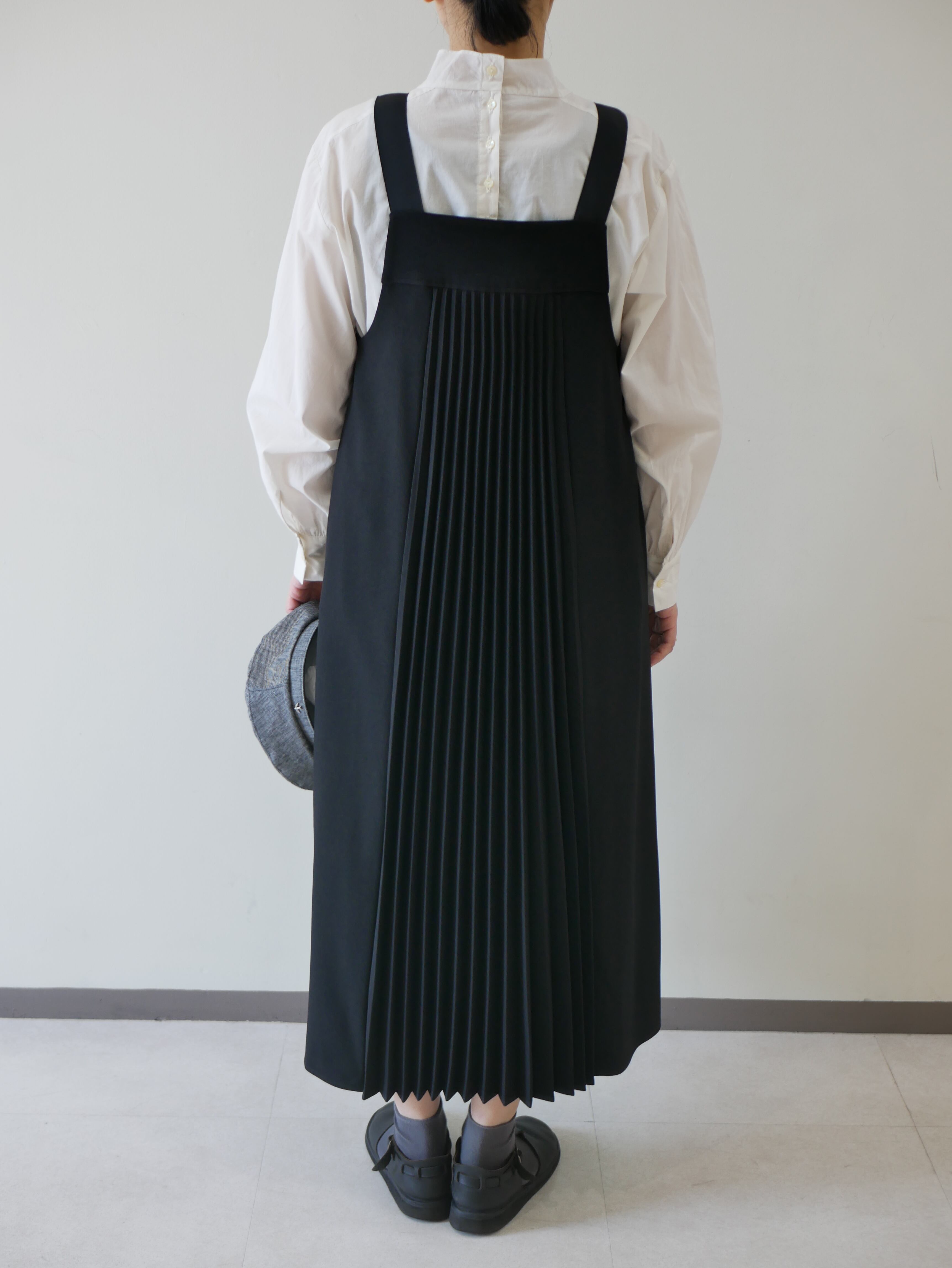 センターにプリーツが入ったジャンパースカート。2wayでどちらを前にしても、着ていただけます。生地は中厚で、ブラウスと合わせたり、Tシャツやニットと合わせていただけます。肩紐部分はグログランテープ。被って着脱です。両脇にポケット。