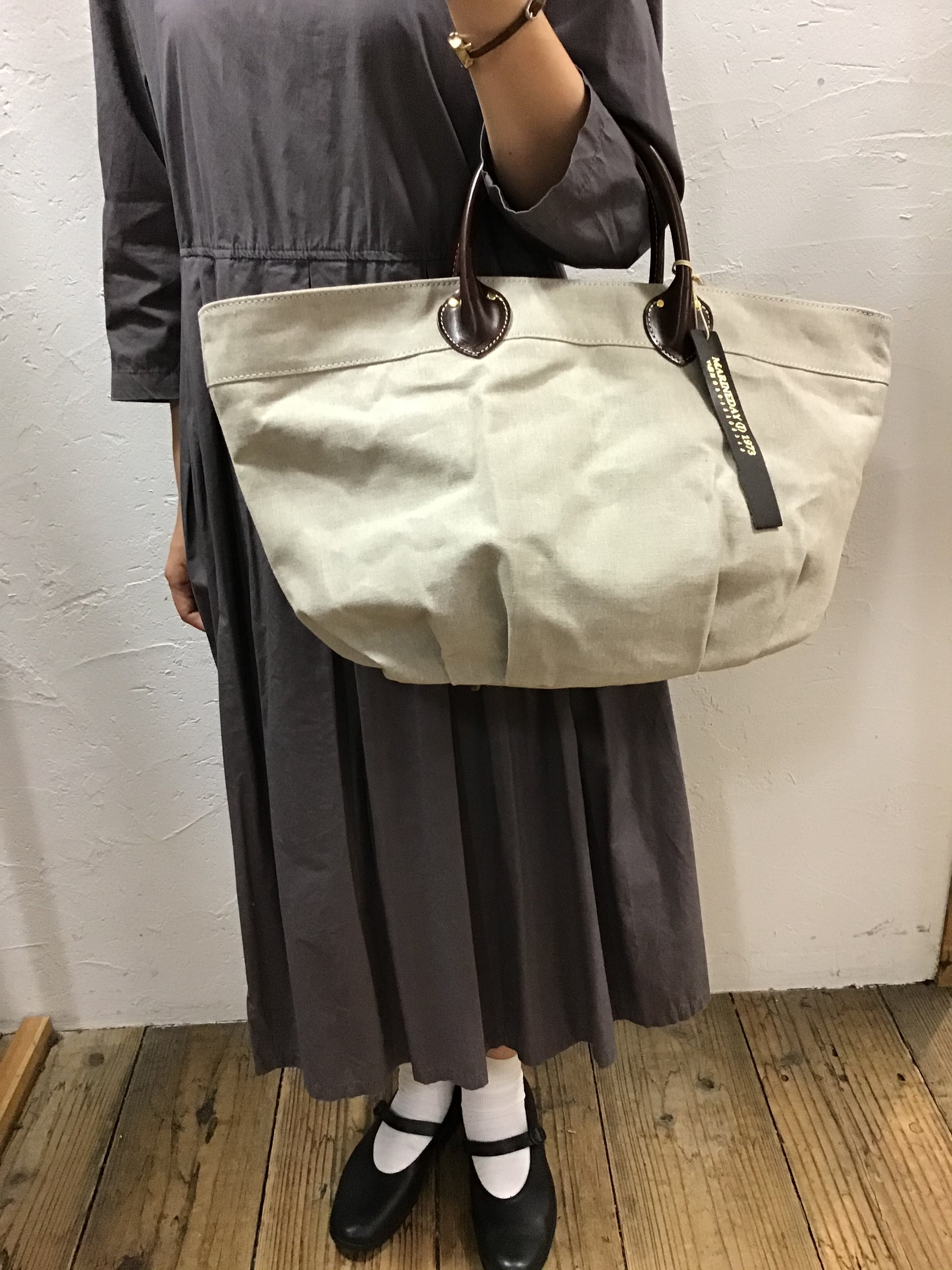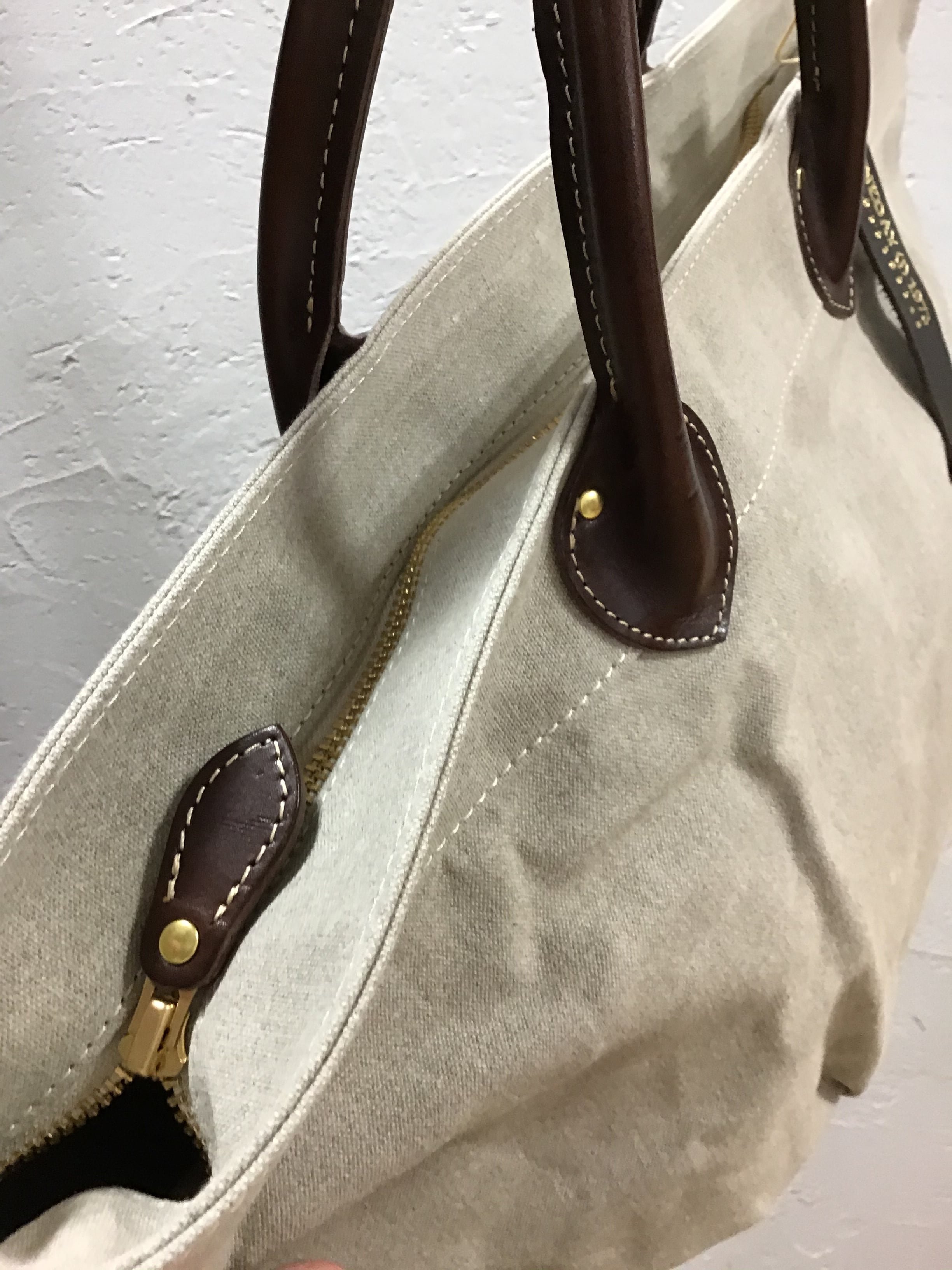 麻の帆布にレザーの持ち手を組み合わせた舟型トート。