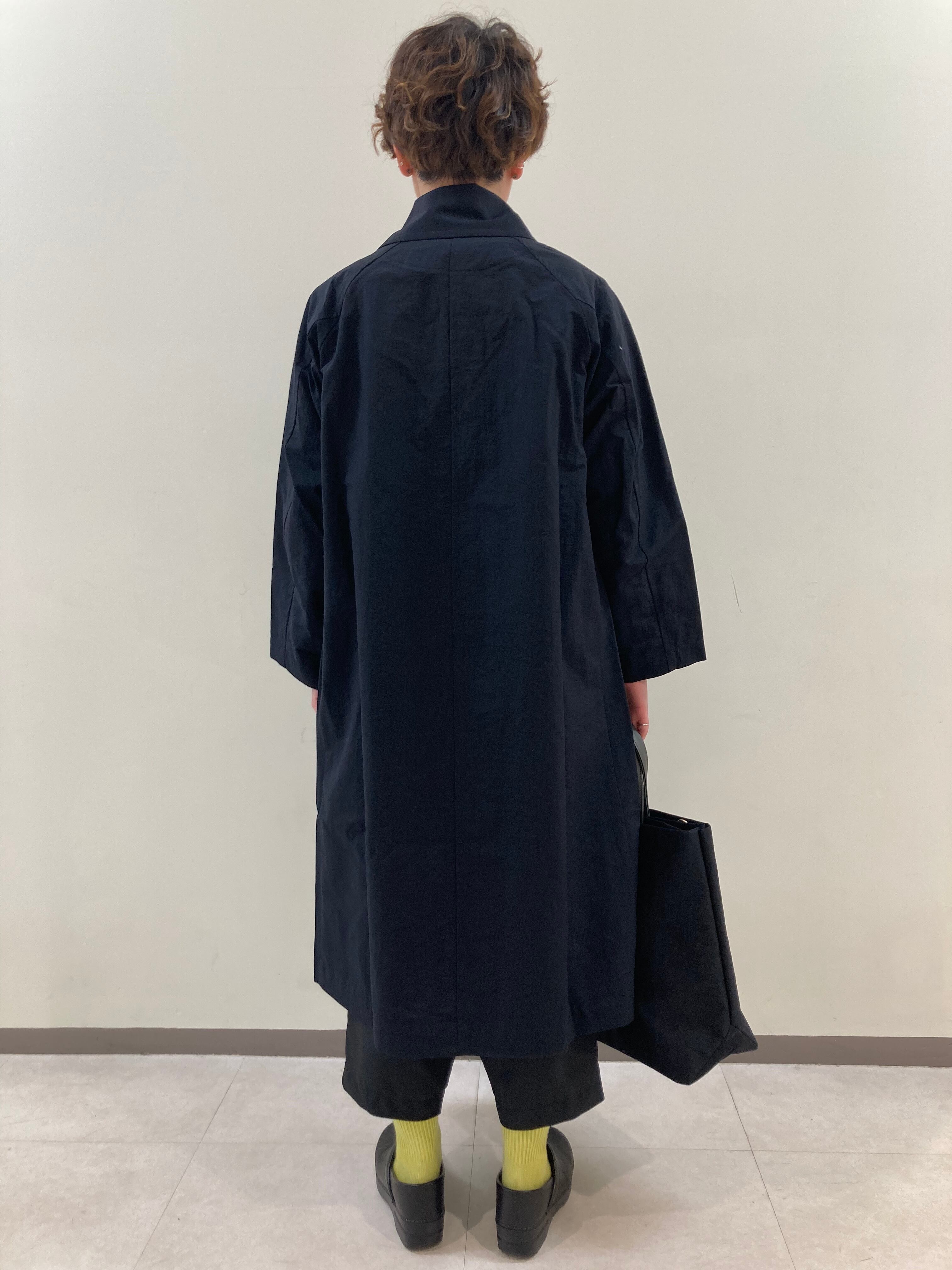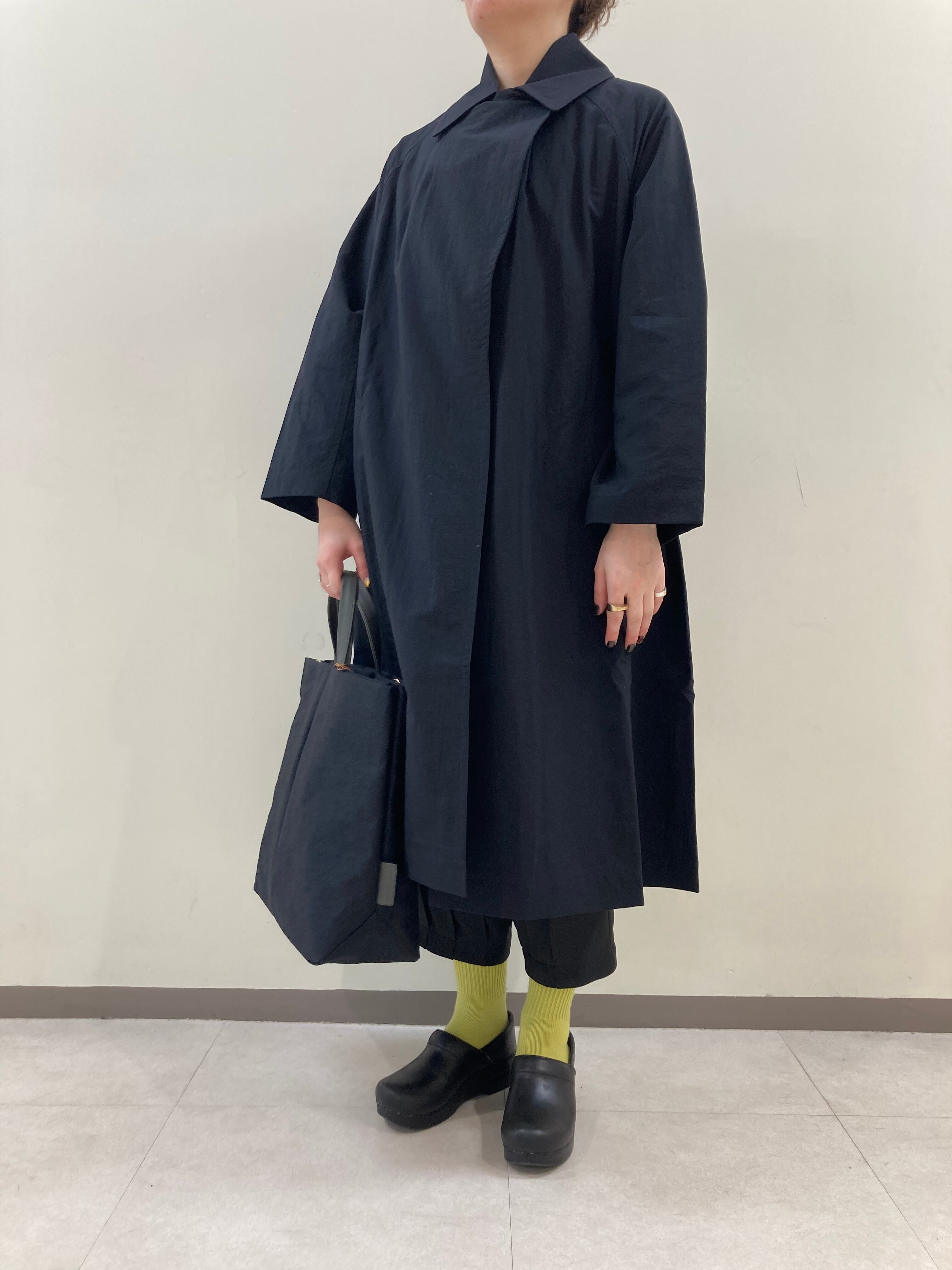 撥水加工されたナイロン素材のアウターです。メンズのトレンチコートをベースに、シンプルで存在感のあるものに仕上げがってます。マットな質感です。シワになりにくくとても軽いです。衿元にスナップボタンが、一つ付いてます。ラグランでお袖も楽ですよ。店頭でも人気の素材です。