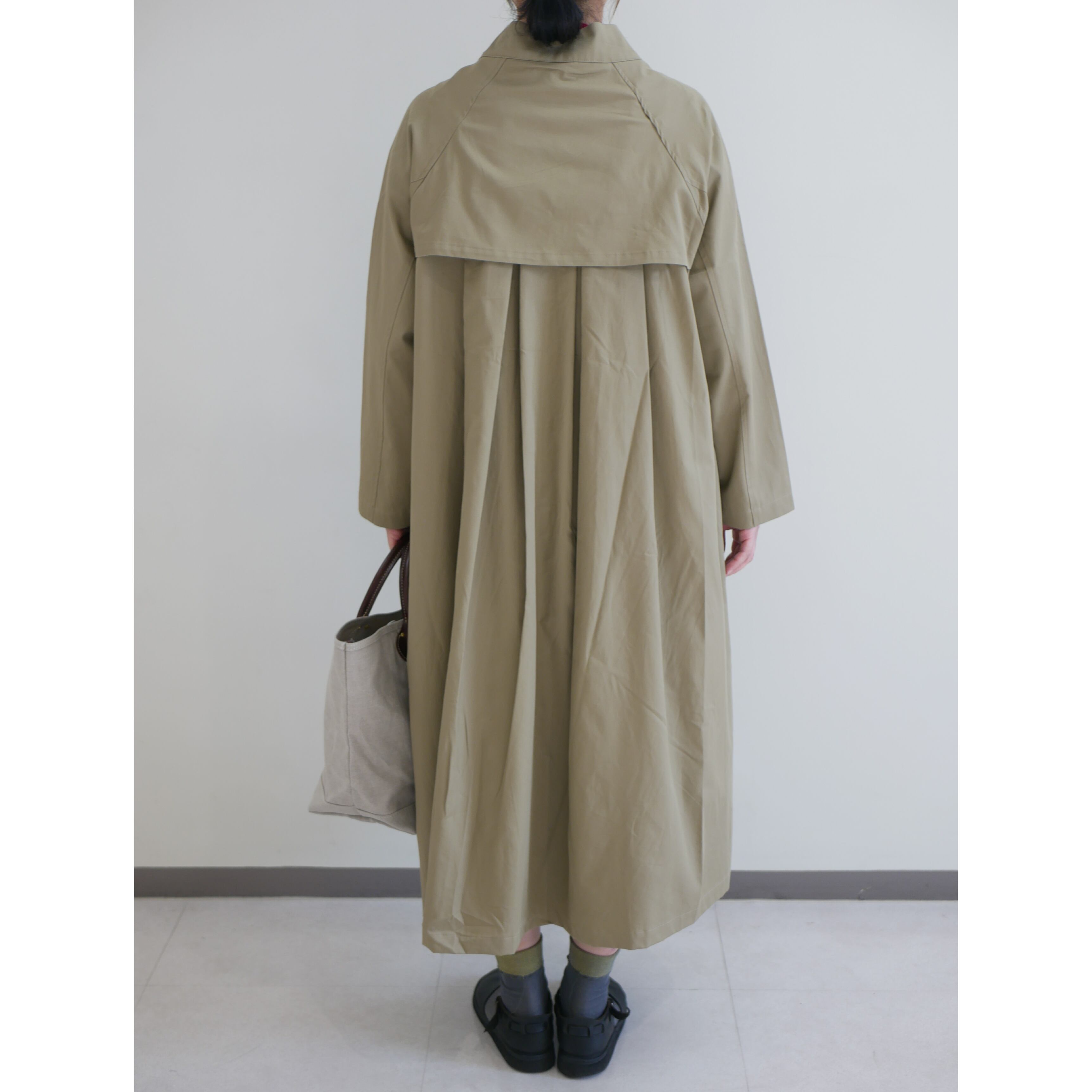 コットンバーバリー素材を使ったトレンチコートです。着丈を長くして、バックタックを入れることによって体を包み込むようなデザインになってます。前からの印象は比翼仕立てで、スッキリ見えます。裏地梨ラなし。ラグランでお袖も楽ですよ。お洗濯可能。