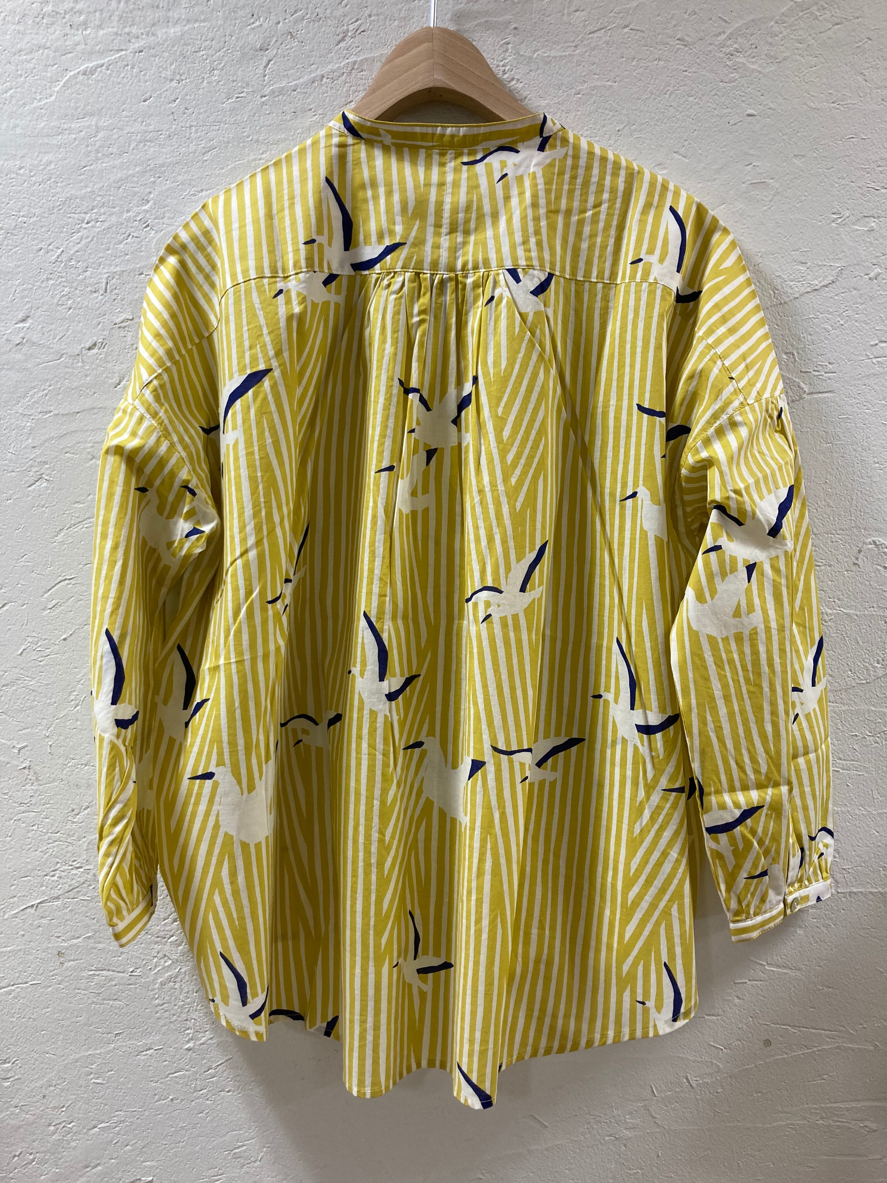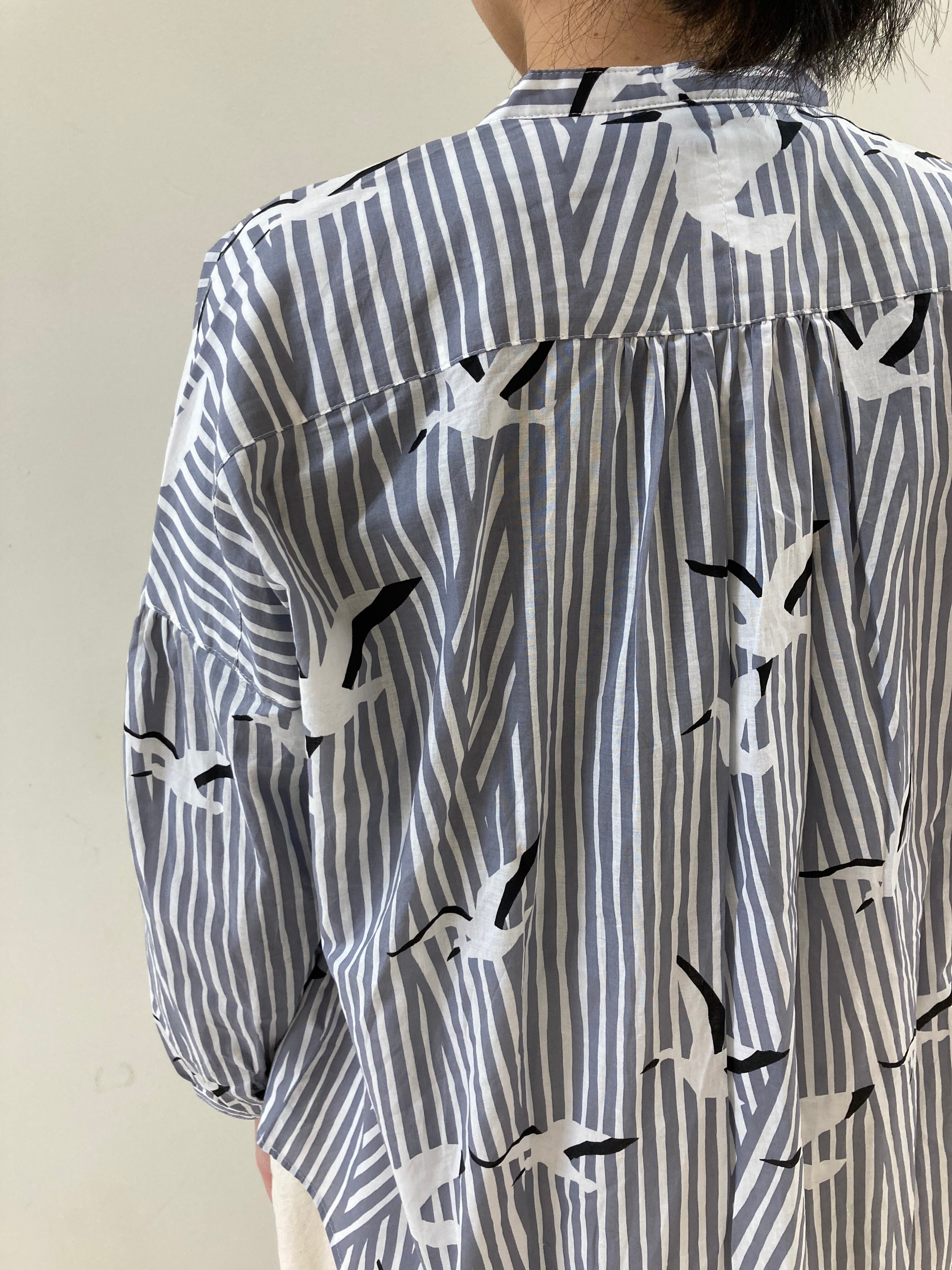 ノーカラーのふんわりしたブラウスです。柔らかい綿素材は夏まで着ていただけますよ。後ろは切り替え下に少しギャザーがあり立体的なシルエットです。単なるストライププリントではなく、いろんな向きにラインが走っていてとても奥行きのあるテキスタイルです。裾は緩やかにカーブしてます。お洗濯可能。