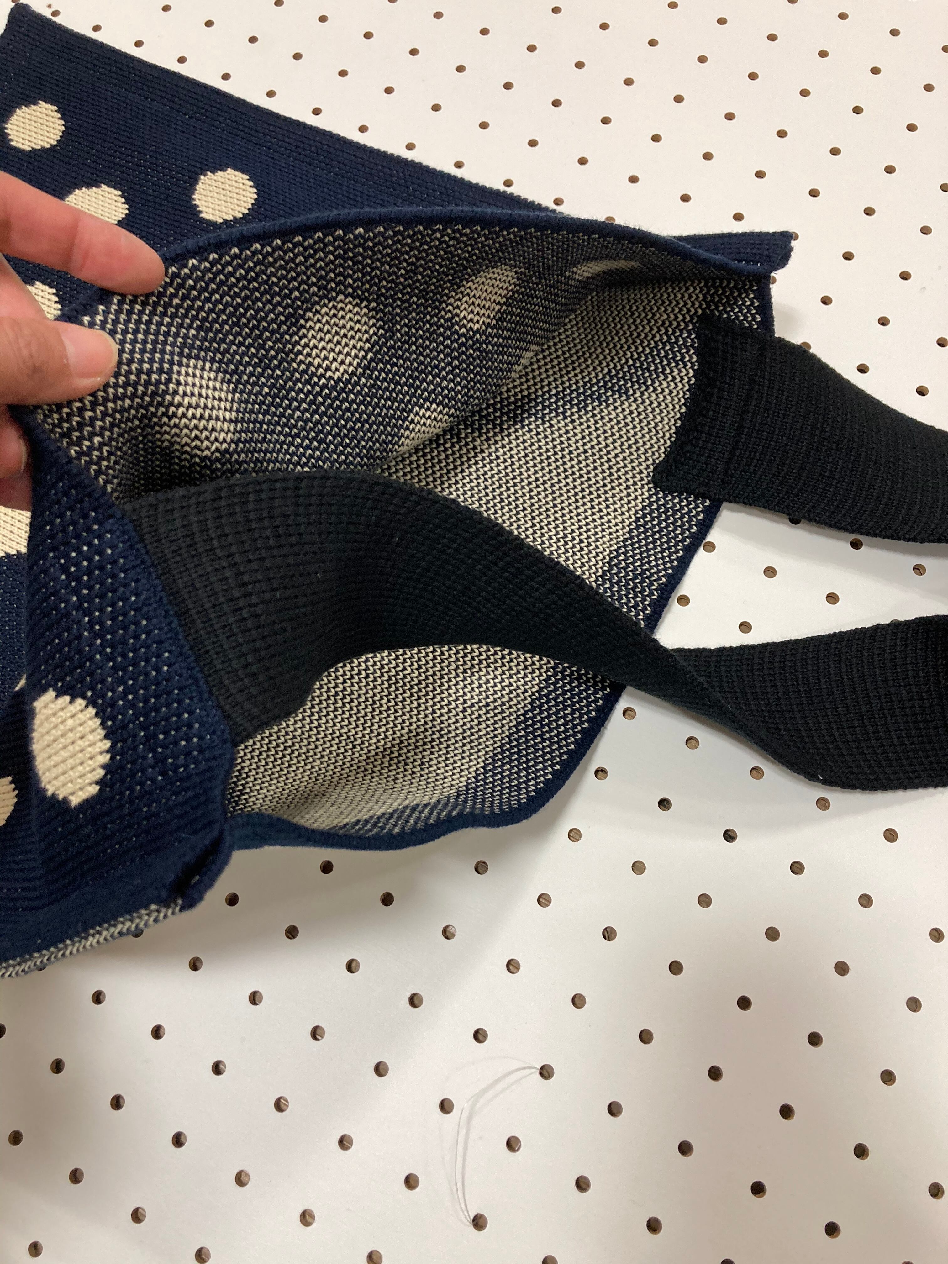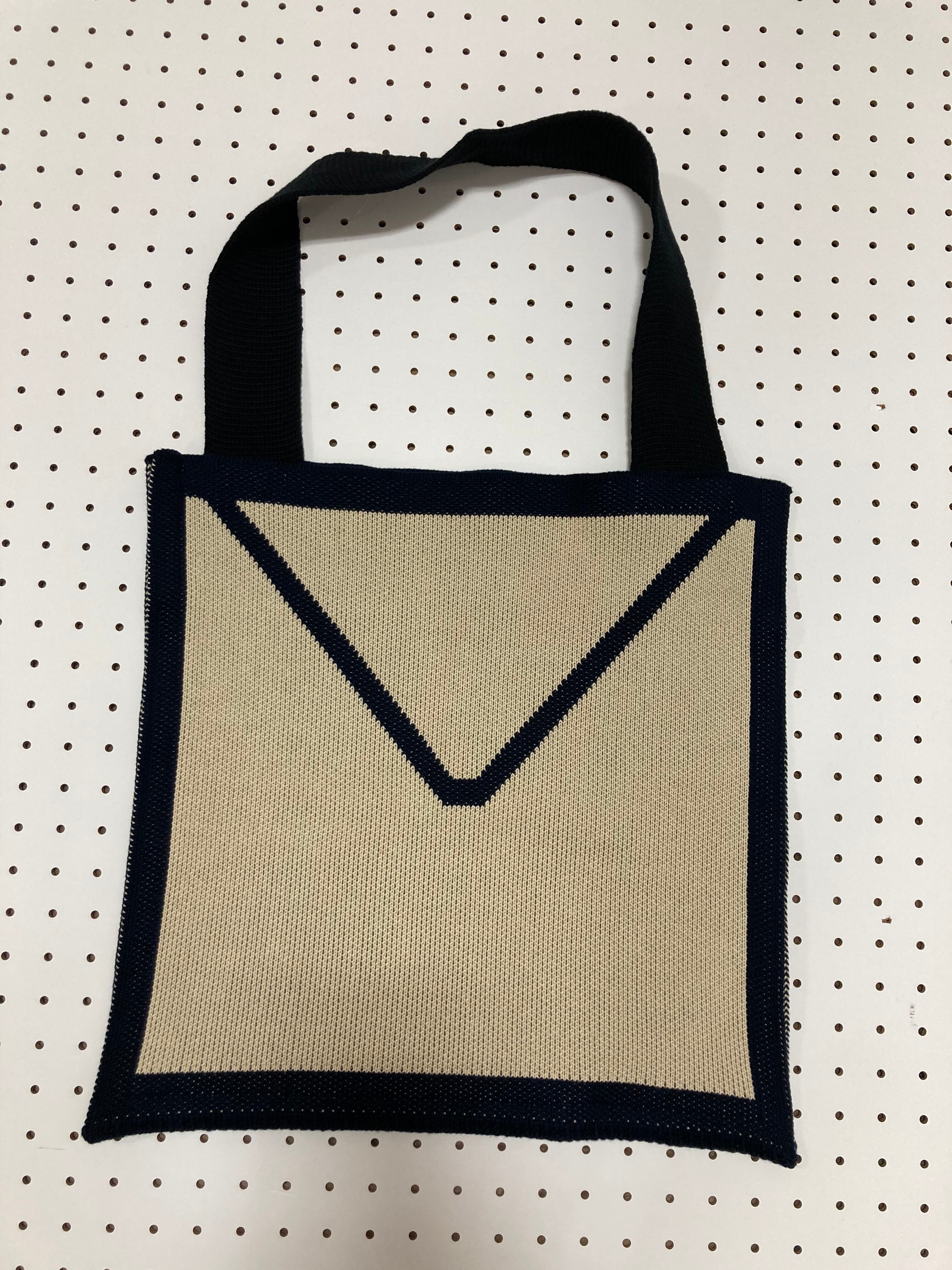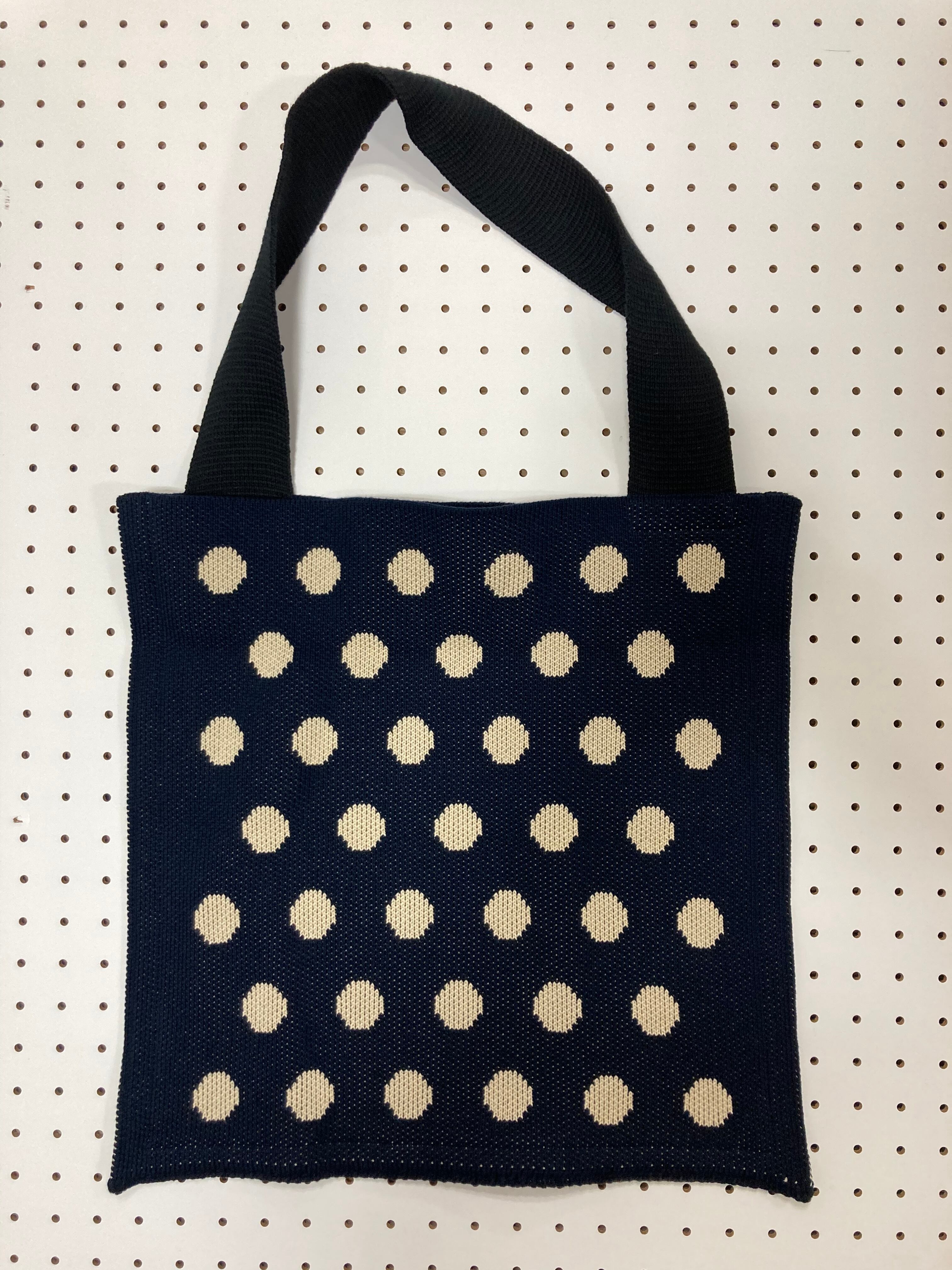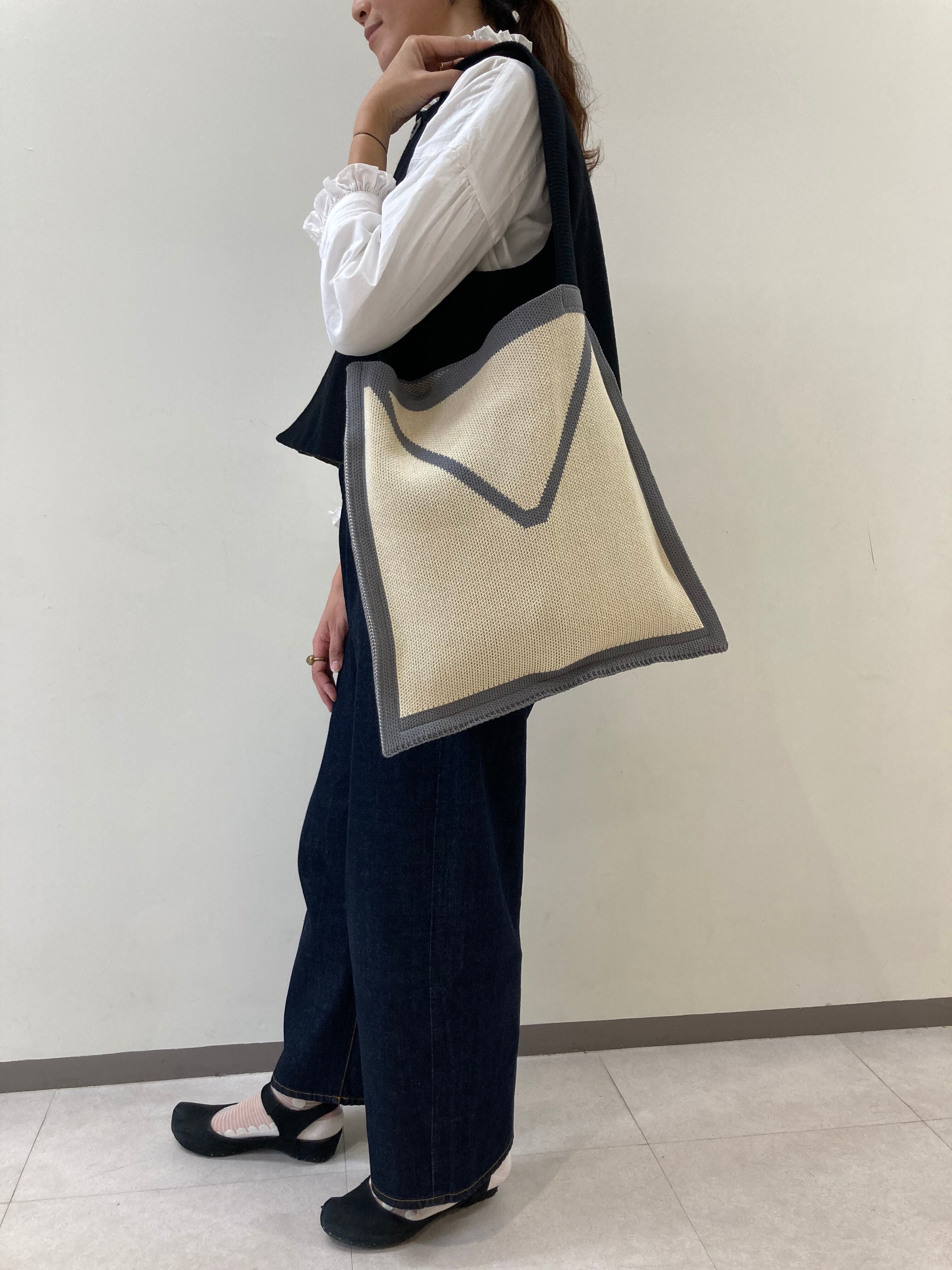綿糸で編み立てたジャガード柄のニットショルダーバッグです。両面の柄が違うので、気分に合わせて使い分けできます。着こなしのポイントになる楽しい1点です。