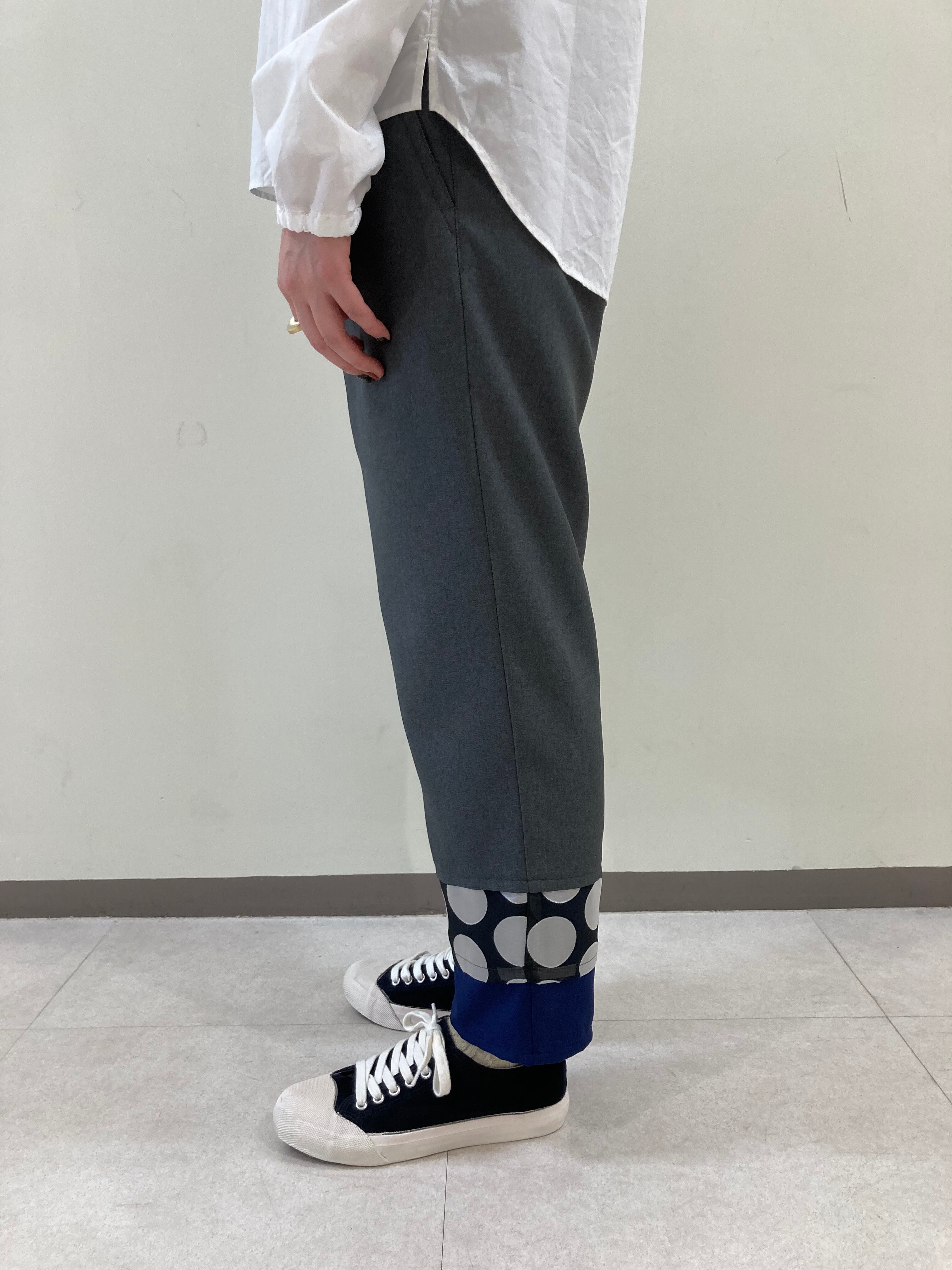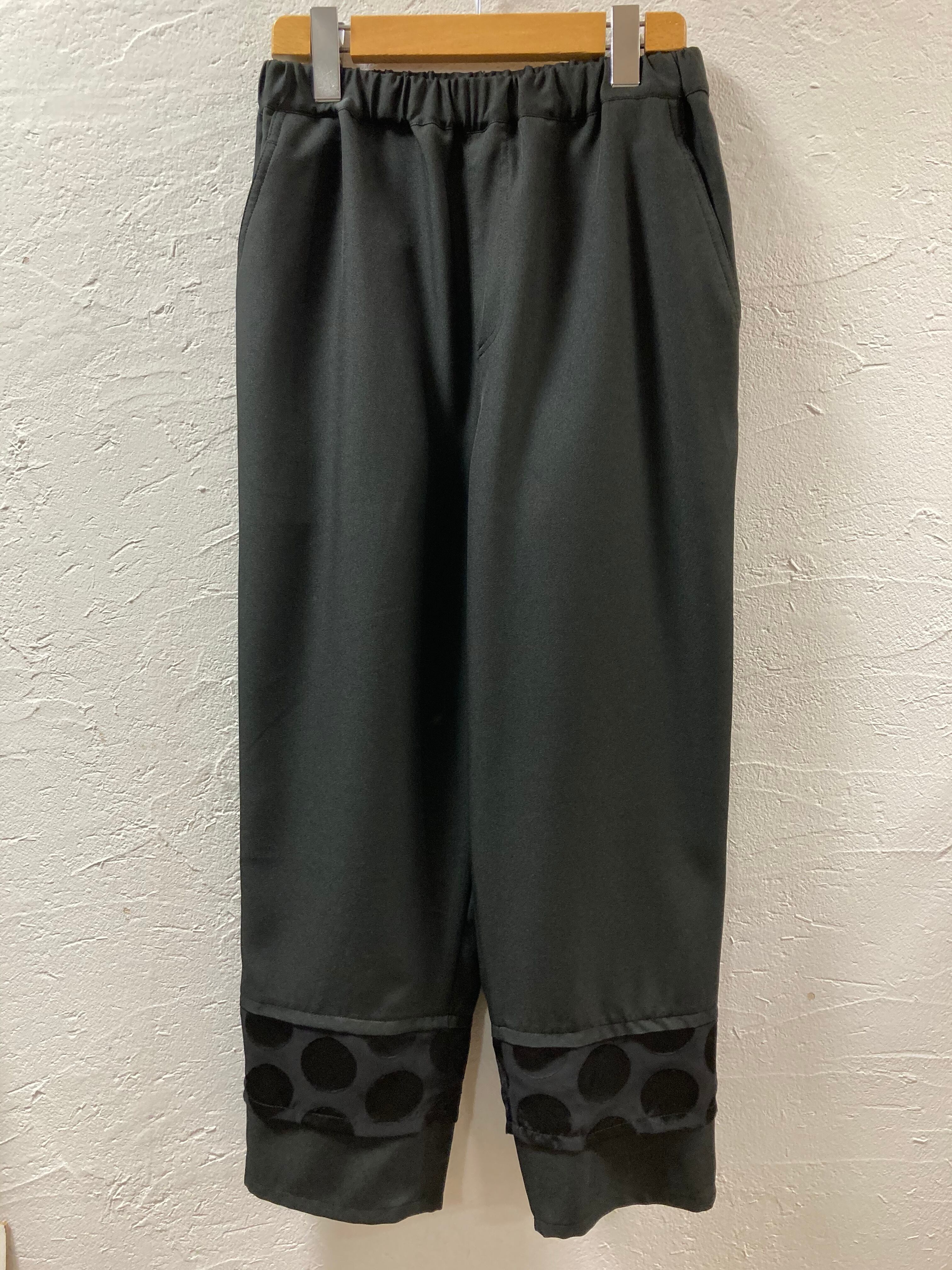 生地は中厚地。落ち感のある、生地でストレッチはありません。ウェストは総ゴムです。裾に、切り替えがあり透け感のあるドットの異素材が間に挟んであり三段階の切り替えに見えます。
