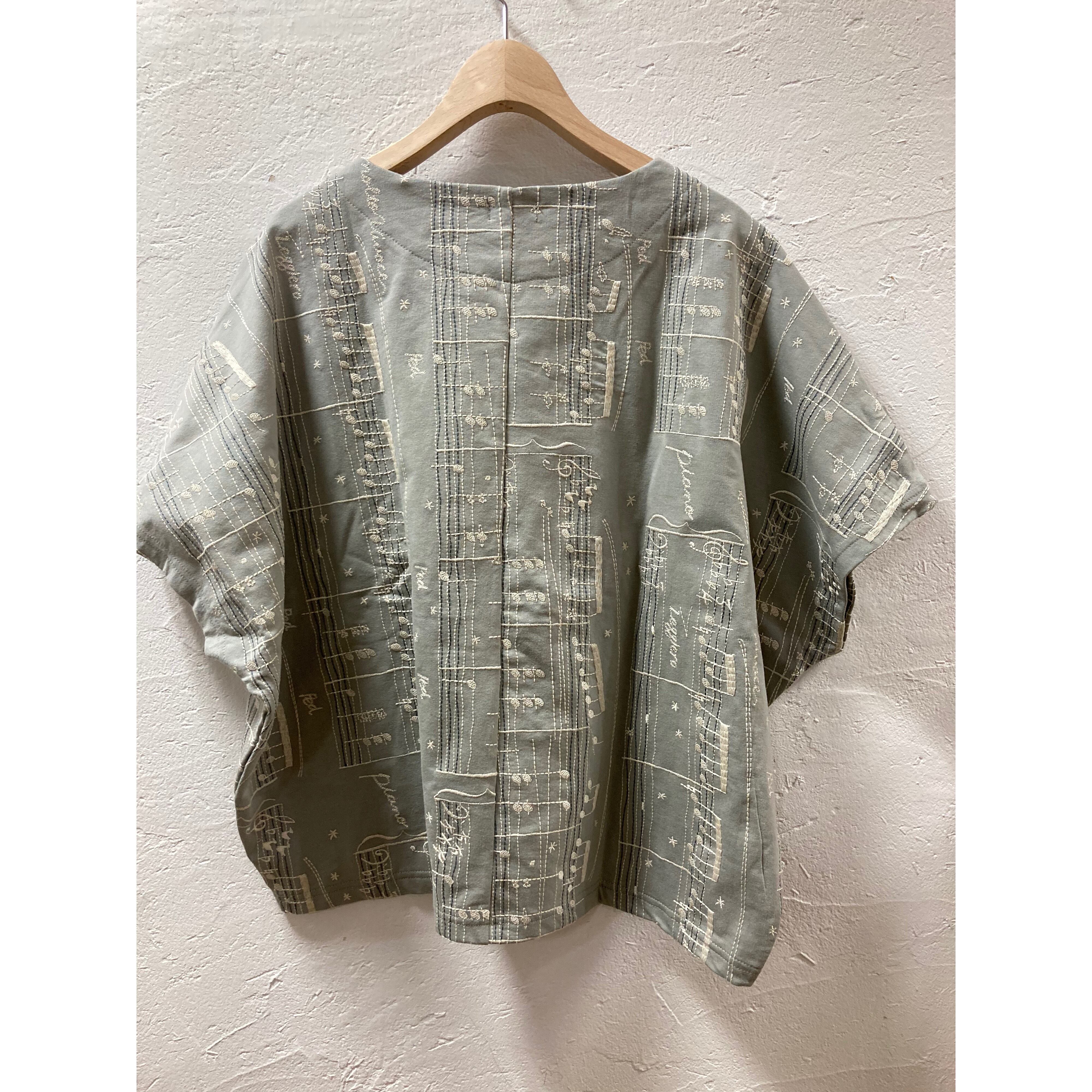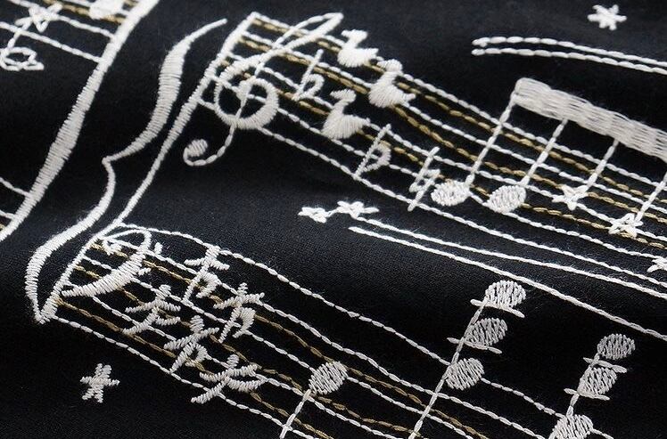 【EMB music】素敵な音楽は、暮らしに豊かさをあたえてくれるもの。楽譜をモチーフにしたリズミカルな柄を、カットソー生地に刺繍で表現しました。