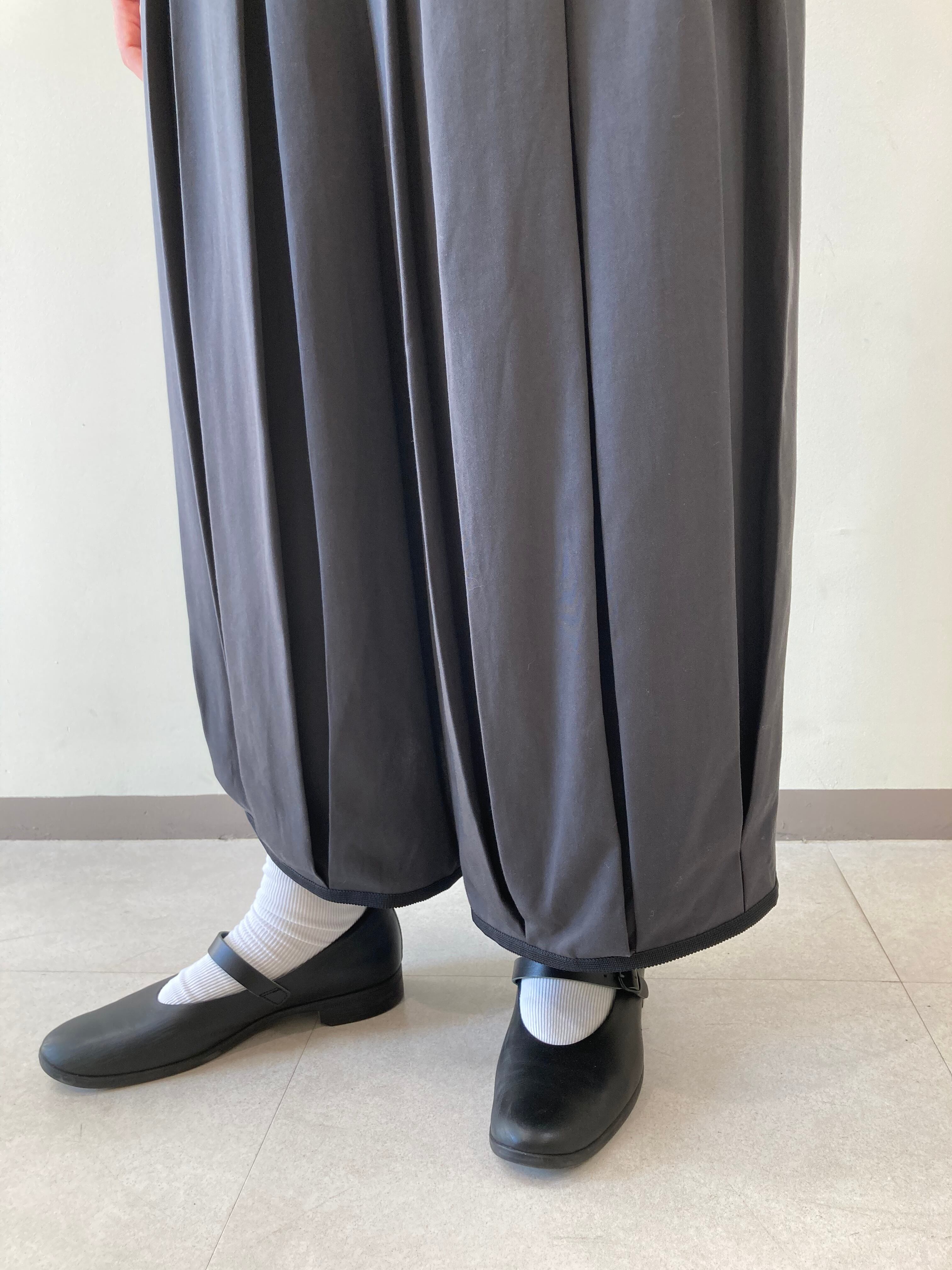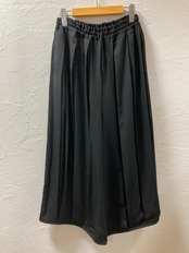 とろみのある生地で、季節問わず着ていただけます。前は立体的な太幅ボックスプリーツ。後ろはスッキリしたデザインです。広がりすぎず着ていただけます。ウェストはゴムと紐で調整。サイドにポケットがあります。お洗濯不可