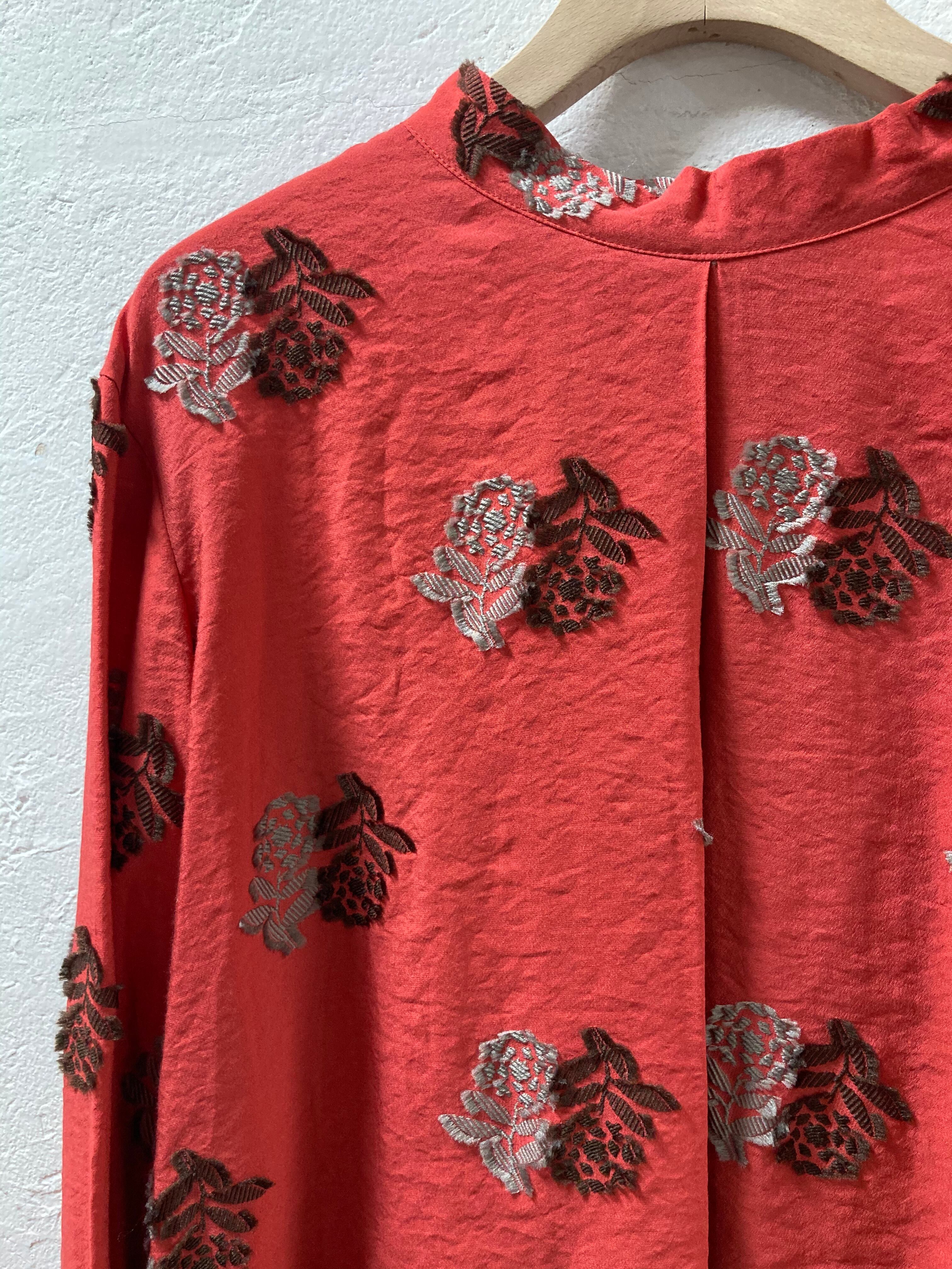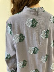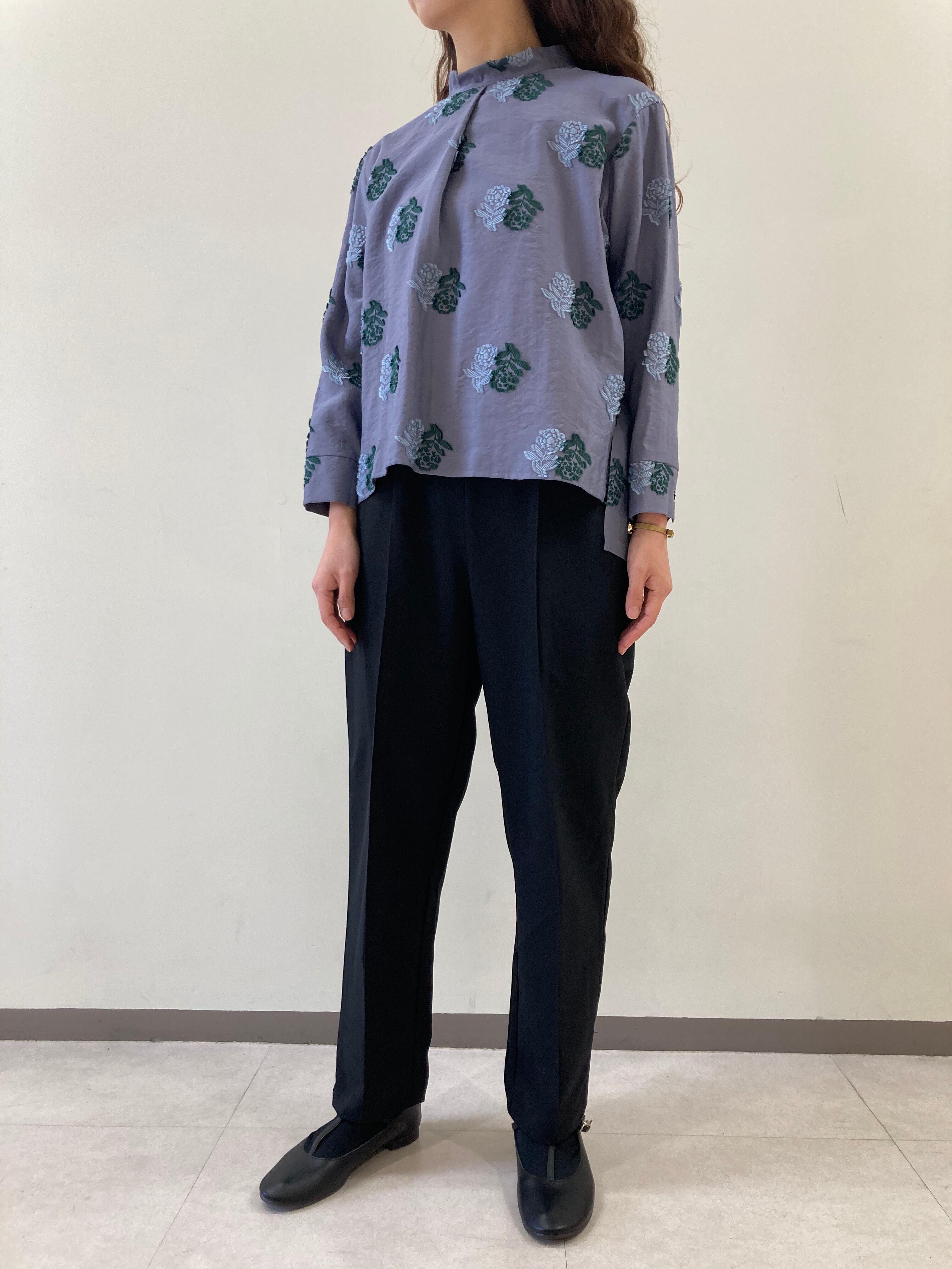 スタンドカラーの、カットジャガードブラウスです。立体感がありサラッとした着心地です。前に一つタックがあります。七分袖。後ろが長めのデザインです。きちんとしたボトムスにも、カジュアルなボトムスにも合わせて頂けます。お洗濯可能です。
