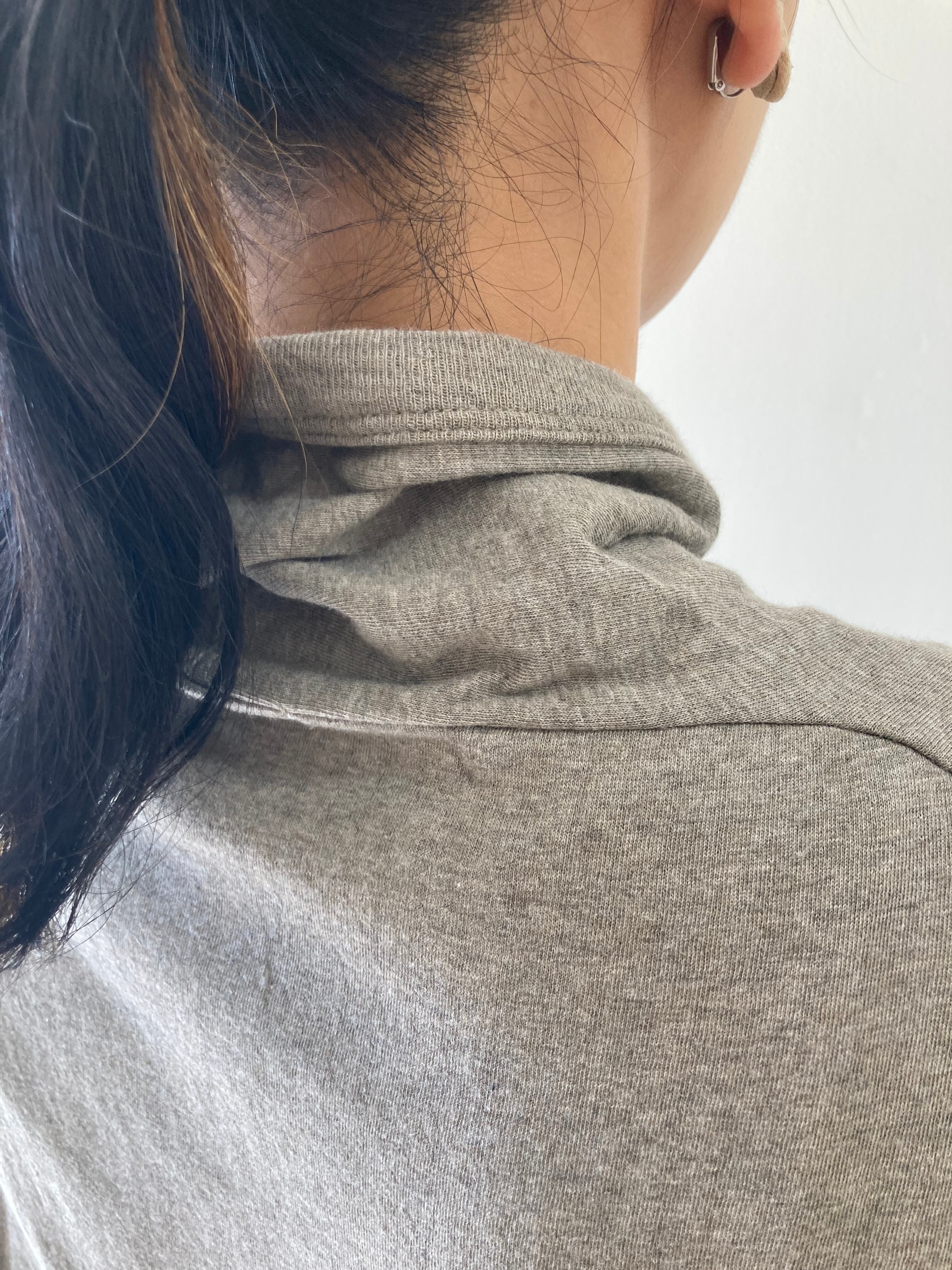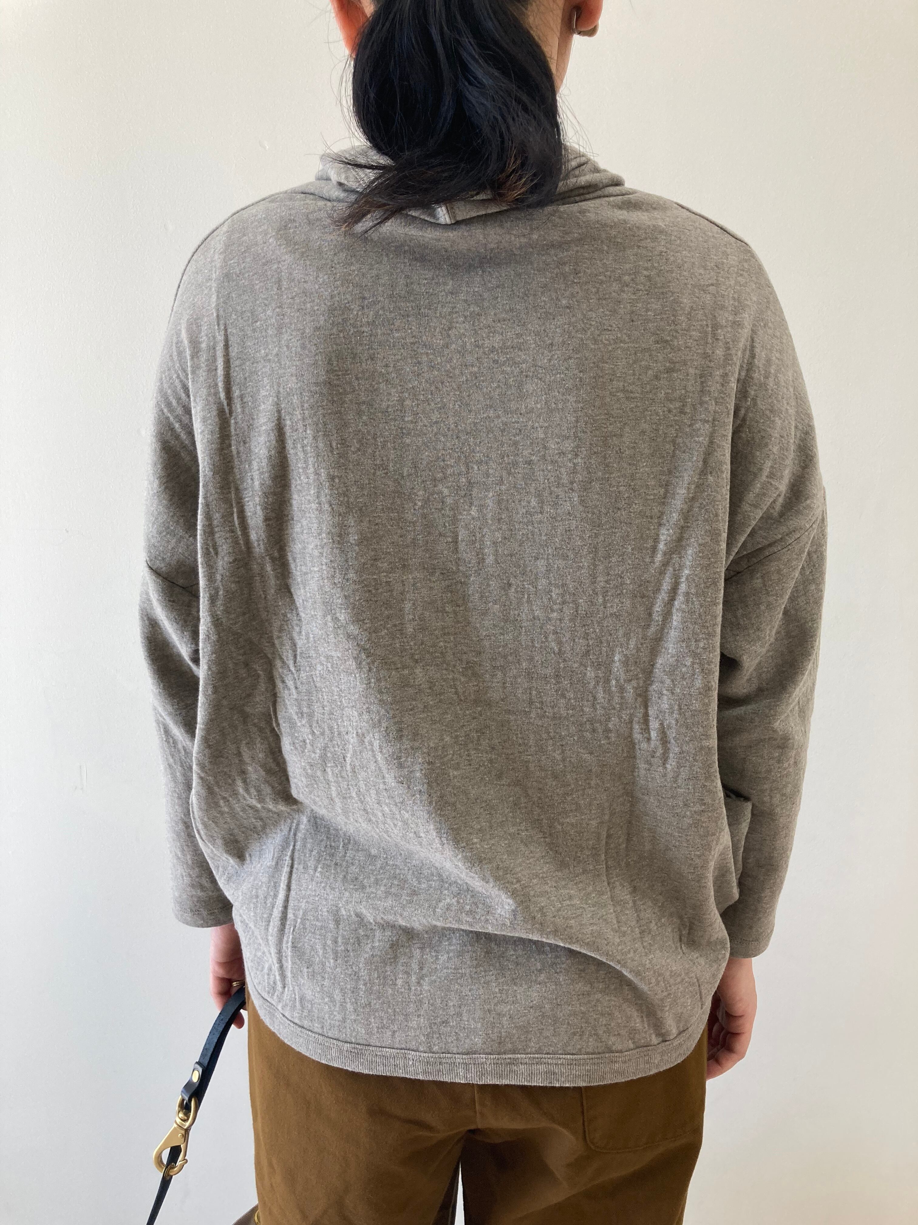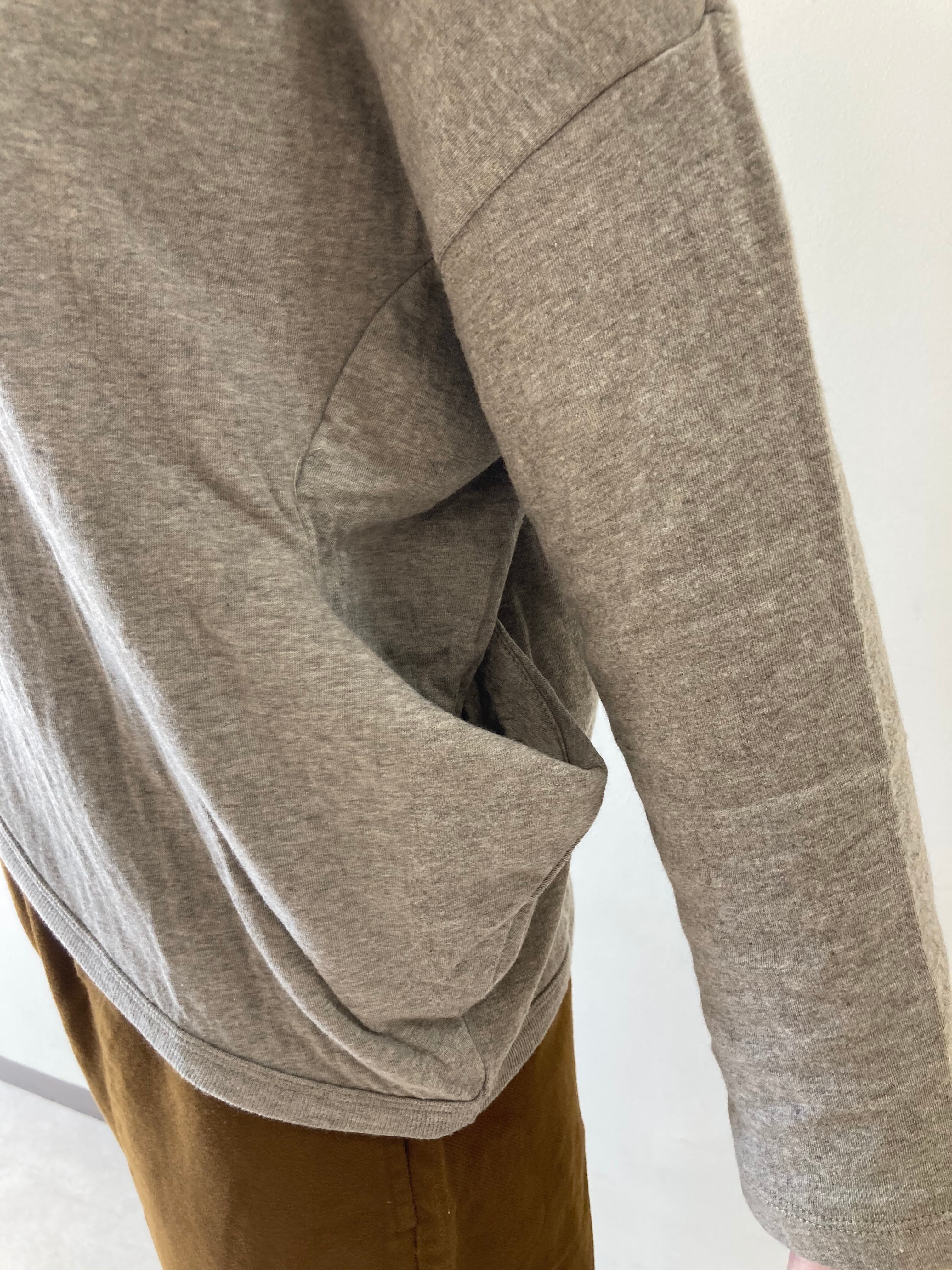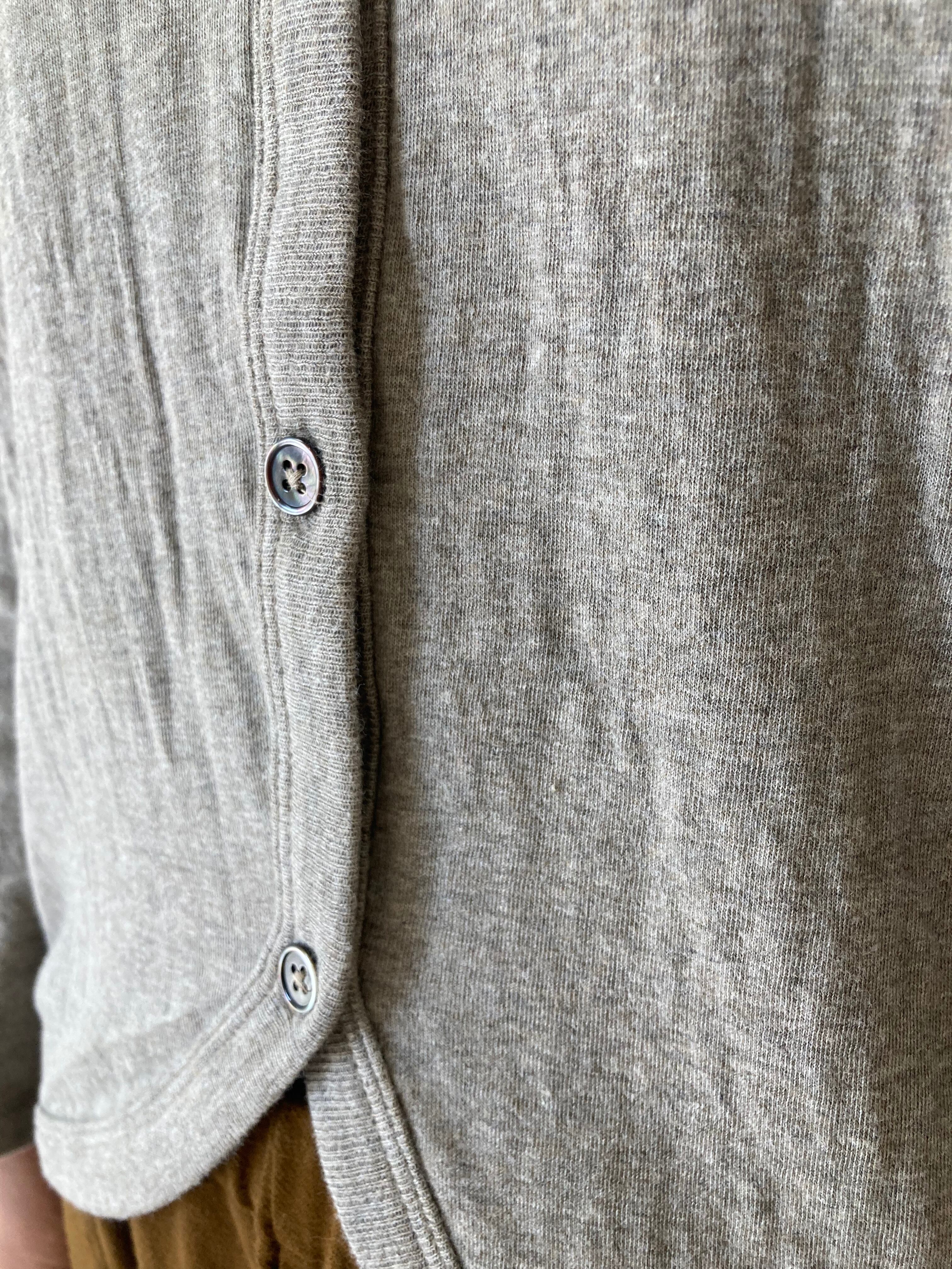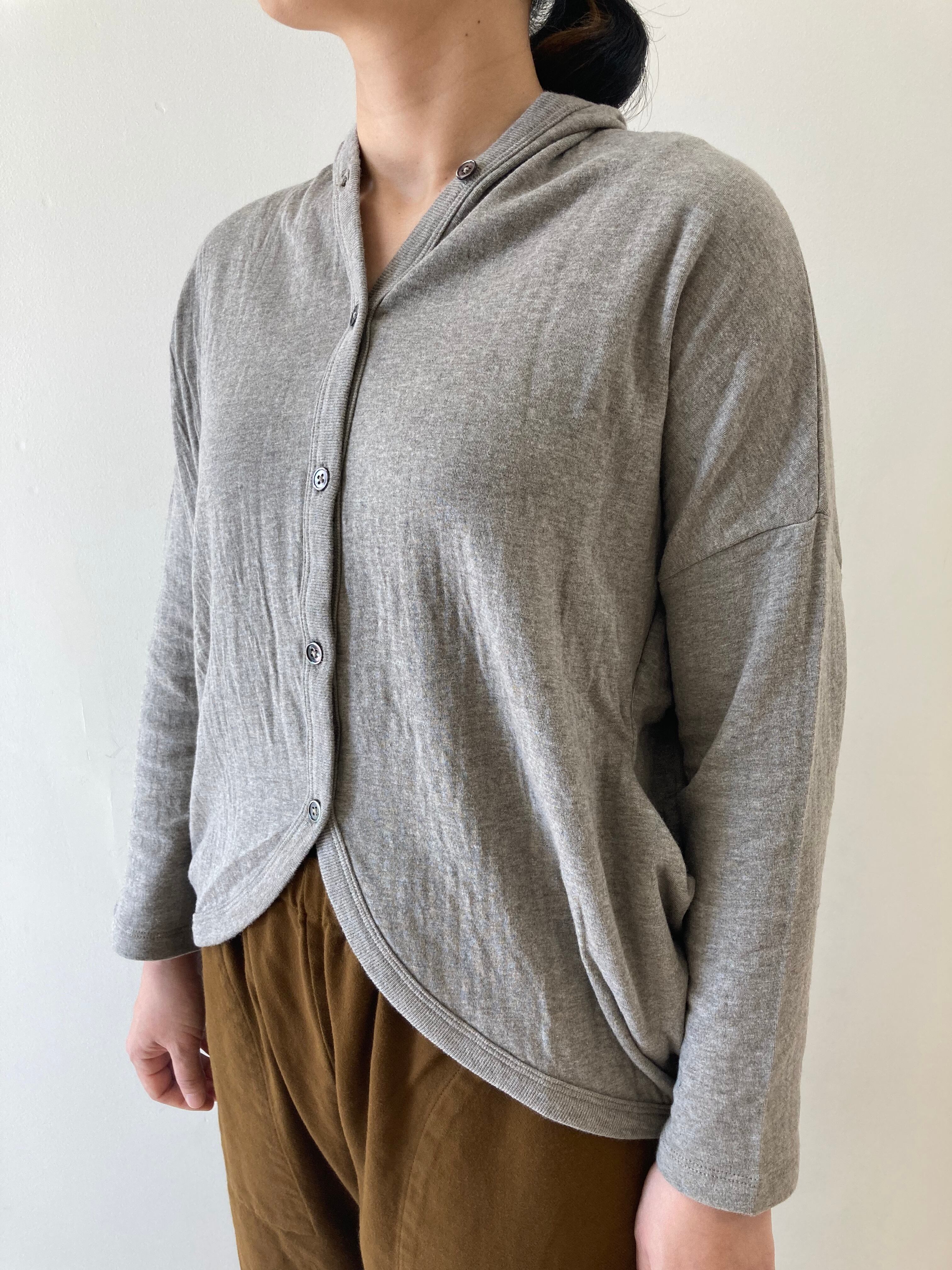 柔らかい素材で、形が決まりやすい便利な羽織りです。前見頃がカーブしていて、ボリュームパンツや、スカートでもすっきりみせてくれます。季節の変わり目にあると本当に便利な一枚です。手洗い可能です。