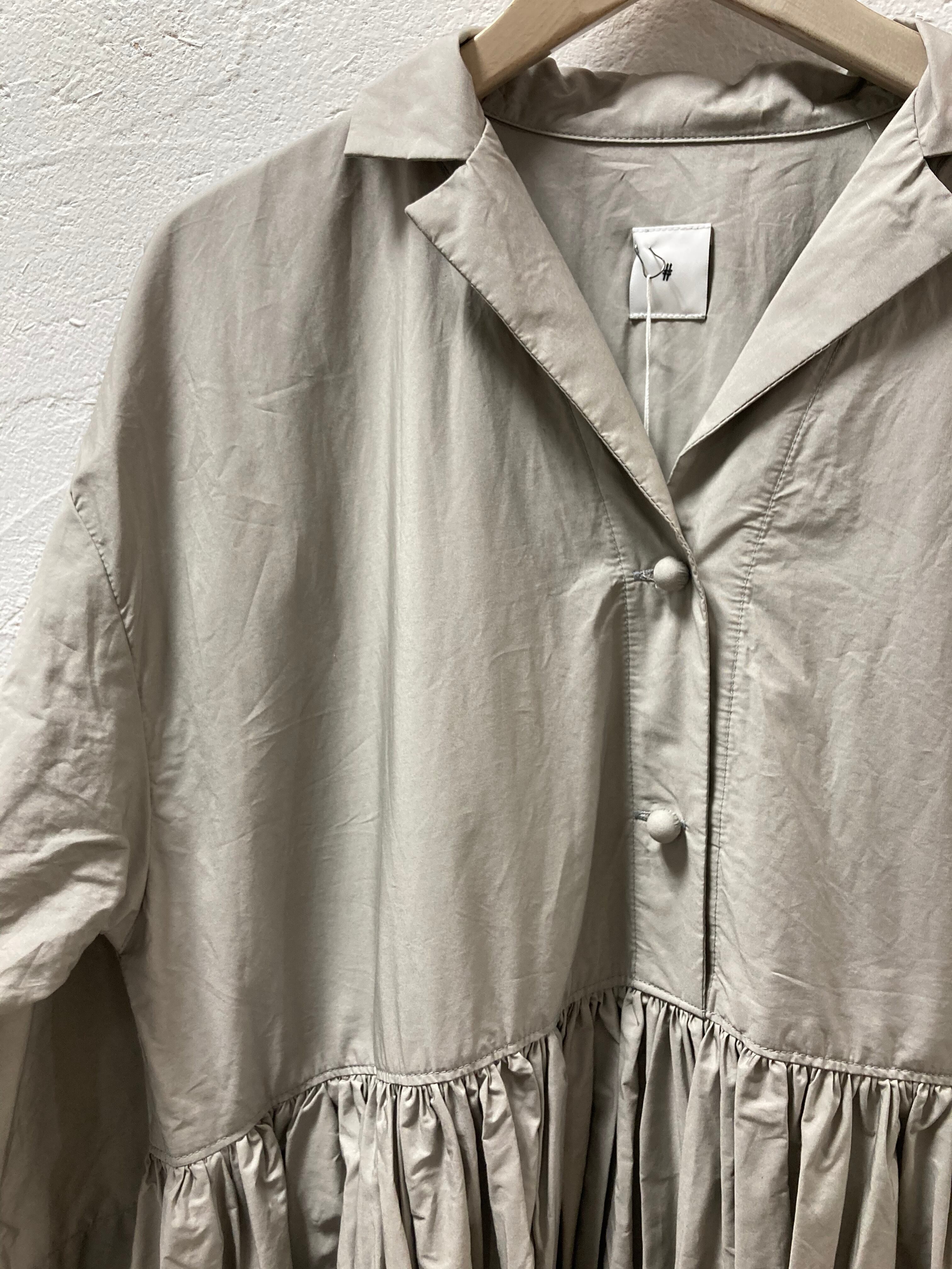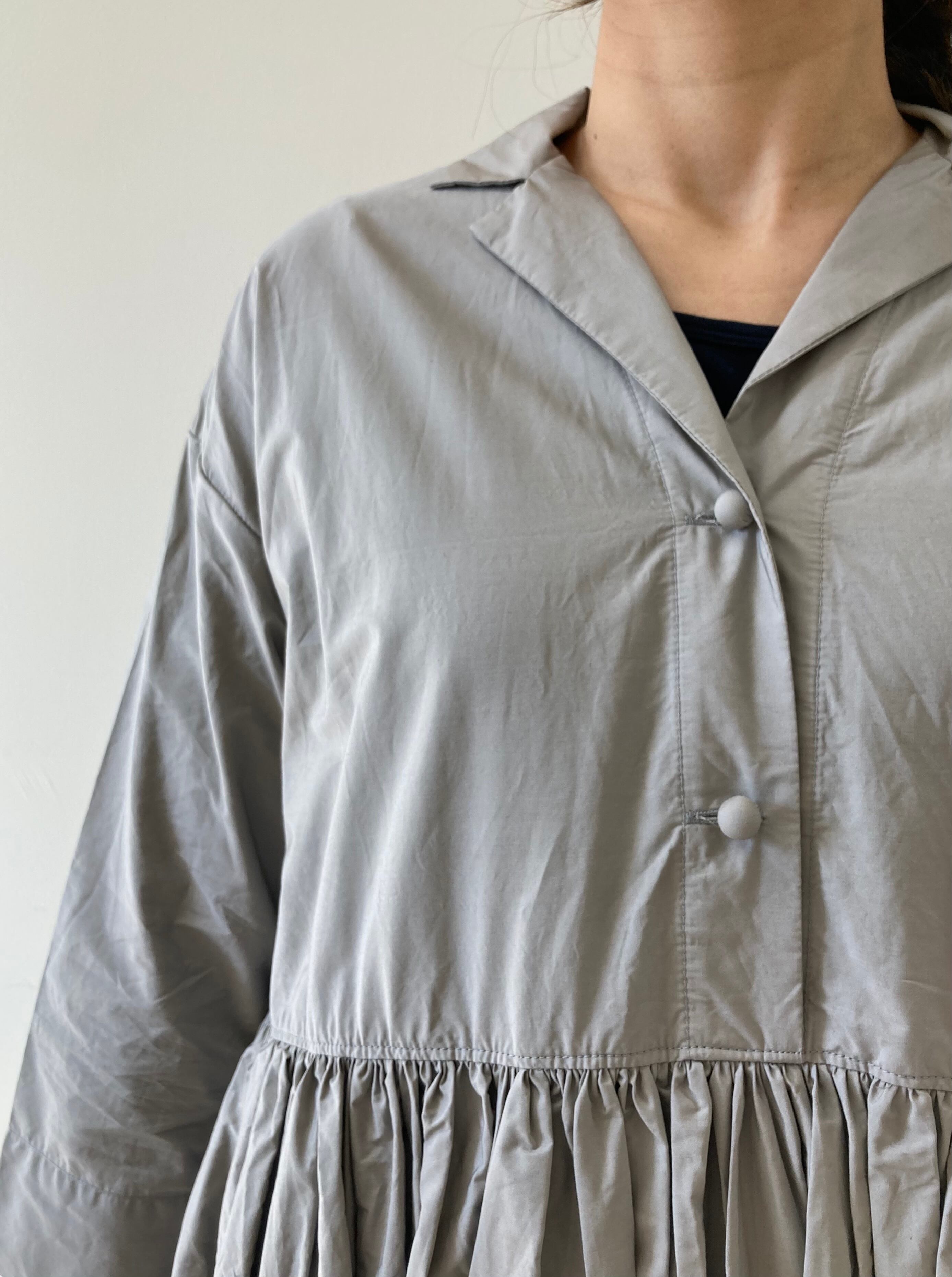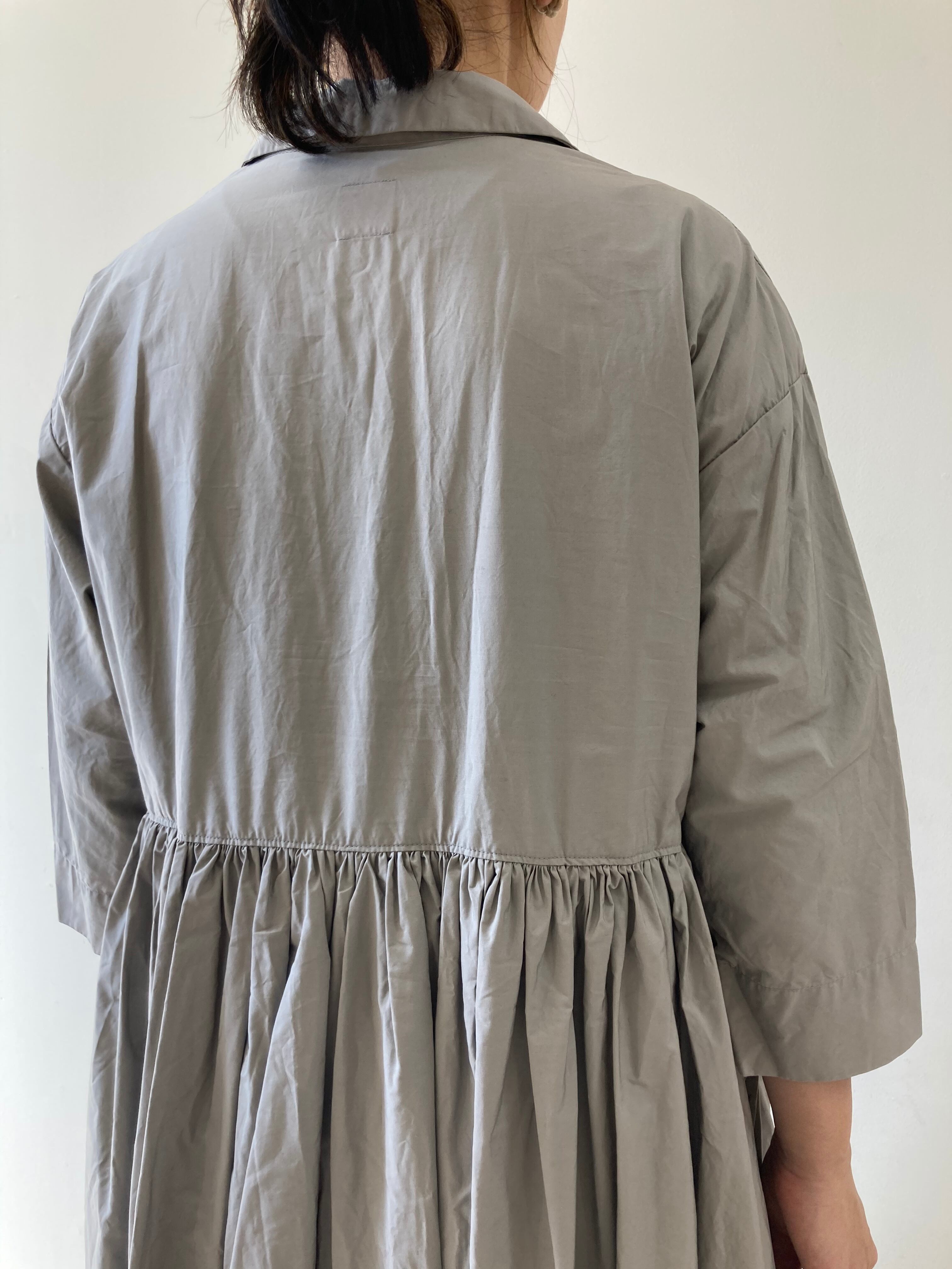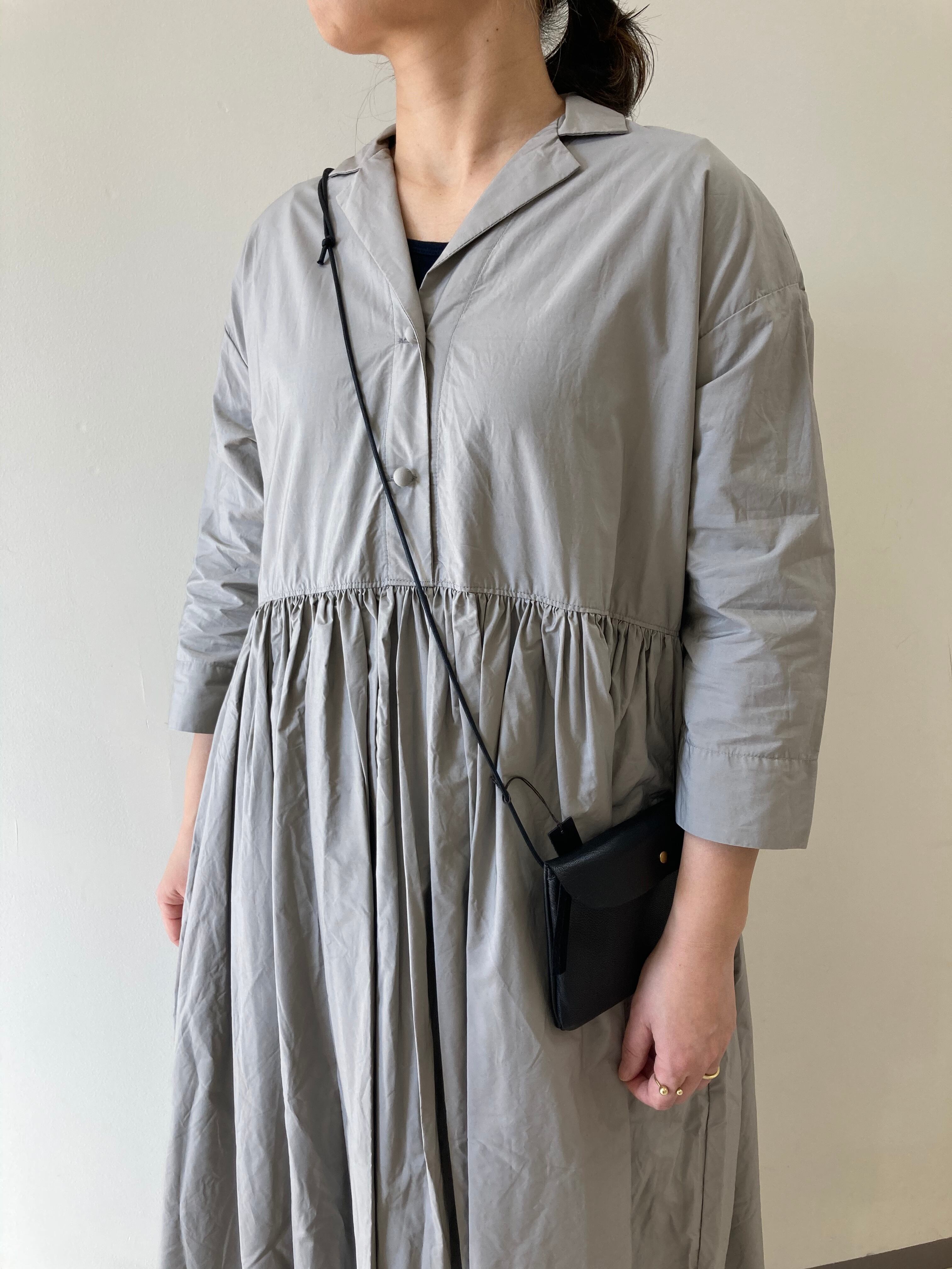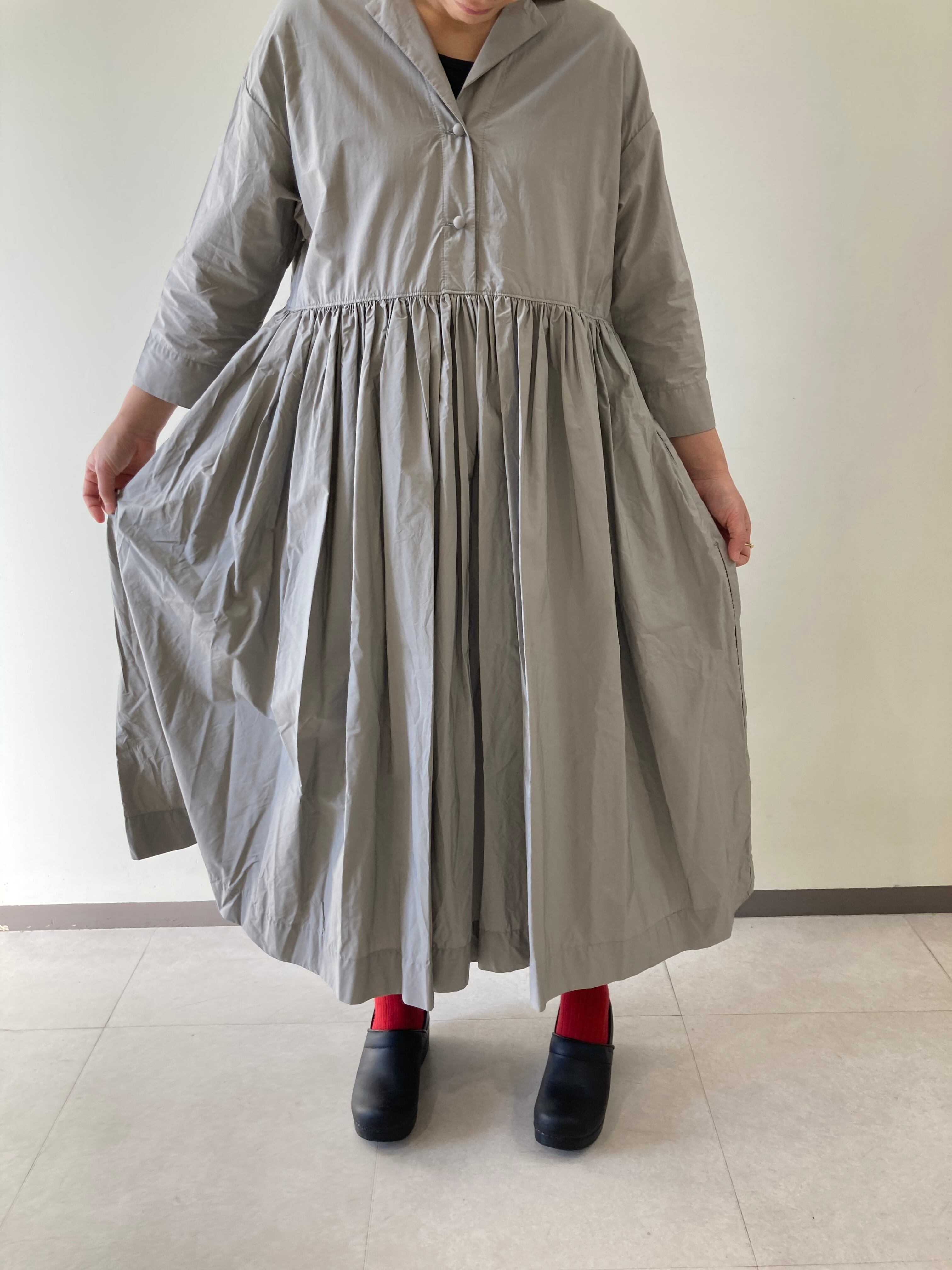 上質なタイプライターファブリックを使用したワンピースです。丸いクルミボタンがポイントです。両脇ポケットあり。裏地は無しです。