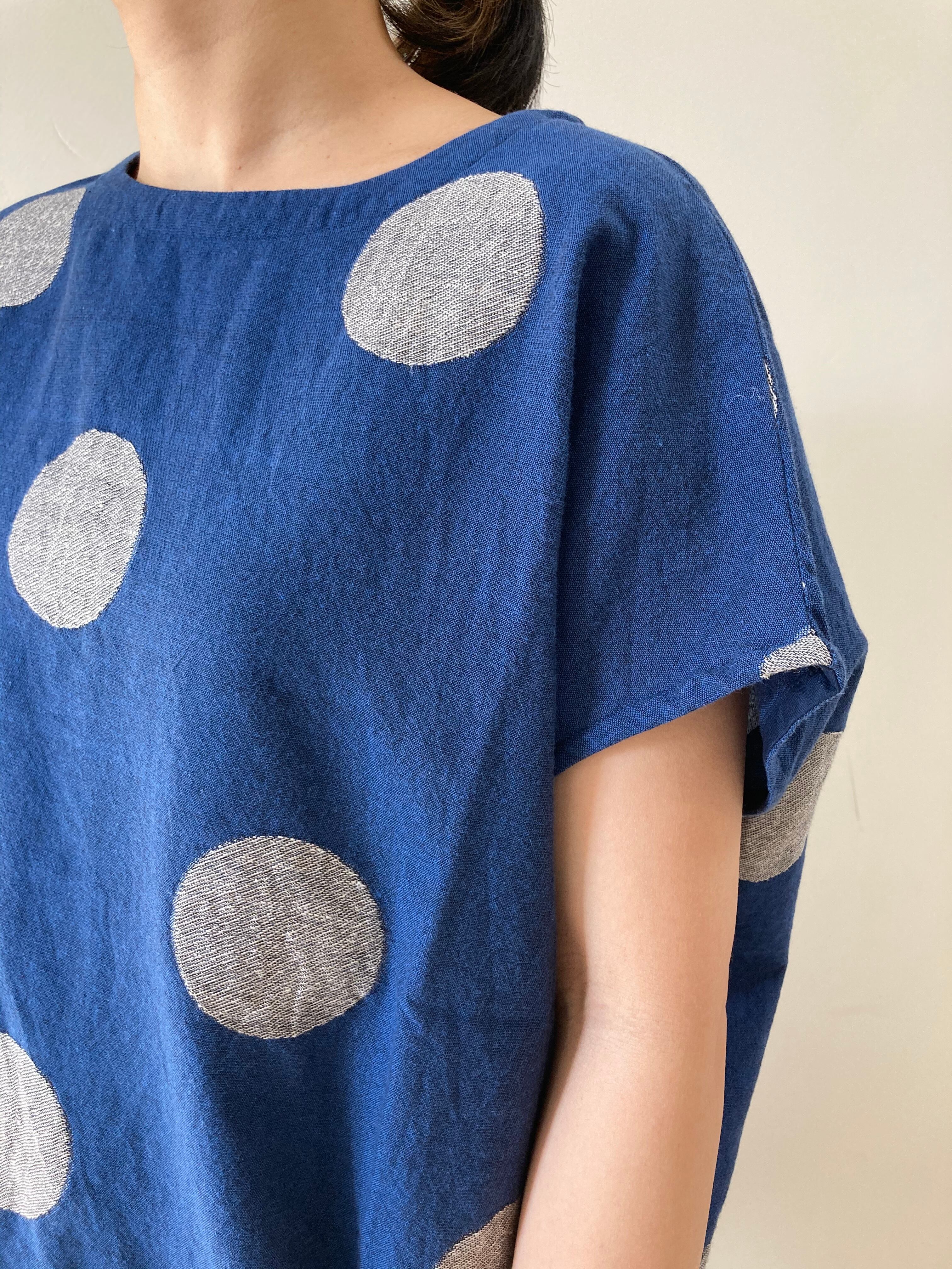 柔らかい綿麻素材のフレンチスリーブプルオーバー。裾が紐で絞れます。表情の違う大きめのドットが目をひきます。一枚で着たり、薄手のTシャツと重ねたり季節に応じて調節頂けます。