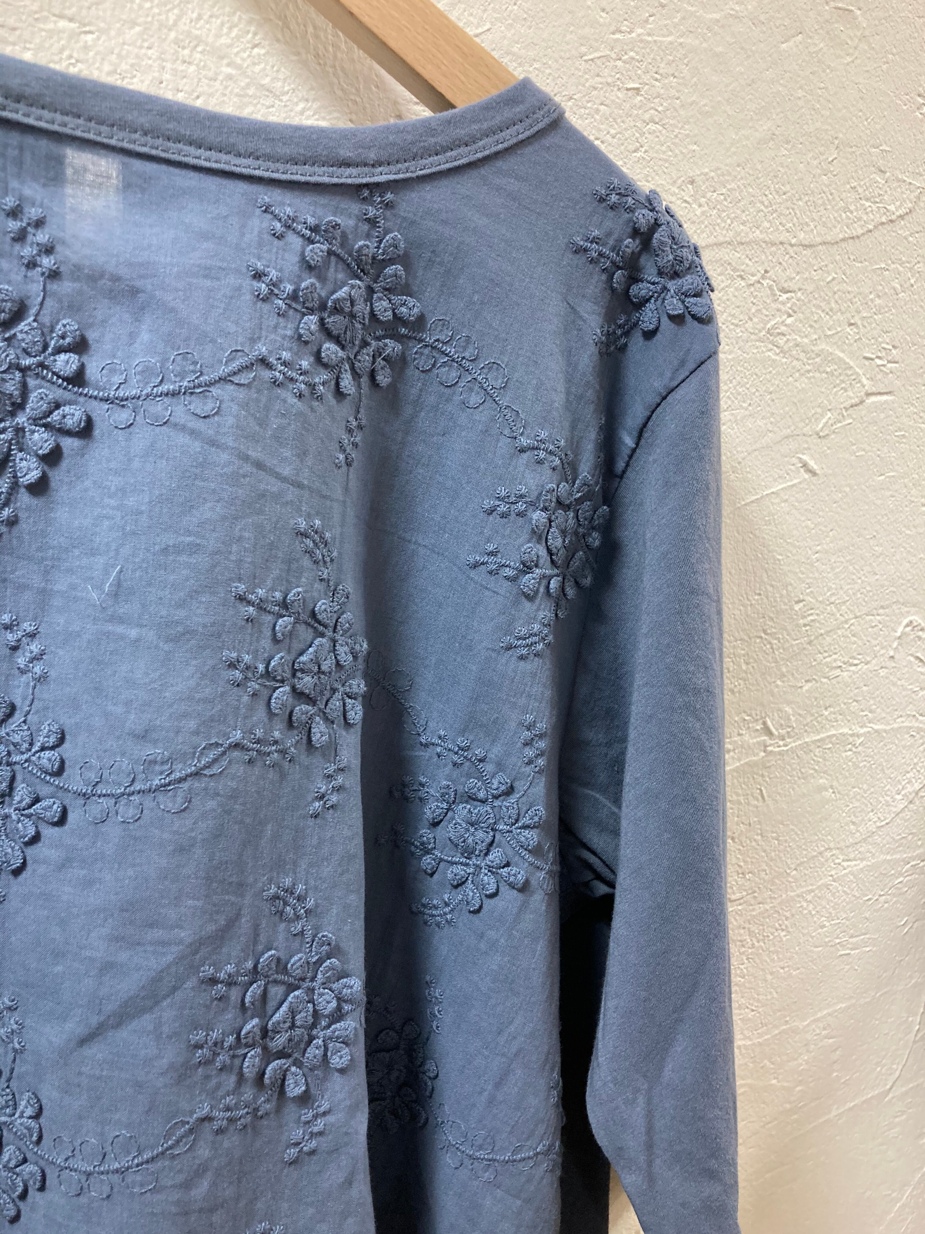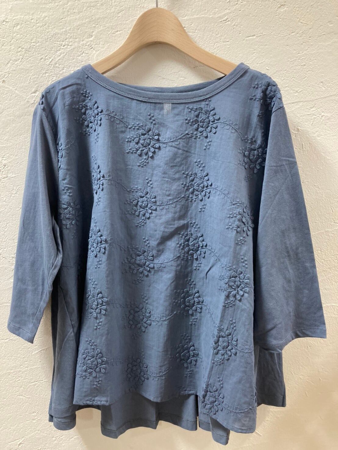 前は立体的に、織ったフラワーレースの生地。お袖と後ろ見頃は無地のカットソーです。程よくAラインで背中のドレープは立体的なで一枚でもさまになります。生地はとても柔らかいです。透け感があるので、インナー着用をおすすめします。お洗濯可能。