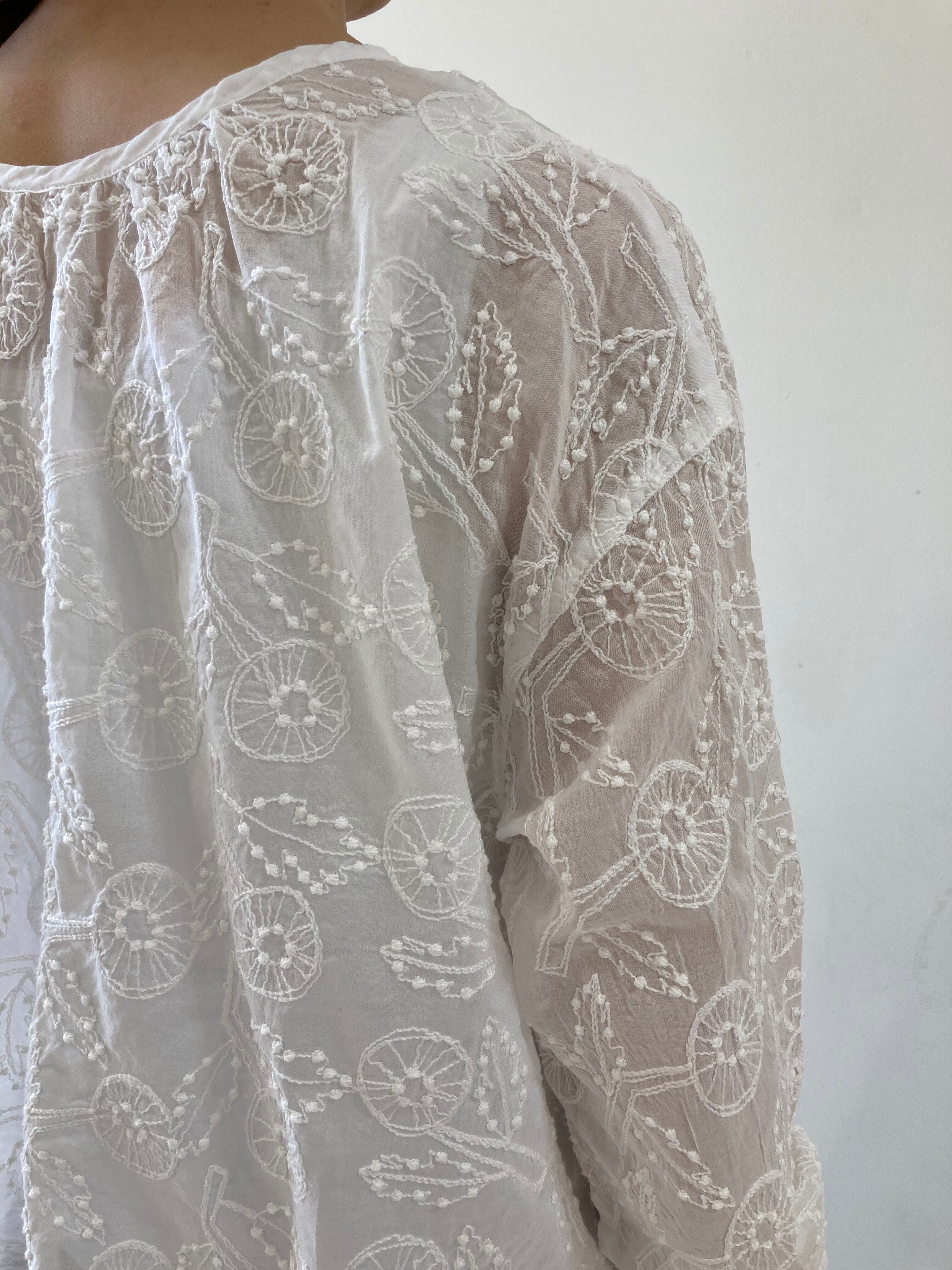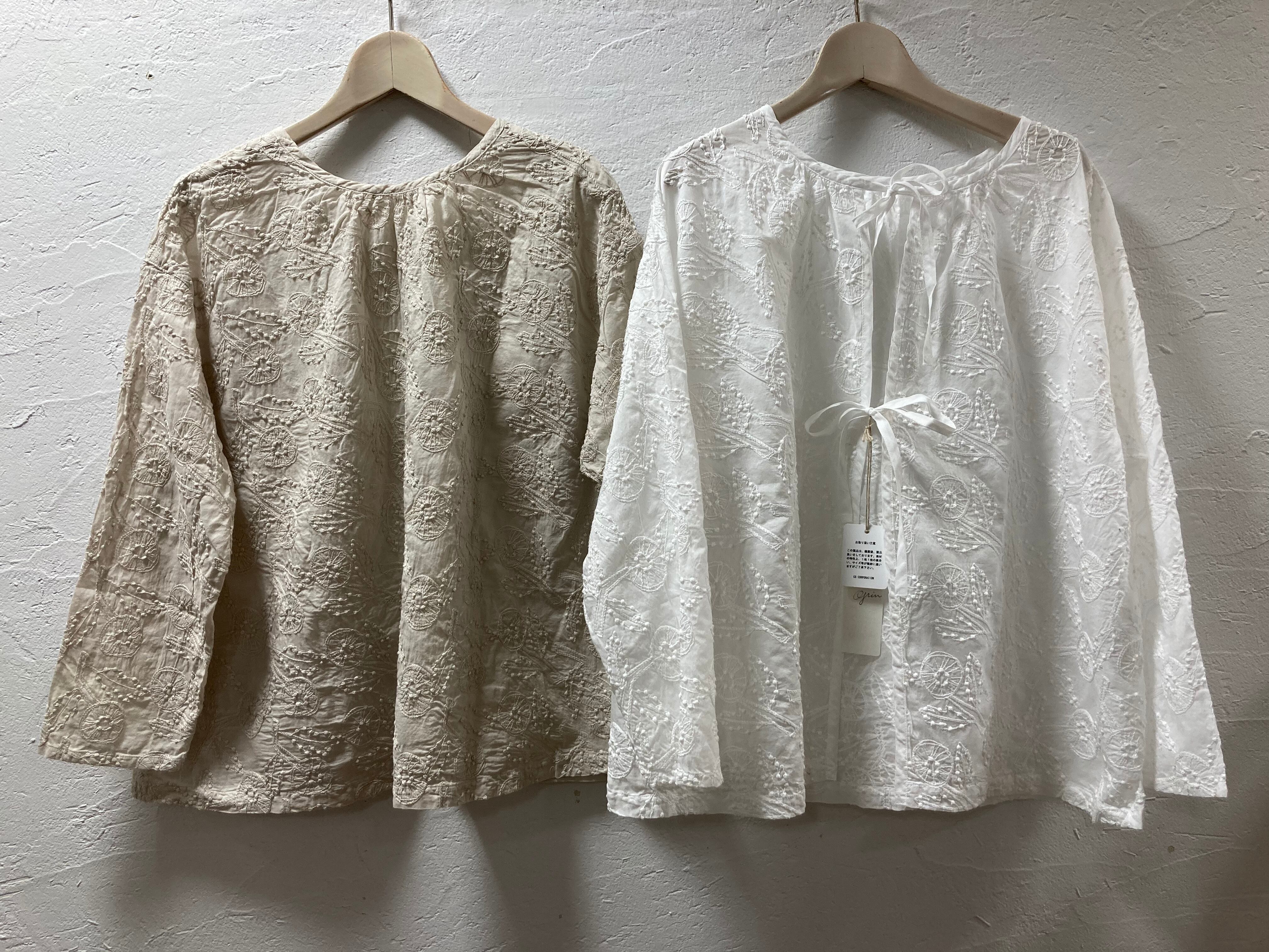 軽やかな生地にリズム感のあるデイジーの刺繍。立体的でとても綺麗なブラウスです。羽織としてワンピースと重ねたり、デニムでカジュアルに合わせたり。リボンがポイントの一枚です。後ろリボンでも着用可能の2way仕様です。薄手なので夏場の羽織にも使用いただけますよ。お洗濯可能。