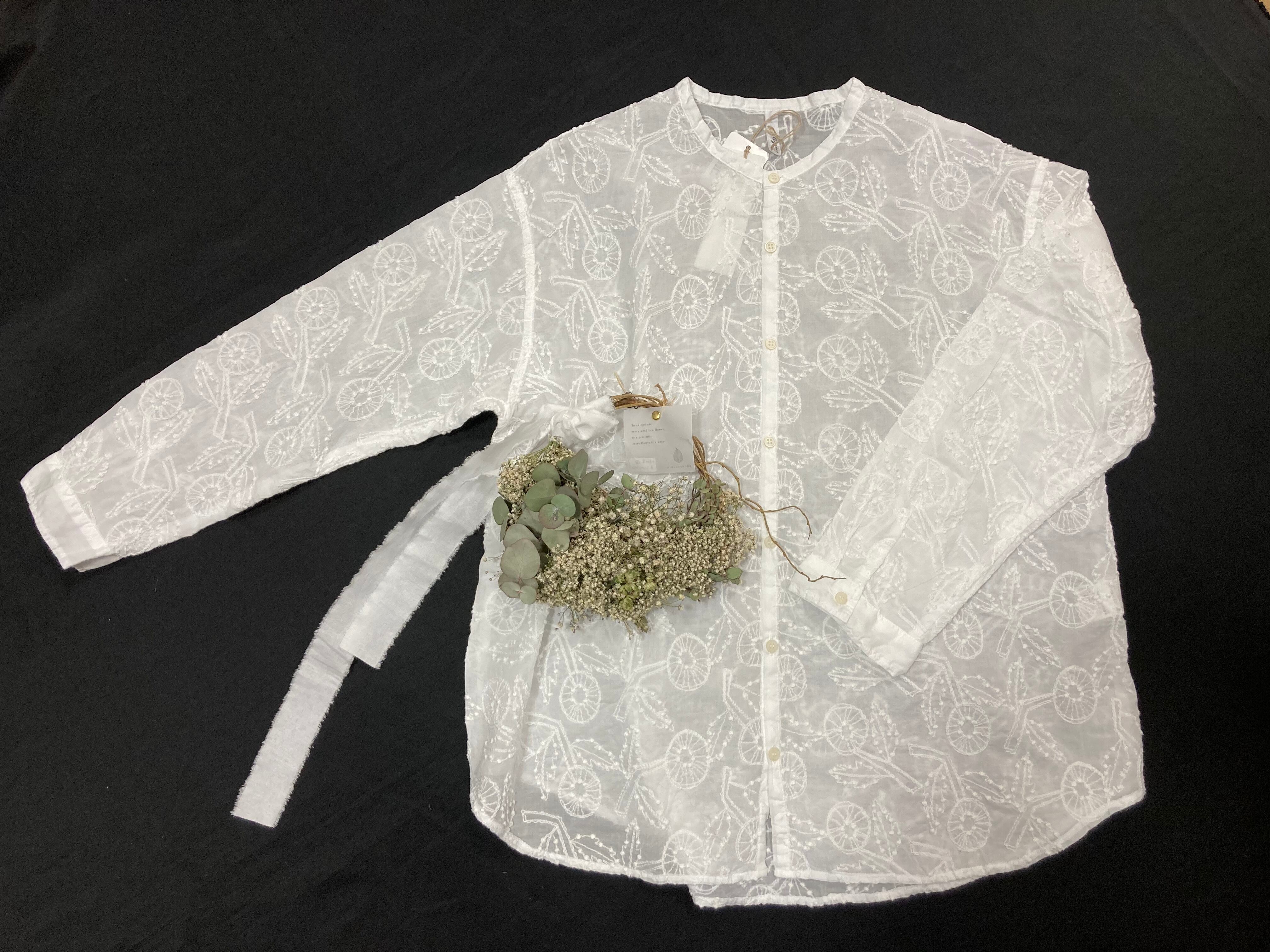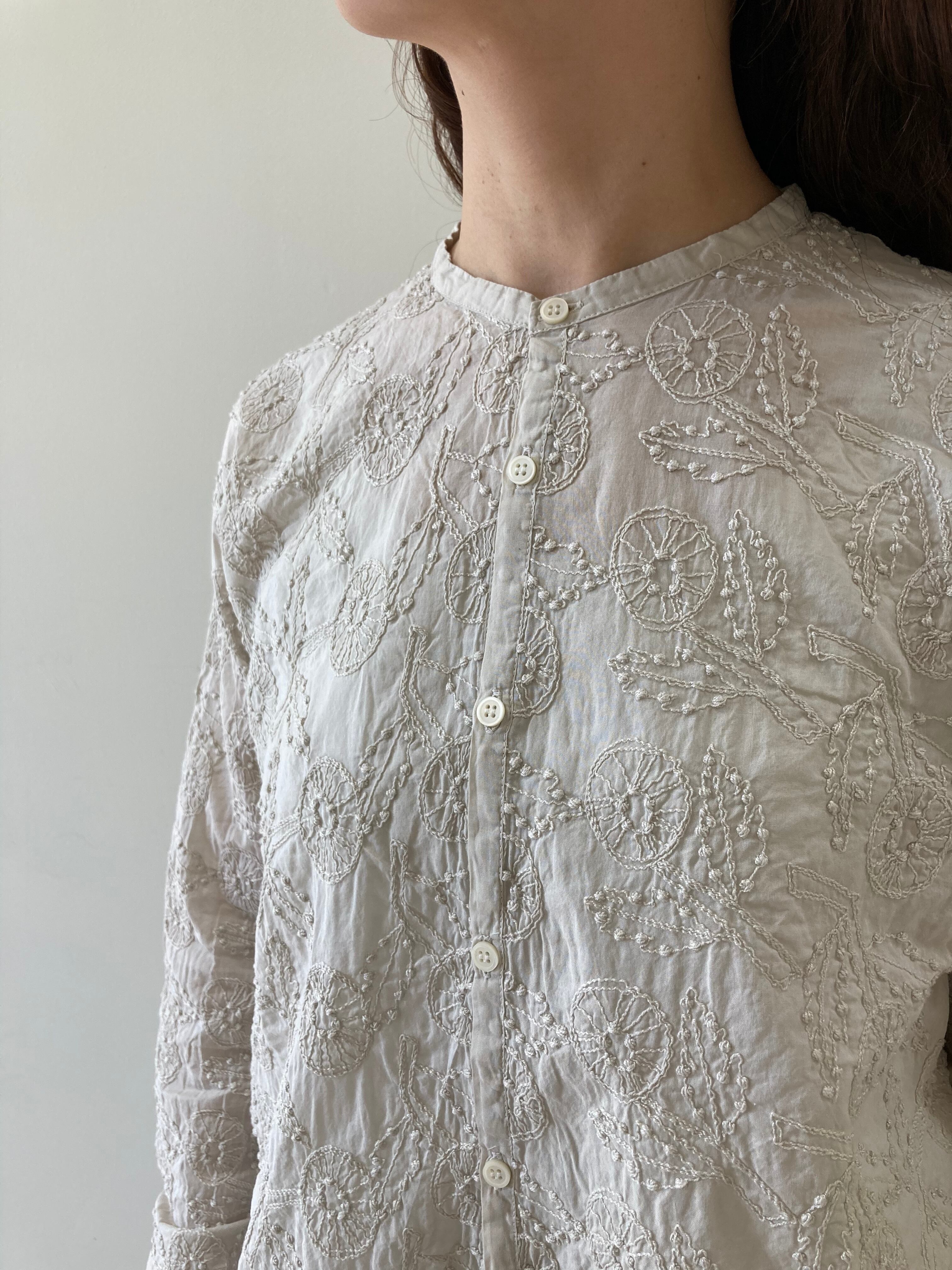 軽やかな生地にリズム感のあるデイジーの刺繍。立体的でとても綺麗なブラウスです。ノーカラーですっきり。どんなものにも合わせやすくキリッとした雰囲気の万能選手です。薄手なので夏場の羽織にも使用いただけますよ。カーディガンやジャケットの、下に着て頂いても存在感があります。お洗濯可能。