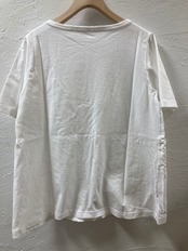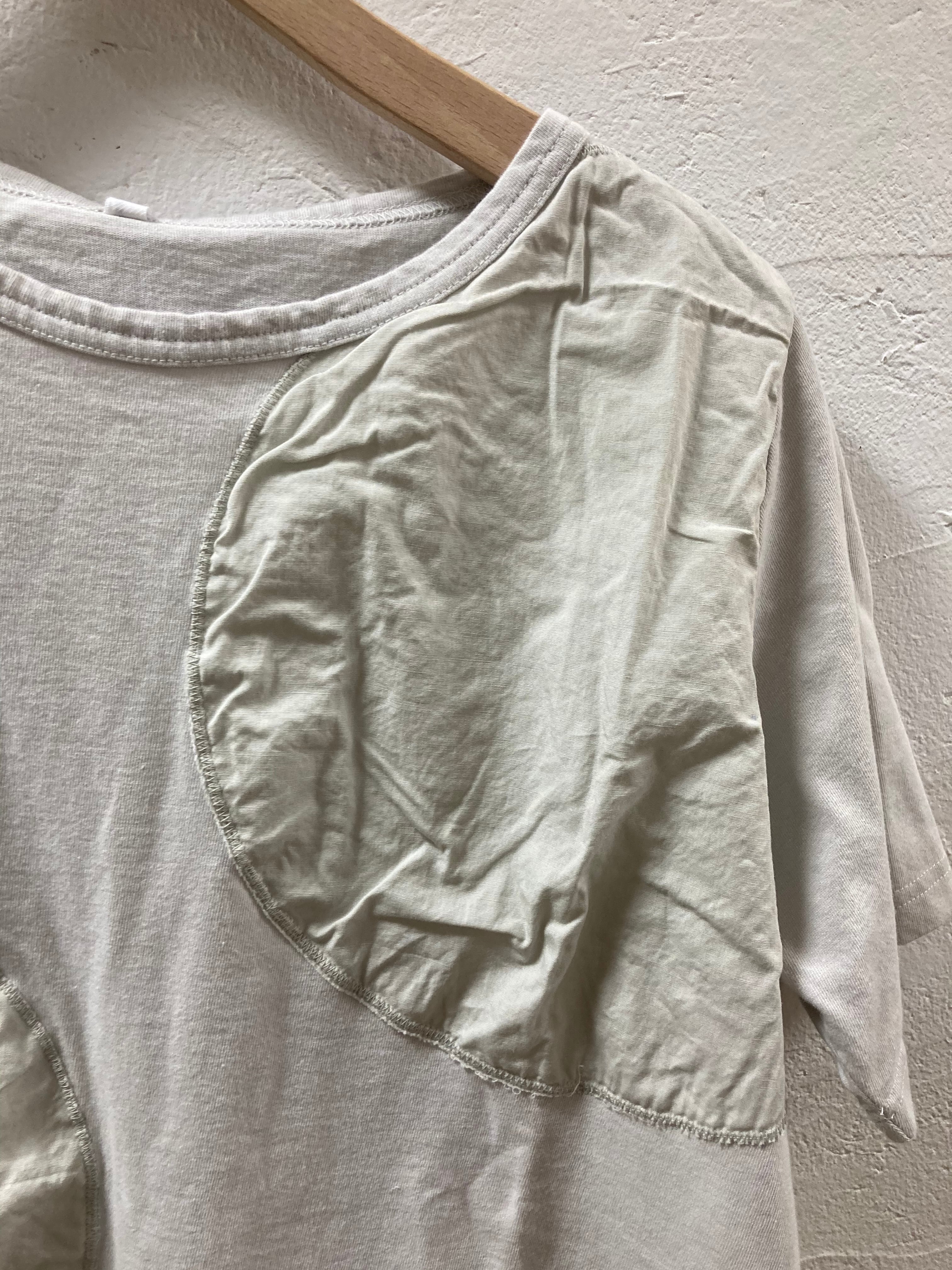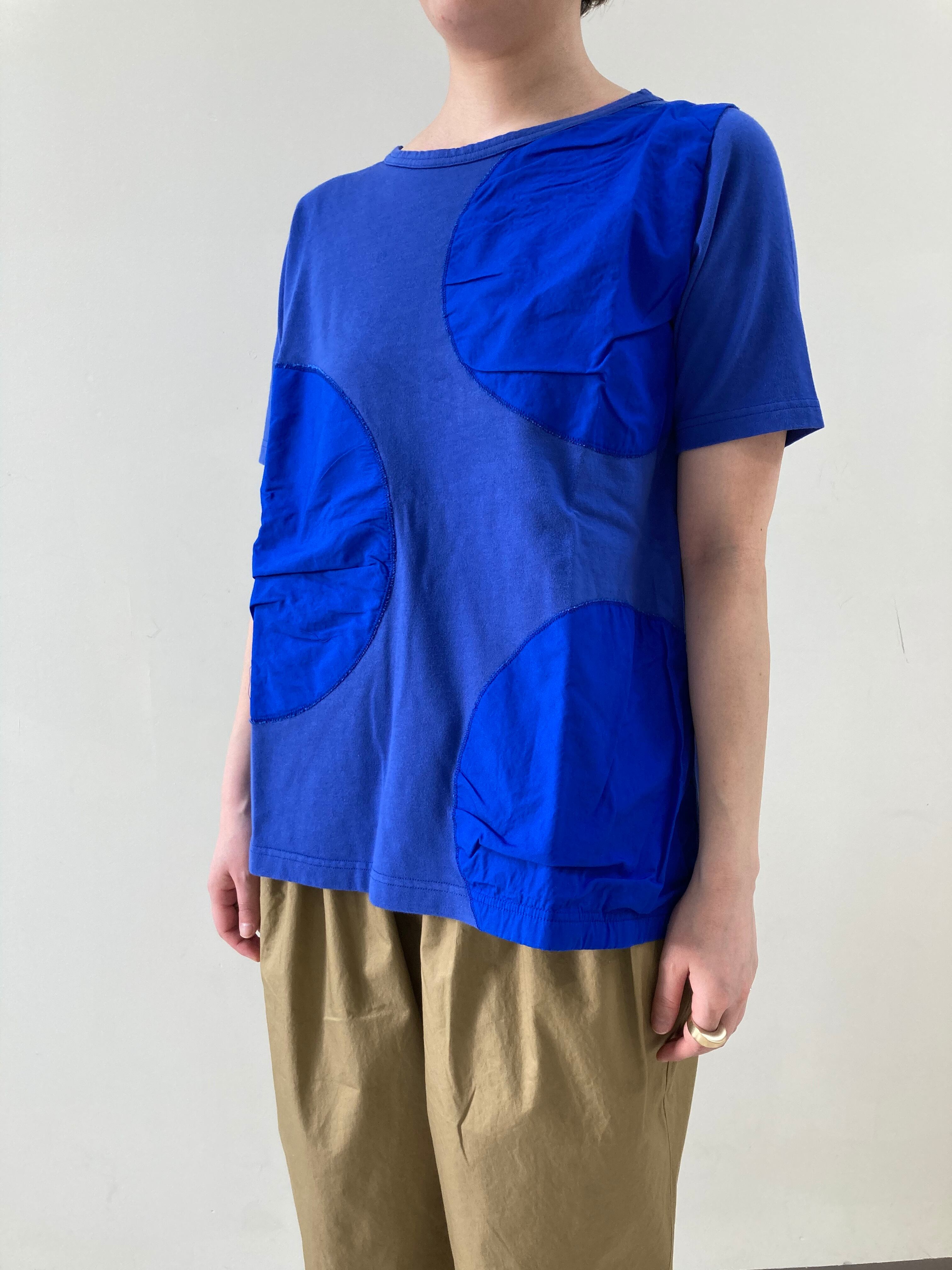 大きいドットが同色の布帛で叩いてあるTシャツです。ドット部分が少し色の見え方が異なり、さり気なく存在感があります。形はベーシックです。しっかりした着心地のいい綿素材ですよ。白でもあまり透け感はありません。