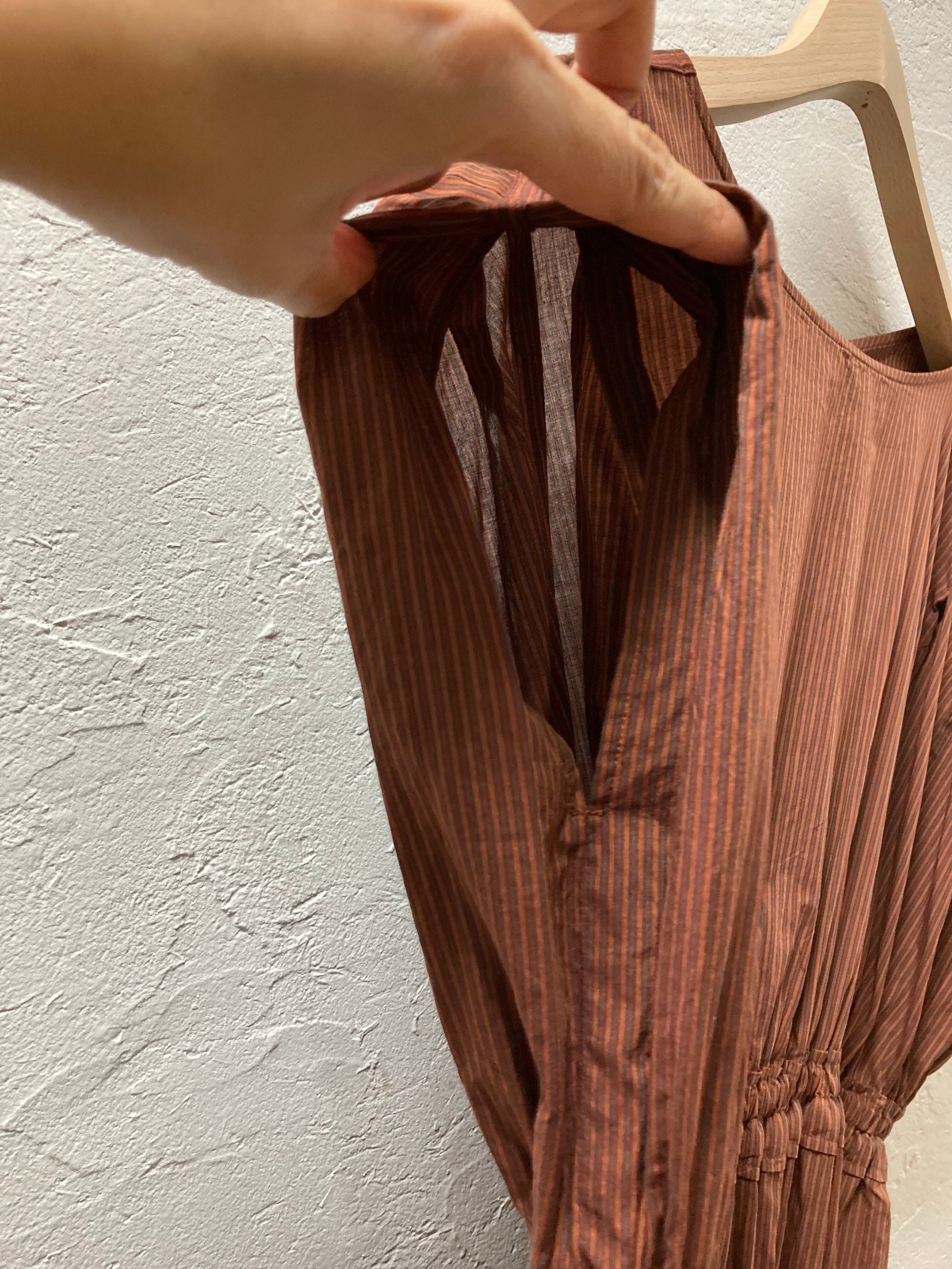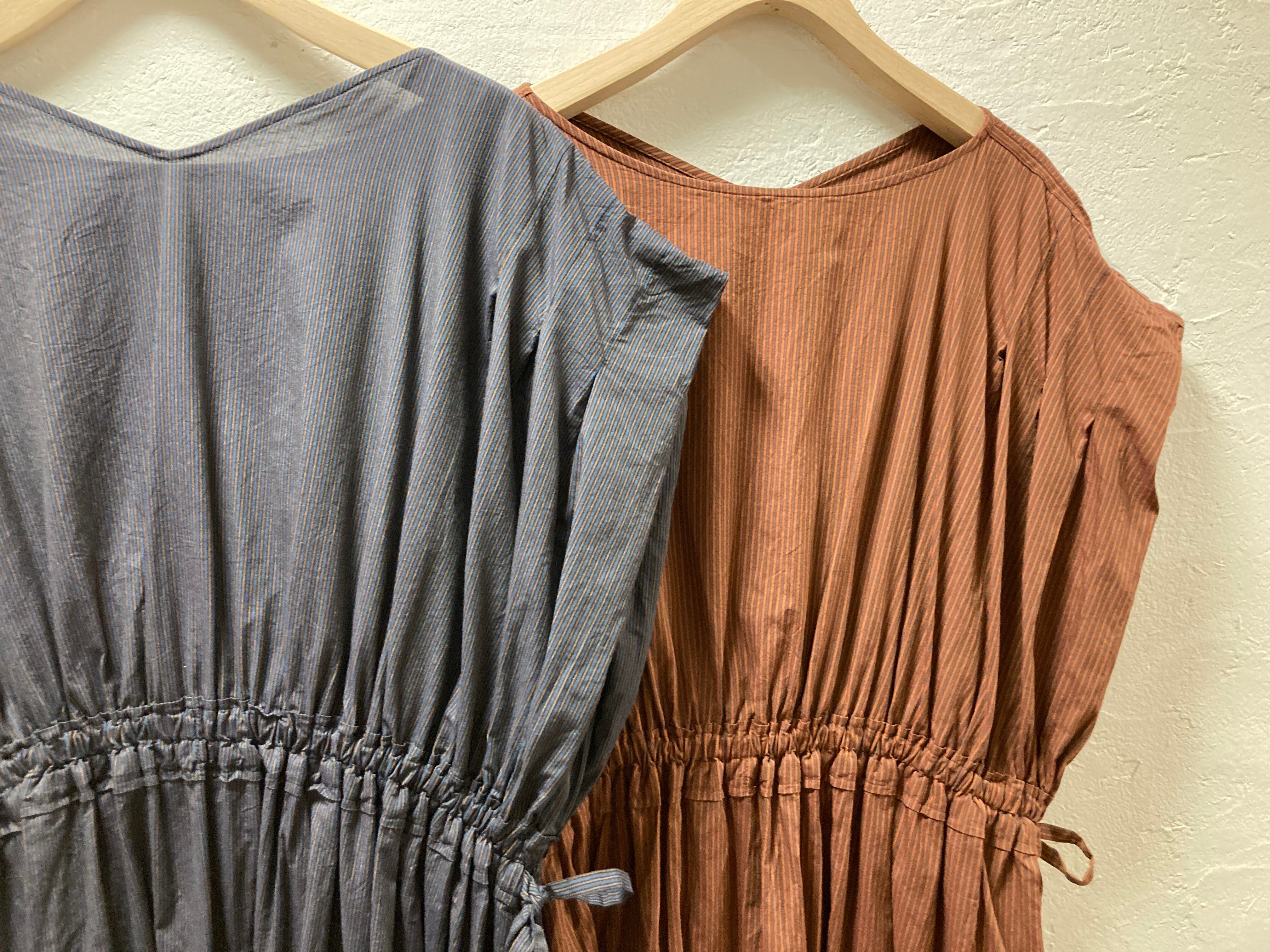 サラッとした肌触りのコットンシルクローン素材をたっぷり使ったタックギャザーチュニックです。さりげないストライプが大人っぽい印象です。前後着用可能なのでVネックと、ボートネックのバランスの良い方を選べます。脇のスリットはウェストまで開いてるのでパンツと合わせるチュニックワンピースです。ウェストはゴムとリボンで調節可能です。リネンや薄手のコットンパンツで夏場も涼しく着ていただけますよ。