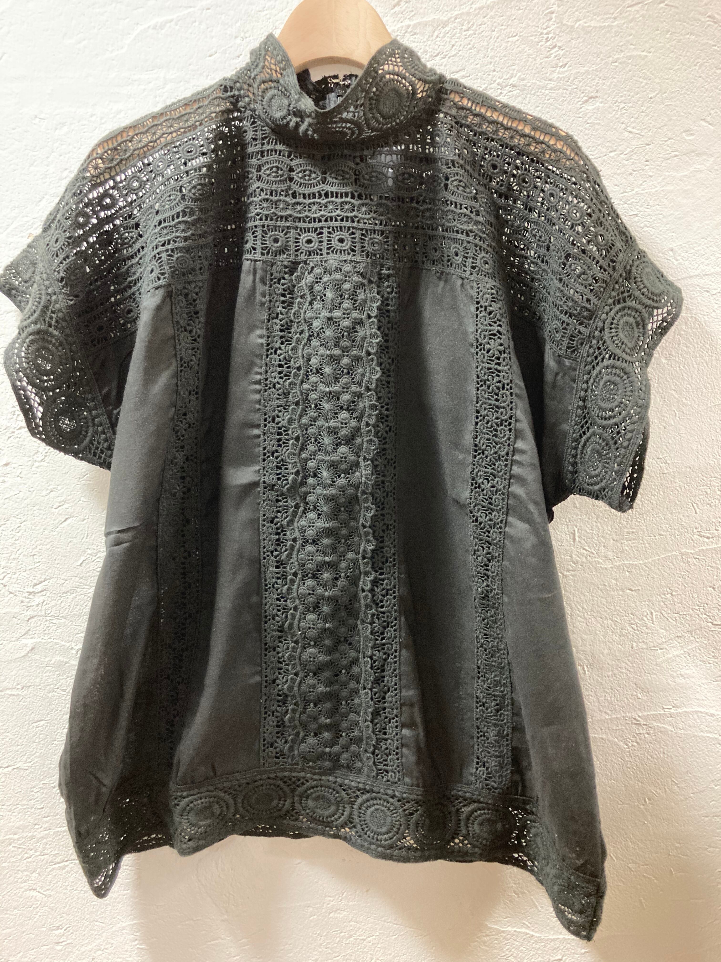 レースのハイネックがクラシックな印象です。フレンチスリーブで、涼しく着ていただけます。後ろファスナーあきです。白も、真っ白ではなくキナリでアンティークブラウスの様で素敵です。レースはコットンなのでナチュラルです。無地部分はレーヨンなので、上品なとろみのある仕上がりになってます。