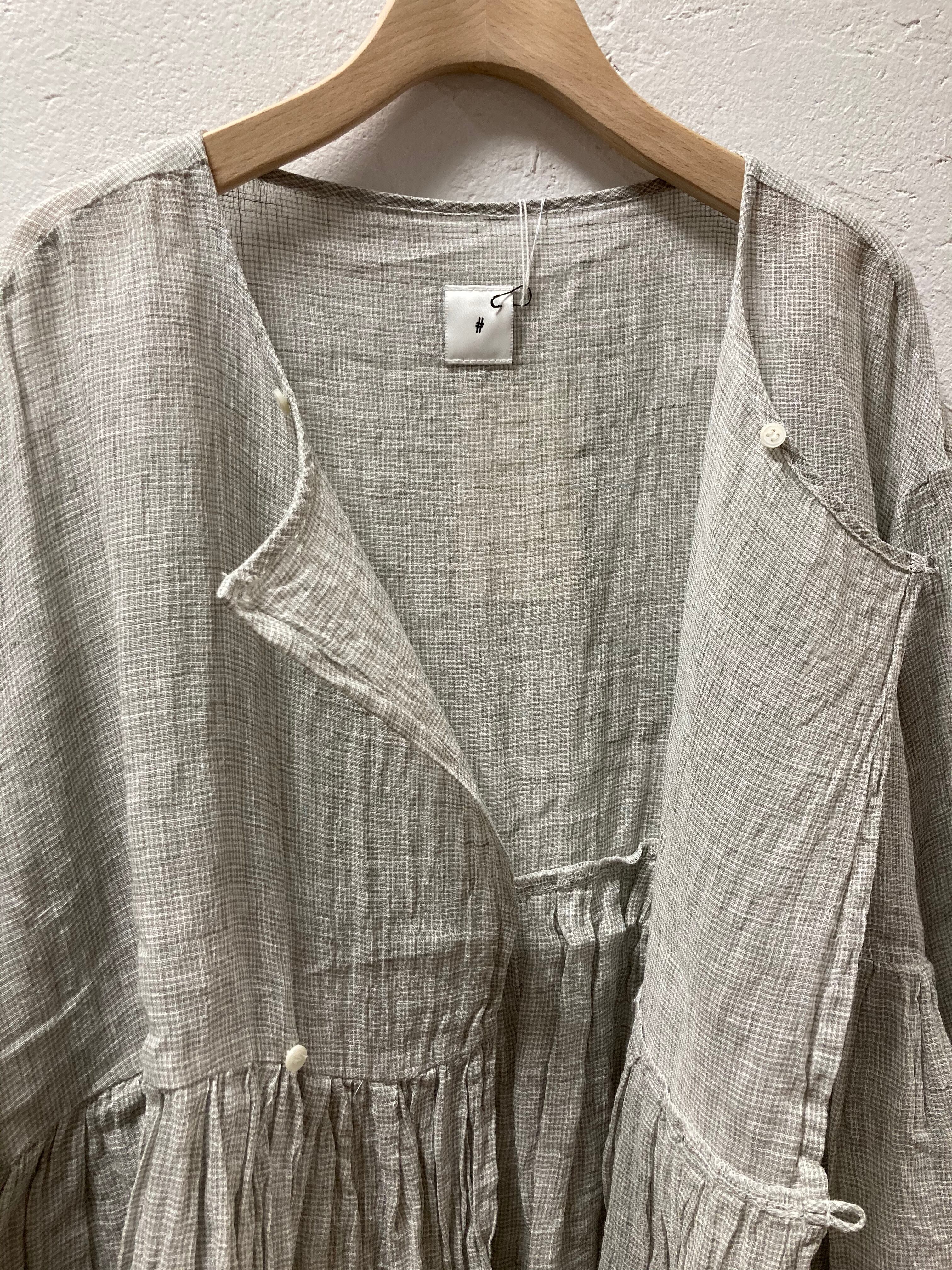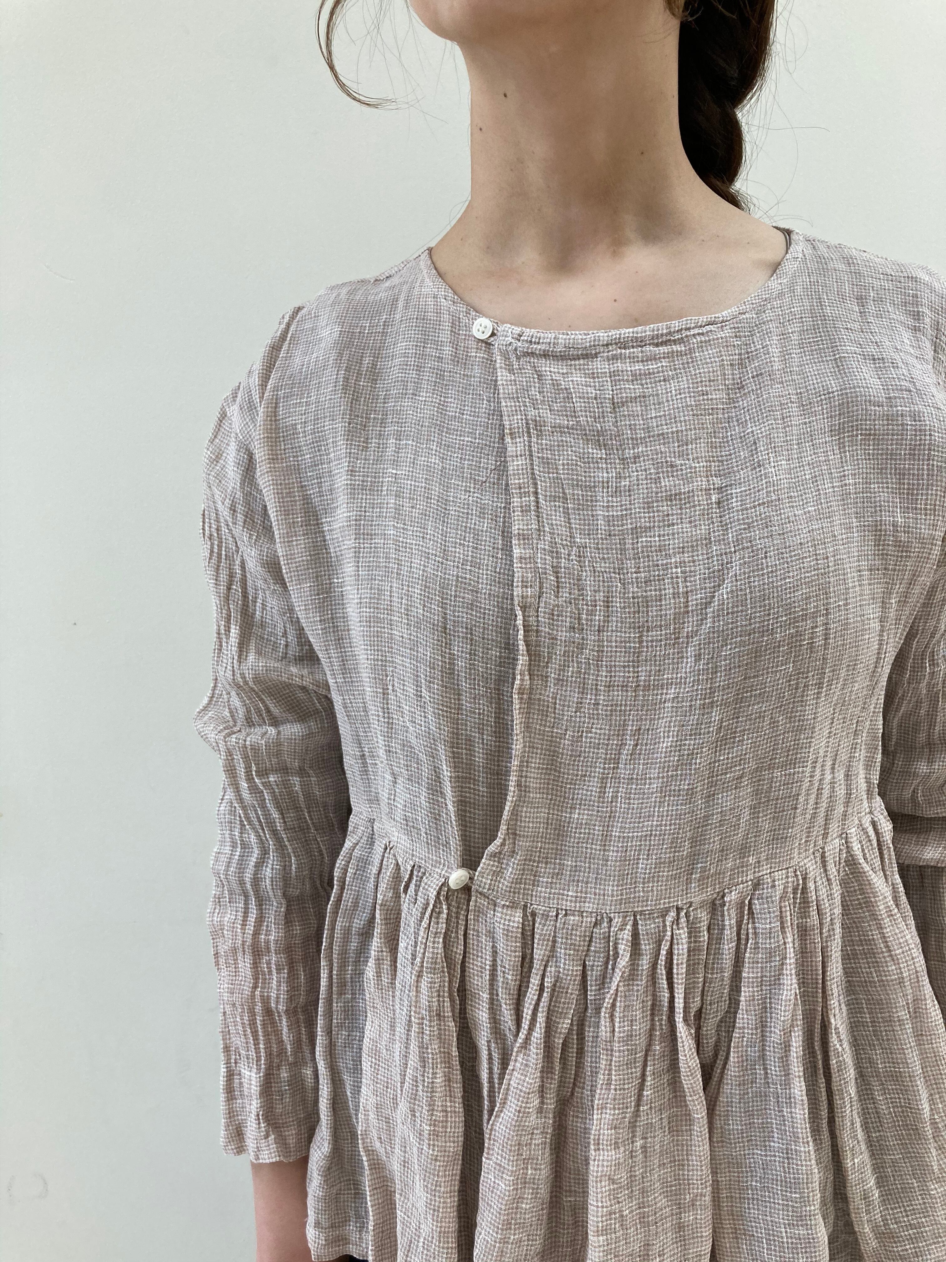 涼しげなボイルリネンでgauze#らしいギャザーブラウスです。二つ小さなボタンで開閉です。切り替え下の細やかなギャザーが甘過ぎず大人の雰囲気です。夏も涼しく着ていただけますよ。