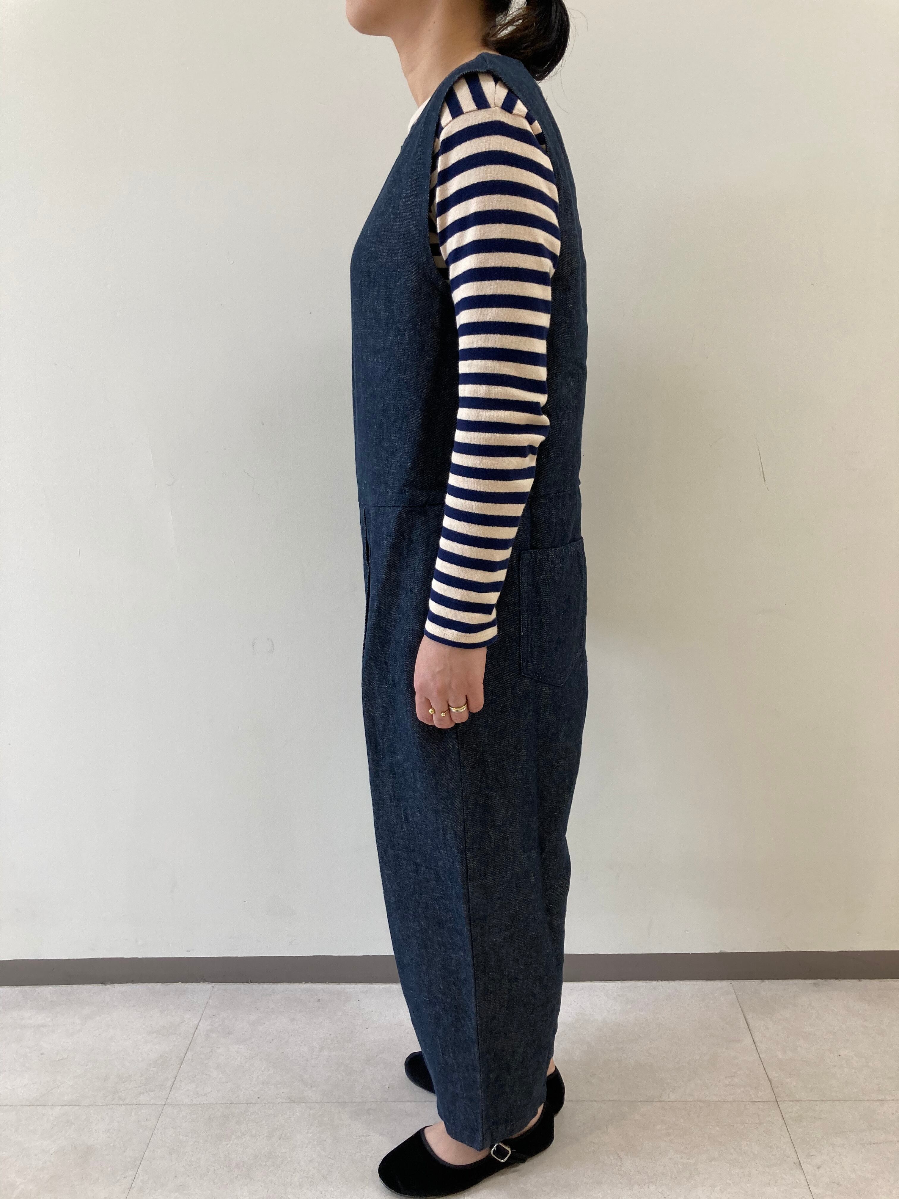 リネン100%でデニム組織で、織り上げたリネンデニム素材を使用したオールインワン。