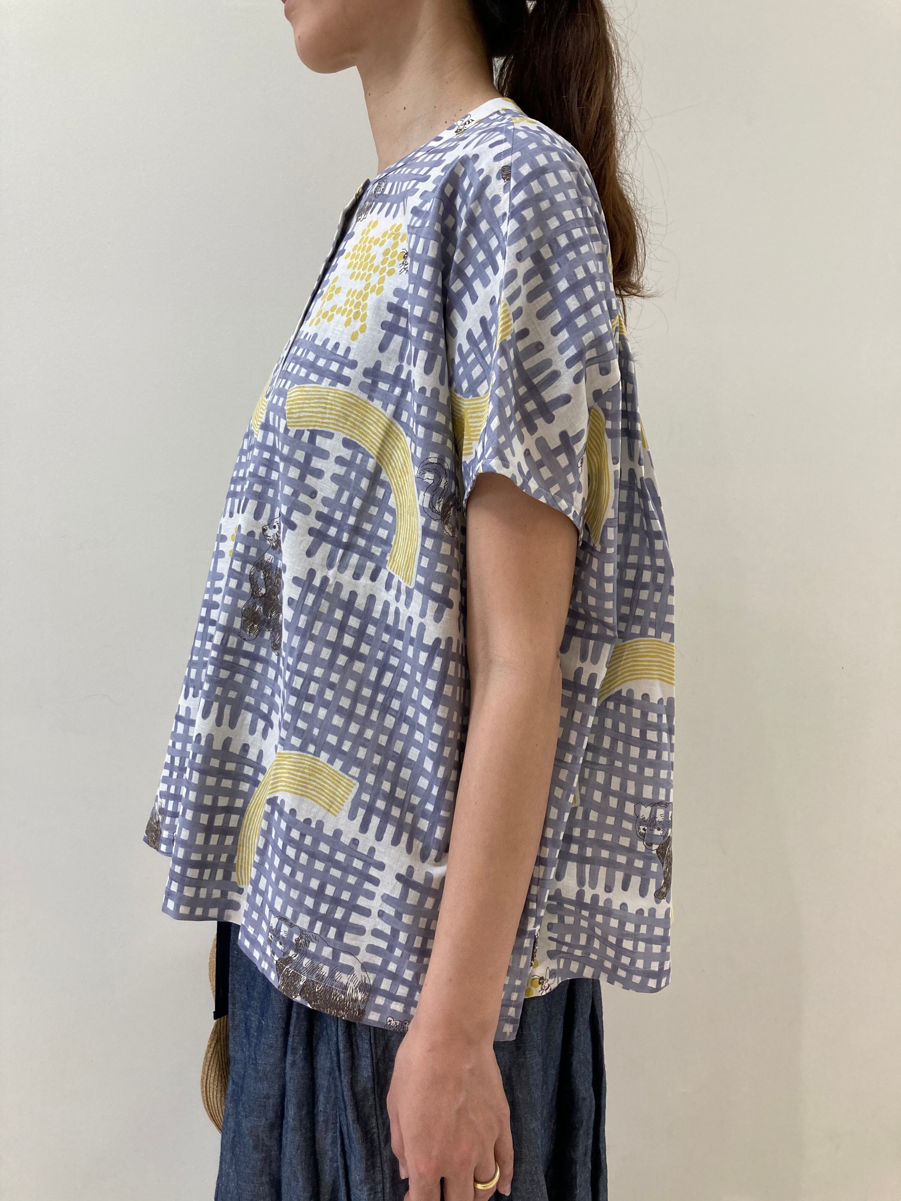 きちんと感のあるバンドカラーのブラウス。背中にたっぷりとギャザーを寄せ、前後で異なる表情がポイントです。ゆったりとした身幅と、すっきり見えのフレンチスリーブとのバランスも嬉しい一枚◎