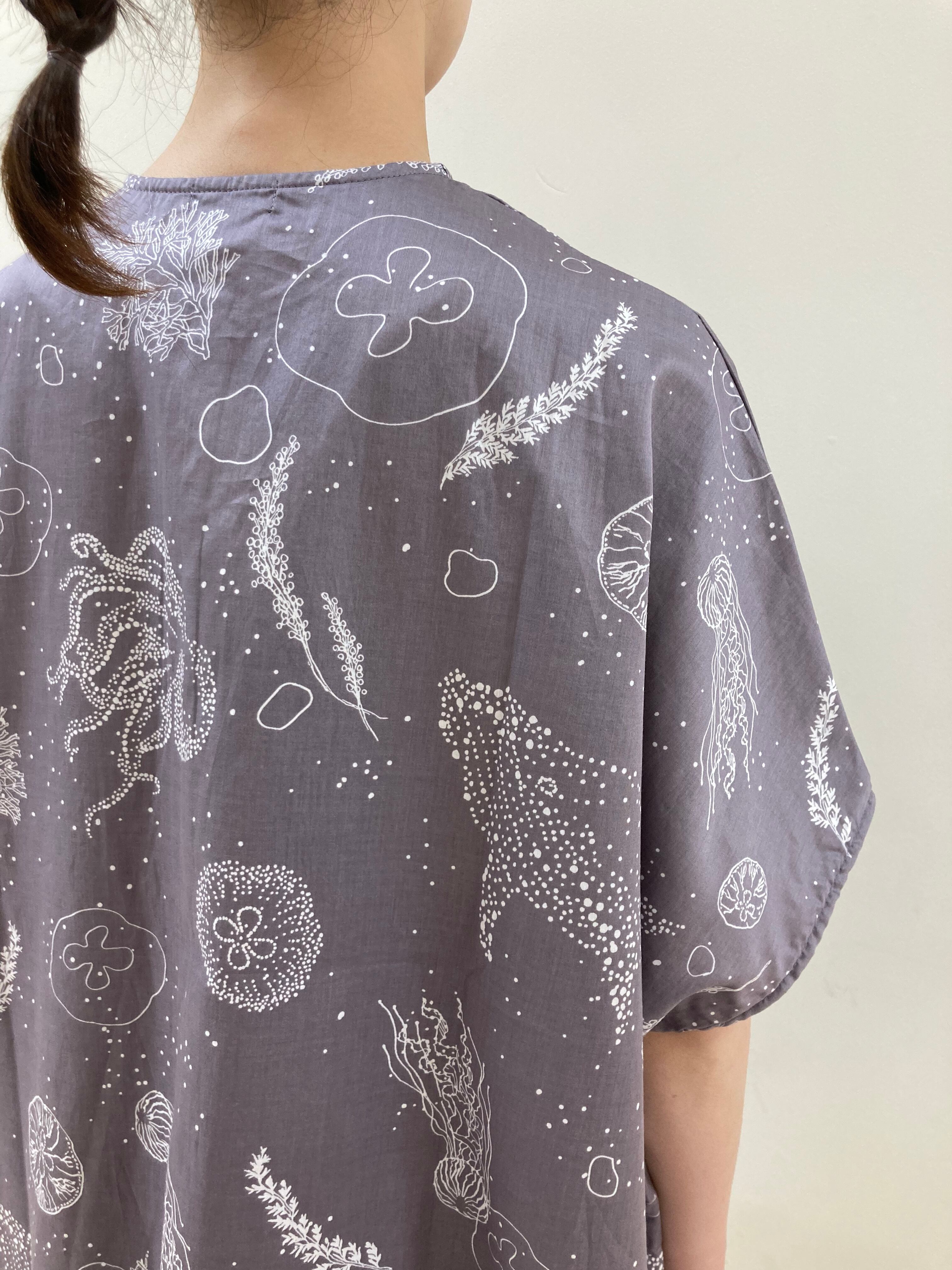 羽織りとしても楽しめる“ハオリ”ブラウス。ゆったりとした身幅と、二の腕が隠れる袖の長さが大人女子に嬉しい一枚です。リラックス感の中にサテン生地のツヤがアクセントとなり、カジュアルコーデからきれいめコーデまで多彩なシーンで活躍します海底の風景を描いたプリント。上品なツヤのあるコットンサテン生地に、細やかな線と点描で描かれたクジラやタコ、クラゲたちが幻想的なテキスタイルです。