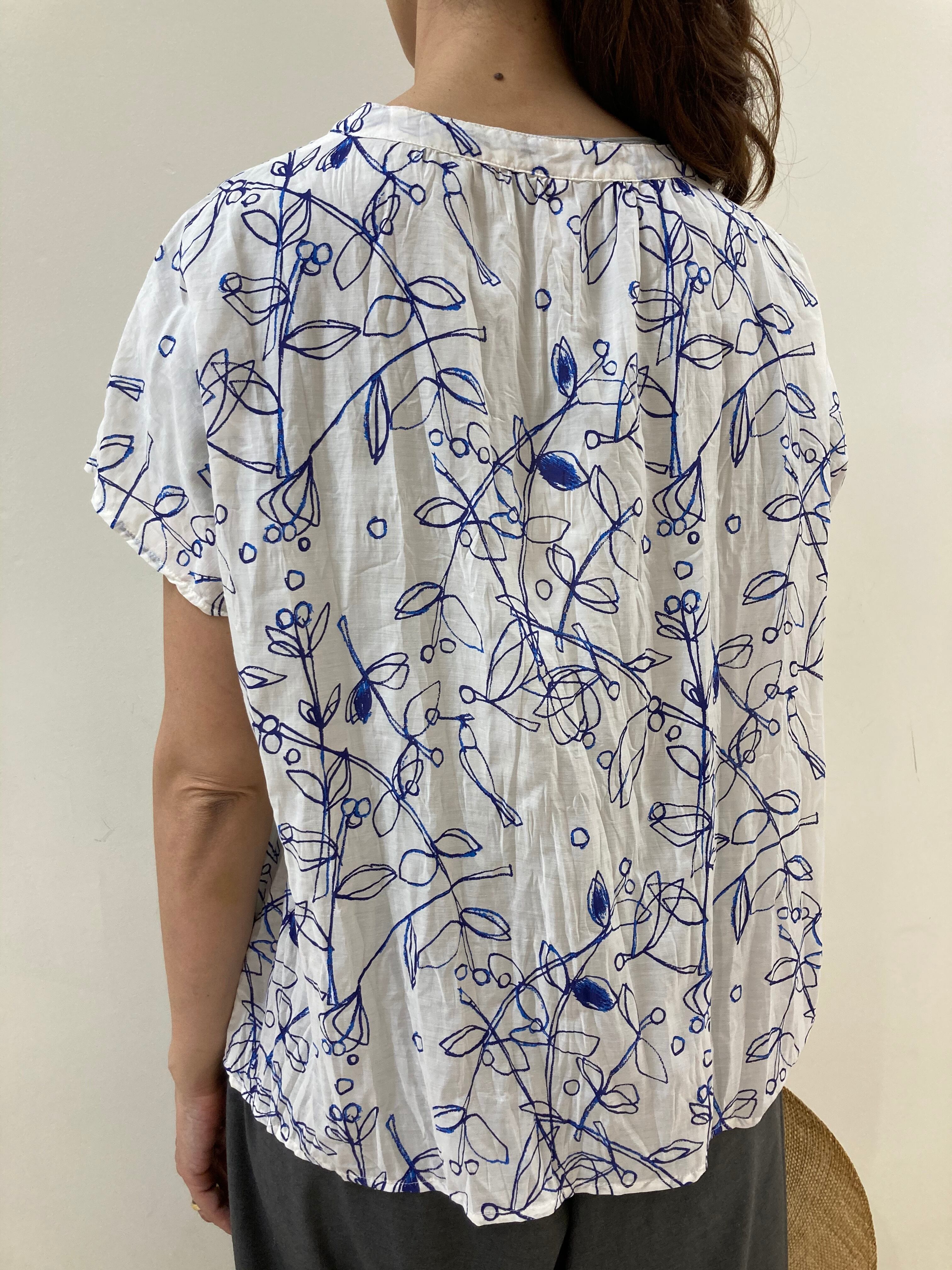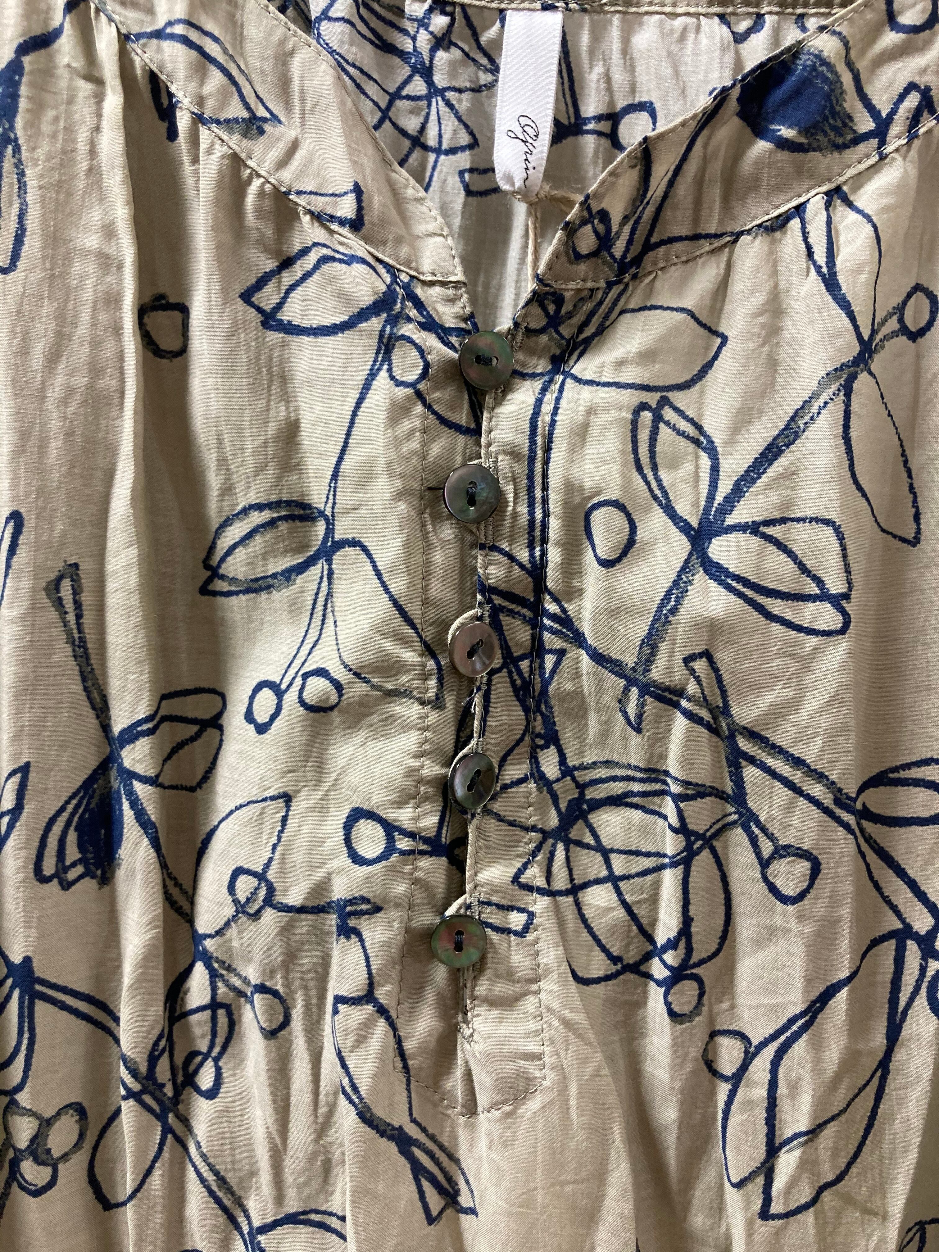 サラッとした肌触りのクリンクル加工したブラウス。伸び伸びした植物のイラストが描かれてます。お洗濯後に絞ってナチュラルなシワをつけて着ていただけます。透け感はややあります。スカートにもパンツにも合わせていただけます。